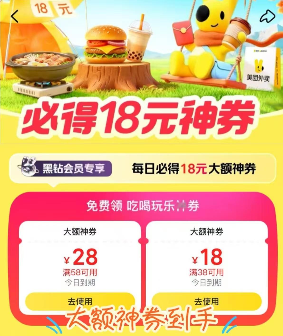 姐妹们,快!美团外卖这个羊毛必须薅!美团外卖又撒18元神券了 我黑金会员刚领了张“38-18”的券,算下来也太划算了...不知道点啥了都😂 这波11.11的外卖福利太给力,省下来的钱又能多买两片面膜了!就算不是黑金黑钻,也能天天领18元和五折券,等于每天都有小惊喜😊快去美团APP/美团外卖App“必得18”,领完再来告诉我你领了多少!