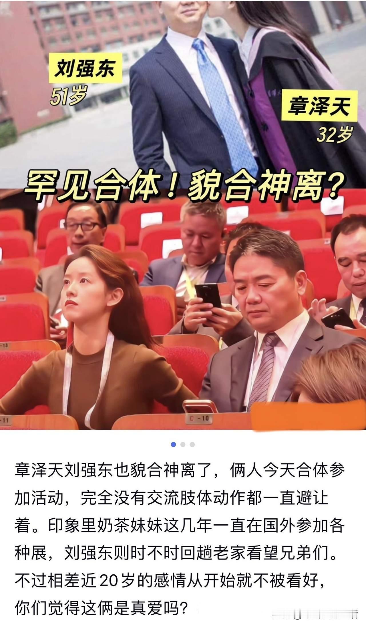 刘强东和章泽天最近在韩国同框,看着就有点不对劲——坐一块儿却隔得老远,全程没对视,刘强东不是玩手机就是发呆,章泽天身子还一直往旁边歪,明显不想靠近。有张照片更明显:刘强东刚往她那边靠一点,她立马往后缩,躲得可快了。其实也能理解,一个爱精致名媛范儿,一个还是接地气的“江湖大哥”,本来就不在一个频道上。现在估计就是各干各的:她带娃,他搞事业,感情淡了但利益还在,大概率不会离婚,就维持个表面体面吧。