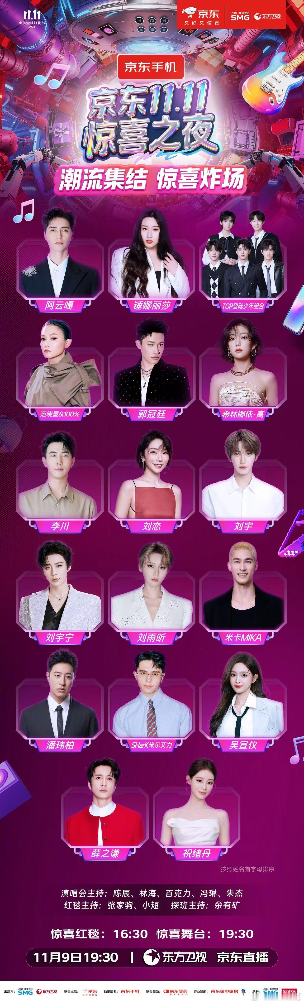 薛之谦潘玮柏加盟京东1111惊喜之夜双11惊喜再升级!确认加盟1111惊喜之夜,用音乐点燃这个双11。他们在舞台上的表现永远让人眼前一亮,无论是唱功还是舞台表现力,都堪称顶尖。这次会有什么特别的互动环节?11月9日19:30东方卫视直播,一起期待!1111惊喜之夜