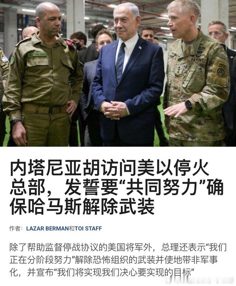 在前一天下令空袭加沙打死了几十名哈马斯武装分子和指挥官之后,内塔尼亚胡来到美国监控停火的指挥中心,双方确认停火继续有效,今后要进一步合作确保哈马斯解除武装,不能对加沙施加影响。海外新鲜事