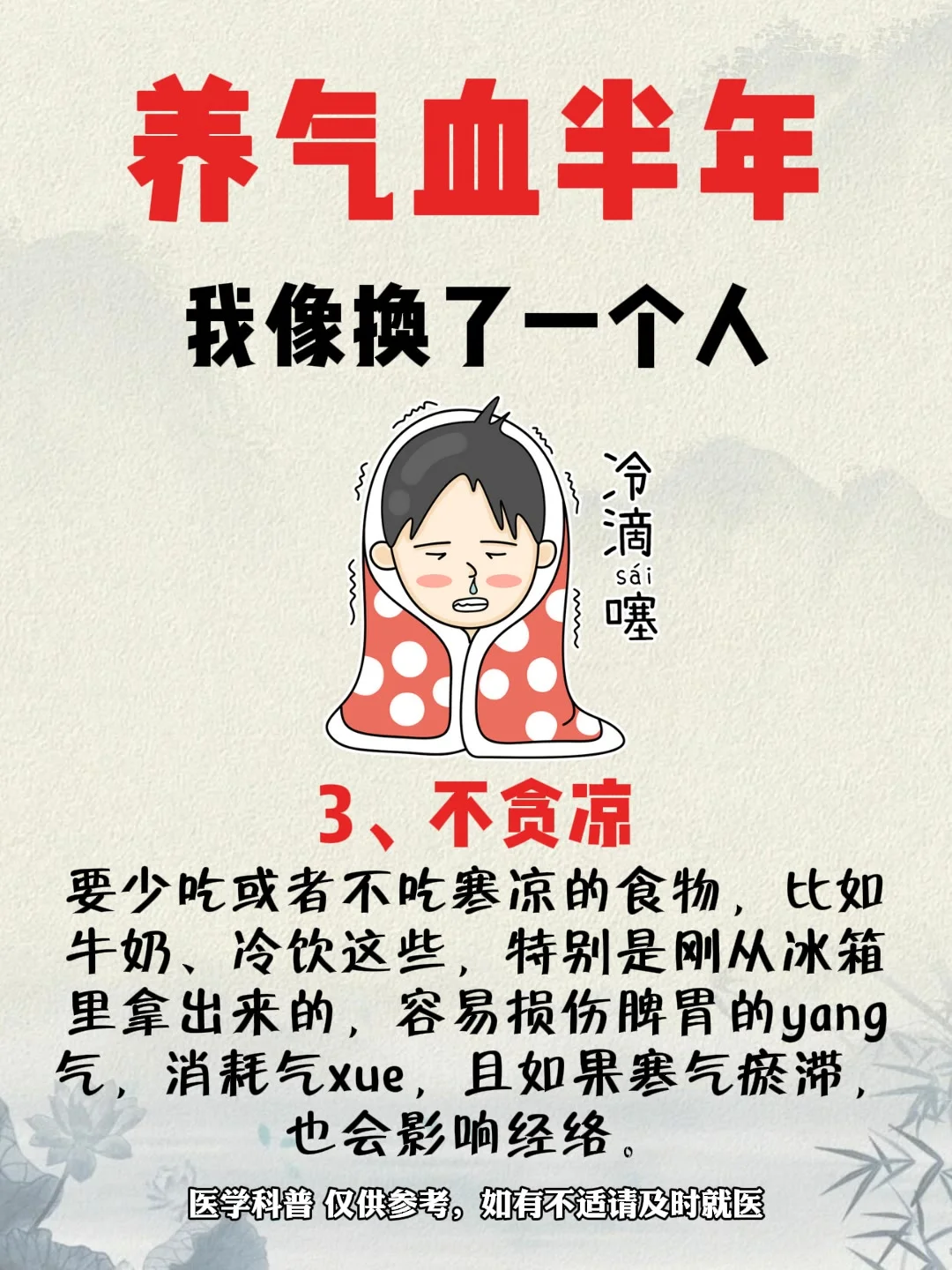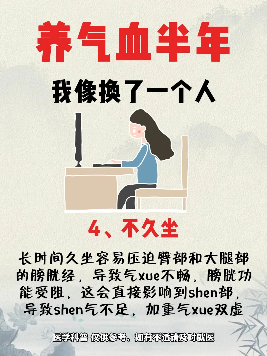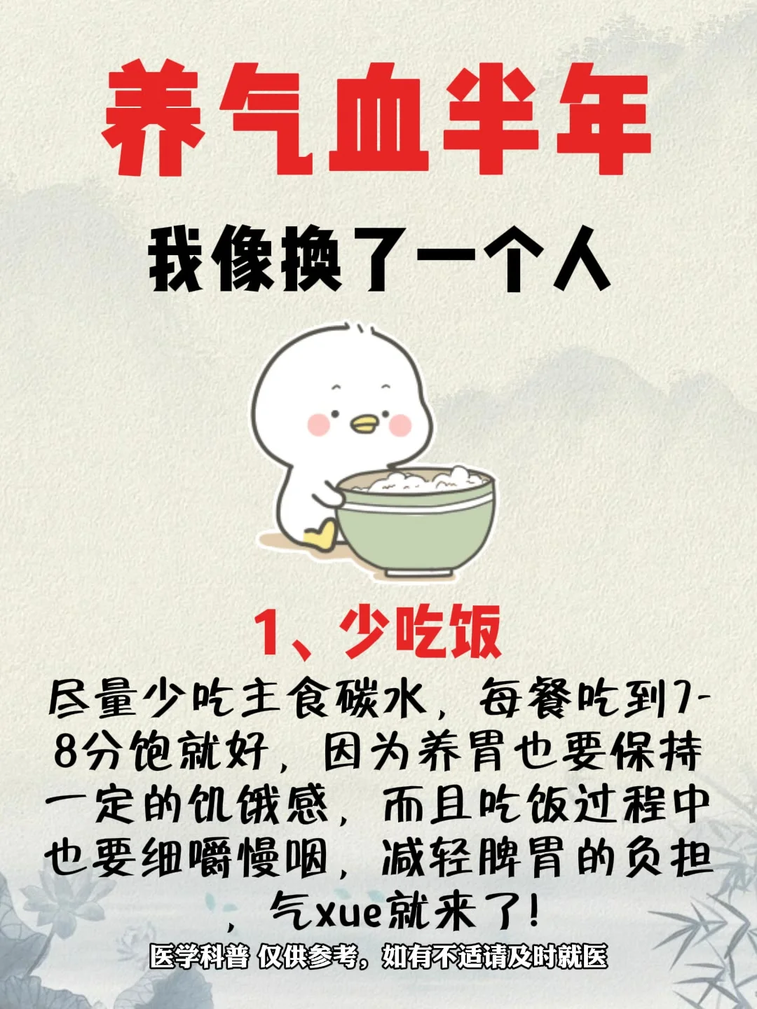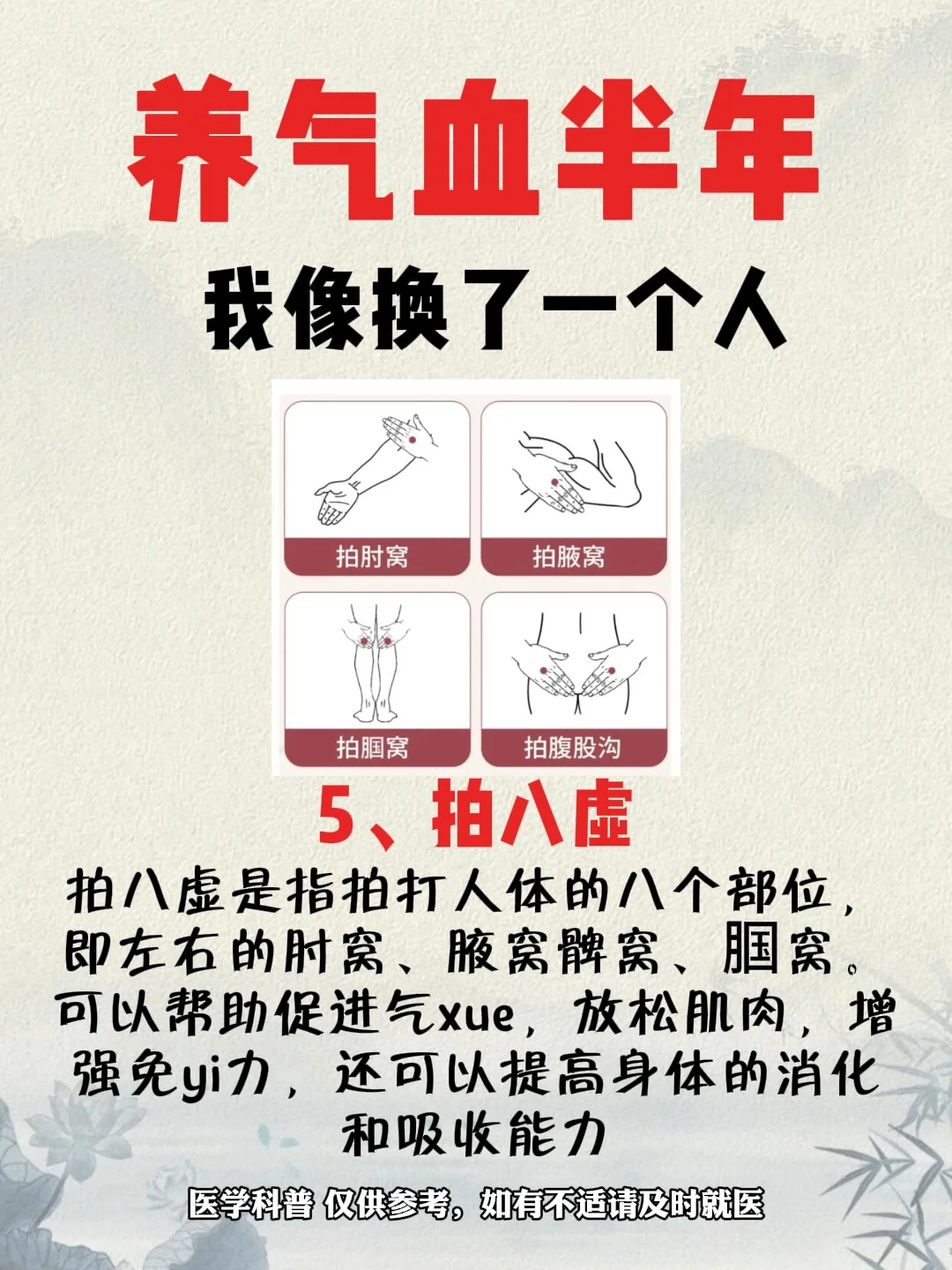 1.少吃饭 尽量少吃主食碳水,每餐吃到7-8分饱就好,因为养胃也要保持一定的饥饿感,而且吃饭过程中也要细嚼慢咽,减轻脾胃的负担气血就来了。 2.要早睡 千万不要熬夜,混乱作息会大大影响脾胃的运化,尤其是凌晨3点到5点,这是肺经当令的时间段,如果在这个时间点入睡容易导致气血不畅,最好是早睡早起。 3.不贪凉 要少吃或者不吃寒凉的食物,比如牛奶、冷饮这些,特别是刚从冰箱里拿出来的,容易损伤脾胃的阳气,消耗气血,且如果寒气瘀滞,也会影响经络。 4.不久坐 长时间久坐容易压迫臀部和大腿部的膀胱经,导致气血不畅,膀胱功能受阻,这会直接影响到肾部,导致肾气不足,加重气血双虚。 5.拍八虚 拍八虚是指拍打人体的8个部位,即左右的肘窝、腋窝、髀窝、腘窝。可以帮助促进气血,放松肌肉,增强免疫力,还可以提高身体的消化和吸收能力。