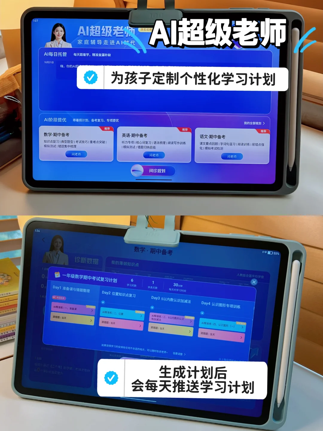 再加上他们的双师全托管模式,通过【AI超级老师】和【金牌辅导】的双师伴学,可以全程托管,家长一点都不用操心。AI老师还会根据孩子情况,每天布置学习任务,定制阶段提升计划。