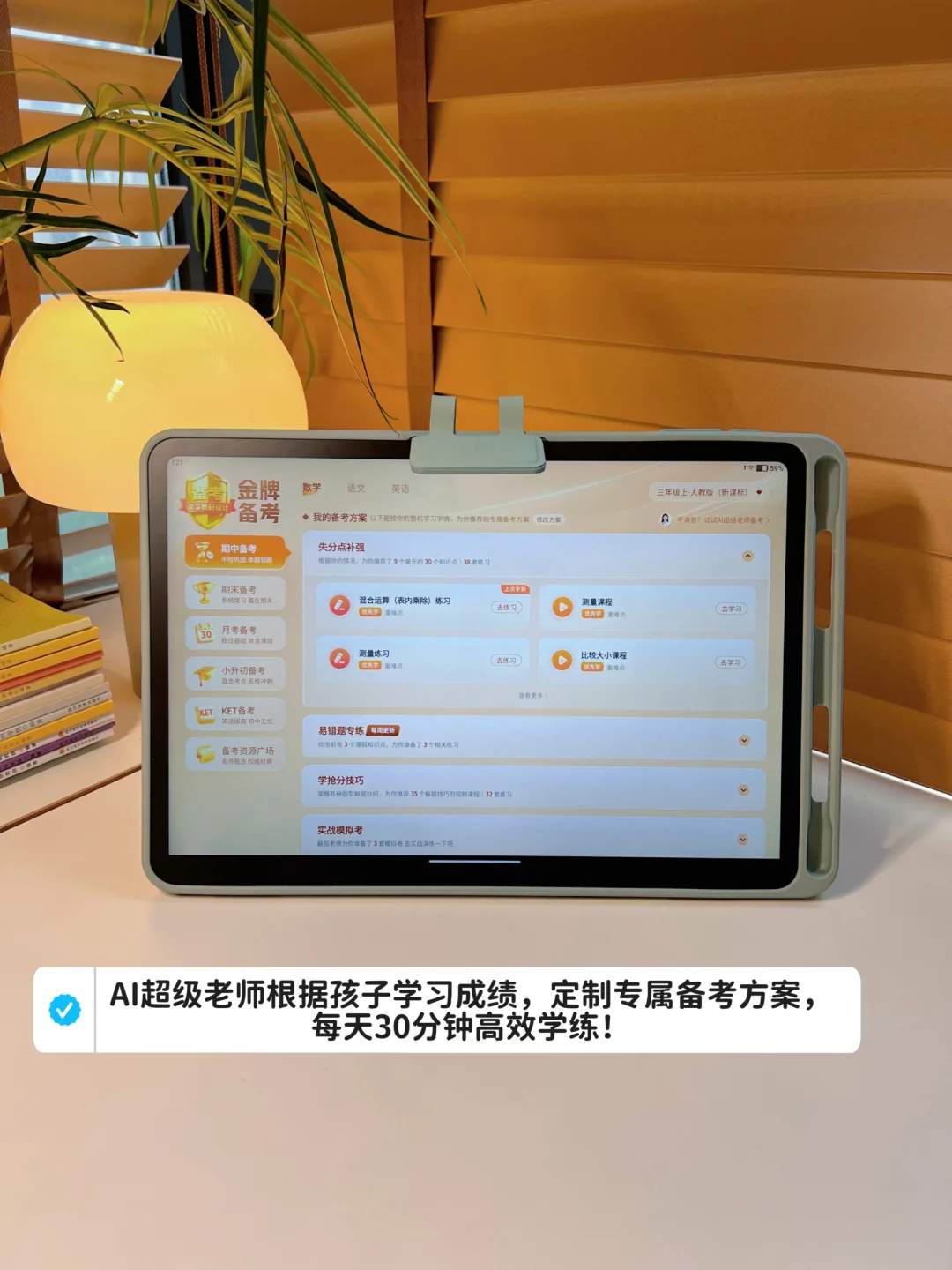 清楚了他的知识薄弱点后会根据孩子的情况自动生成一套学习方案,从失分点补强,易错题训练,抢分技巧学习,实战模拟练习,每天跟学半小时,就可以轻松应对各种大小考,妥妥的一整个省心!瞬间感到身心愉悦,让我有一种运筹帷幄的感觉