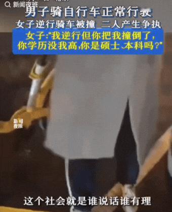 北京,一女子逆行骑车被撞后语出惊人,“我们家开宝马x5,不管逆不逆行,我学历比你高,我照样喜骑自行车”。网友:这理论绝了。 10月27日,一男子骑自行车正常行驶,与一逆行的女子发生了碰撞,两人随后发生了争执。 女:你以为你学历有多高呢,我学历比你高 男:高,太高了,高到逆行吗 女:我想逆行就逆行,但你把我撞倒了,我们家宝马x5告诉你,我照片样喜欢骑自行车 男:你这属于逆行,违反交通规则 女:我不管逆不逆行,把我撞倒了,我现在叫我老公过来,他就在这楼上,让服下来抽你,你以为你学历多高呢?我上211、985的时候,你还穿那个尿不湿呢。学历是为人民服务的,不是出来炫耀的。 真的是笑不活了,女子自己说学历是为人民服务的,不是出来炫耀的。却因为撞车一事,反复提及自己的学历。 视频上传到网络之后,也是引起了网友的热议。有网友说:考试只能过虑学渣,不能过虑人渣,这句话的含金量又在提高了。 也有网友调侃:短剧照进现实,我一直以为短剧都是瞎编的,没想到原来是根据现实改编的,真是误会编剧了。 也有网友提议:男子应该什么都不说,学学上一个案例,就说我听交警的。 不得不说,连小孩子都知道红灯停绿灯行,怎么有些成年人反而把最基础的交通规则抛在脑后。昨天我等红绿灯时,有些骑电动的人闯红灯,旁边一个大人带着的小孩拼命的喊他爸爸,“爸爸,你看前面的人闯红灯,爸爸,你看前面的人闯红灯”。 话说这撞车和学历有关吗?