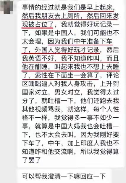 女子称上完厕所卧铺被外籍乘客占用,12306:无需妥协,可联系乘警! 这位女子说,因为他们也要下车了,索性就在下铺坐了一会。 其实大家遇到这种情况的时候,完全可以要求叫醒他离开铺位,在每个地方都要遵守每个地方的规定。 如果大家遇到类似的情况,可以直接找相关的乘警进行解决,随着外国游客越来越多,以后大家肯定也会遇到越来越多类似的情况,最好的办法就是找相关工作人员。 各位是怎么看的?欢迎评论区留言。
