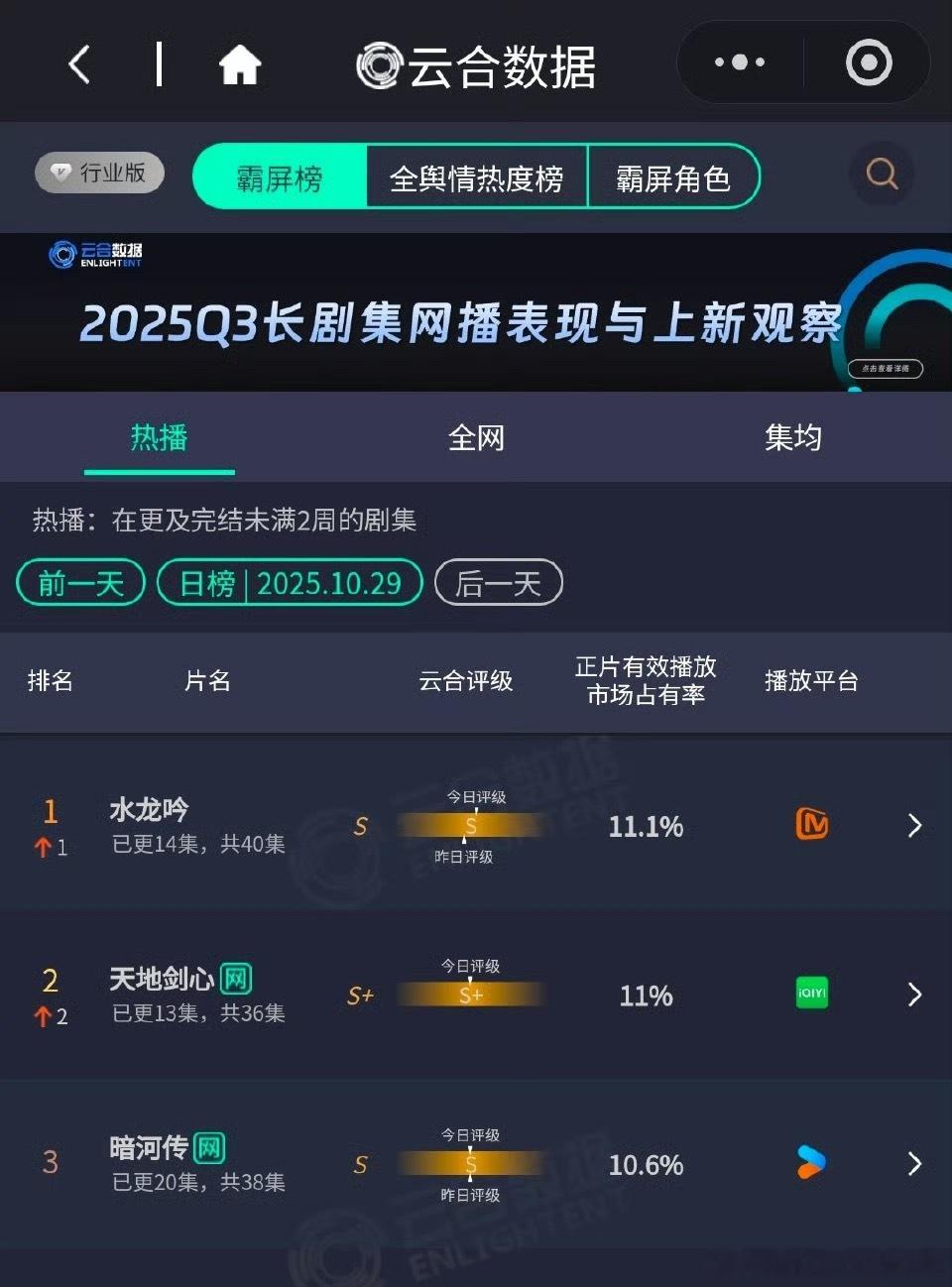 29日云合来了,11%就登顶:水龙吟11.1%,天地剑心11%,暗河传10.6%