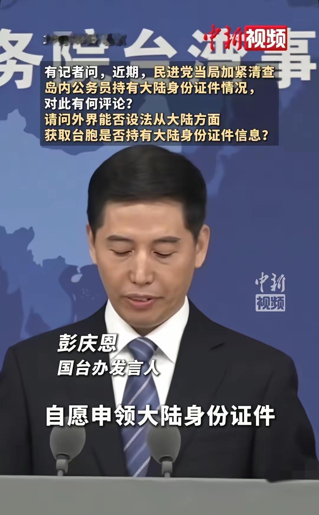 台湾急了!台湾急了! 国台办发言人最新发言: 台湾居民自愿申领大陆身份证,使其享有合法的权利。我要再次强调,台胞申领大陆各类证件情况及证件信息,受到有关部门严格保护,外界无法获取! 民进党放着民生不管,经济、能源问题一堆不解决,反倒盯着同胞的证件瞎折腾,难怪台湾网友吐槽“搞对立倒是No.1”。 其实他们怕的不是什么“安全问题”,是怕越来越多台胞感受到大陆的善意和便利,戳破他们的分裂谎言。两岸本是一家人,交流走近是民心所向,靠恐吓阻挠根本没用。 你们觉得民进党这波操作能拦住两岸交流吗?身边有台胞分享过申领大陆证件的便利吗?来评论区聊聊!