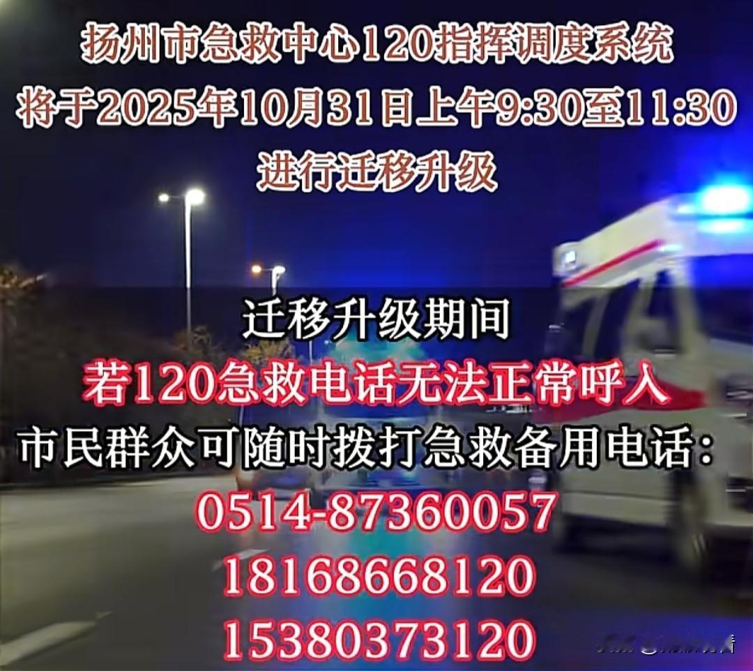 扬州人紧急提醒!120热线升级,备用电话速存📞 扬州的宝子们注意啦!这条关乎生命安全的通知,一定要看完转发给家人! 扬州市急救中心120指挥调度系统要迁移升级了,时间是2025年10月31日上午9:30到11:30。划重点!升级这俩小时里,如果120打不通千万别慌,这三个备用电话赶紧存手机里,最好设个快捷拨号: 0514-87360057 18168668120 15380373120 紧急情况拨打时,一定冷静说清具体地址、联系电话和患者症状,等调度员确认再挂电话,也可以安排人在路口接应救护车,提前备好病历、医保卡更省心。 这种关键信息真的不能漏!赶紧转发给家里老人和身边朋友,有备无患才安心!