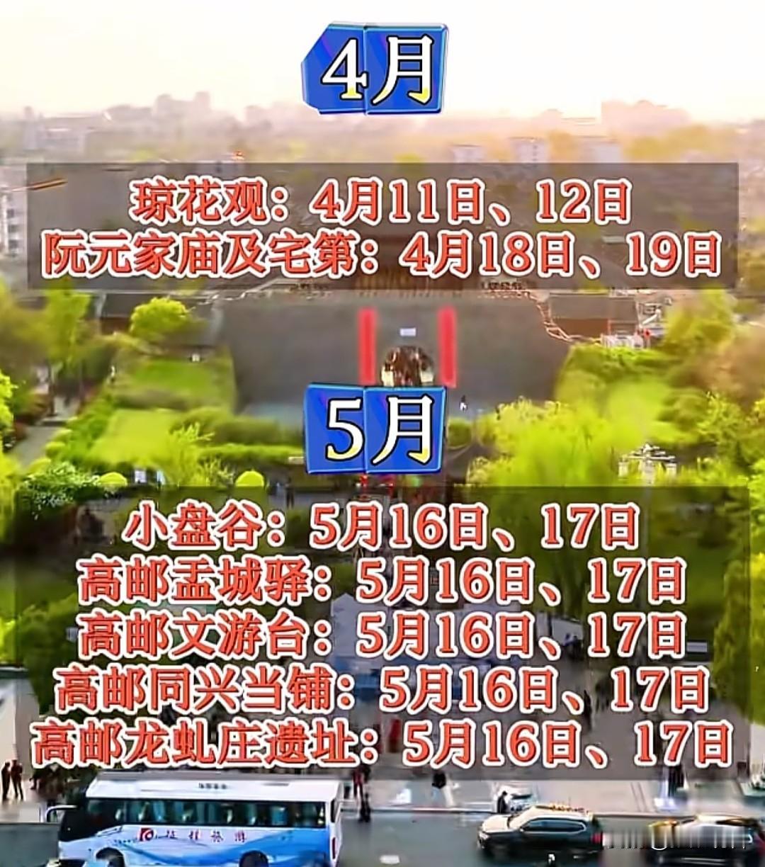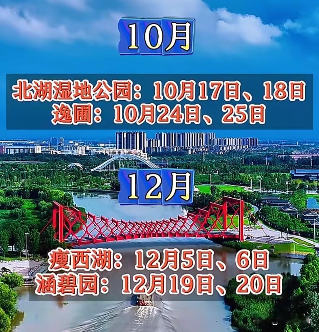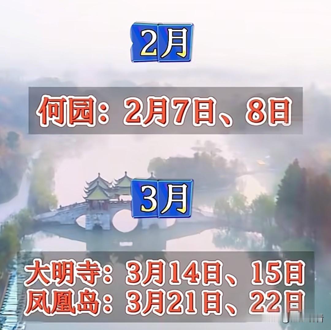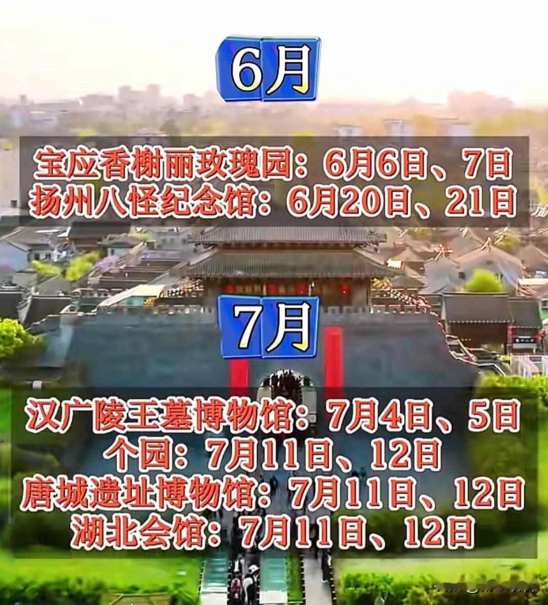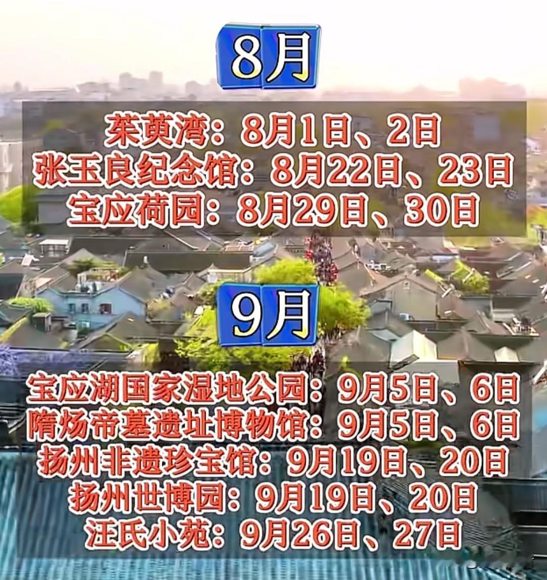 收藏!2026年扬州景区免费开放日时间表📅 扬州2026年景区免费开放日新鲜出炉啦!全年每月都有景区免费开放,赶紧码住,安排你的扬州之旅吧! 免费开放日 部分景区 2月 7日、8日 何园 3月 14日、15日 21日、22日 大明寺、凤凰岛 4月 11日、12日 18日、19日 琼花观、阮元家庙及宅第 5月 16日、17日 小盘谷、高邮盂城驿、高邮文游台、高邮龙虬庄遗址 6月 6日、7日 20日、21日 宝应香榭丽玫瑰园、扬州八怪纪念馆 7月 4日、5日 11日、12日 汉广陵王墓博物馆、个园、唐城遗址博物馆、湖北会馆 8月 22日、23日 29日、30日 张玉良纪念馆、宝应荷园 9月 5日、6日 19日、20日 26日、27日 宝应湖国家湿地公园、隋炀帝墓遗址博物馆、扬州非遗珍宝馆、扬州世博园、汪氏小苑 10月 17日、18日 北湖湿地公园 📢免费开放日活动主要利用非节假日的双休日进行,具体以各景区实际公告为准哦~记得提前规划好行程,避开人流高峰,享受免费游扬州的快乐!