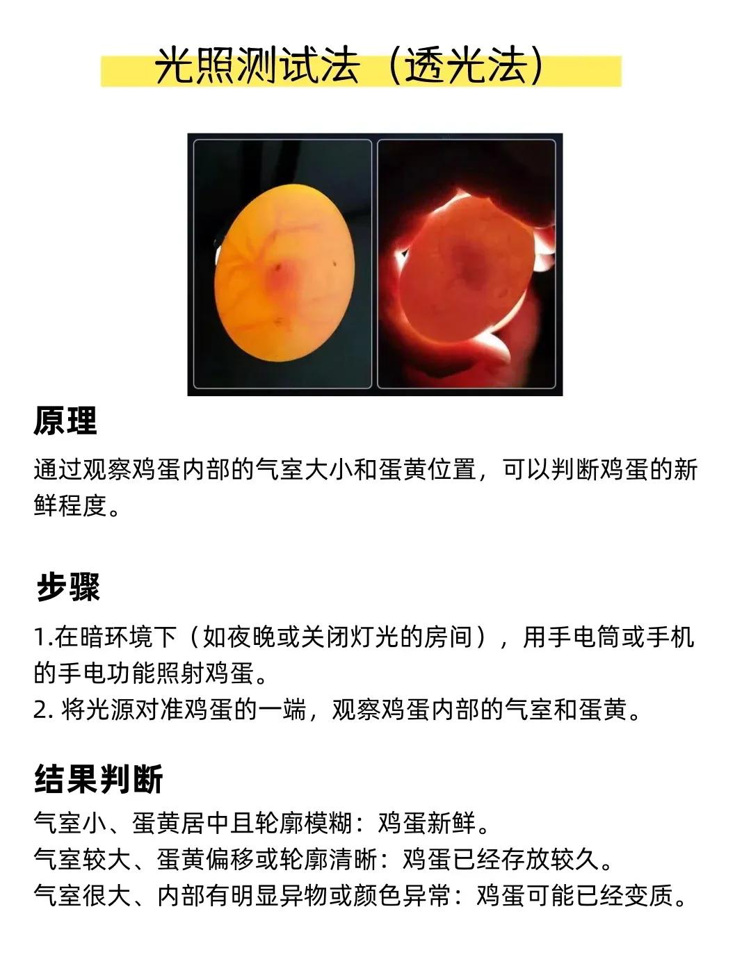 购买鸡蛋时,如何辨别是否新鲜? 新鲜鸡蛋表面粗糙有磨砂感(因有一层天然白霜),不新鲜的光滑发亮。 掂重量:同样大小的蛋,新鲜的更沉甸甸。 将鸡蛋轻摇贴近耳侧,无声或声音实为新鲜;有水声或空洞响说明已变质。 若鸡蛋已开封: 观察蛋黄蛋白:新鲜蛋黄饱满圆润,蛋白浓稠分层(有白色系带);散黄、蛋白平铺或有异味(如硫臭味)说明变质。 煮熟后检查:气室过大或蛋黄偏移到边缘的蛋不新鲜。鸡蛋辨别方法 鸡蛋鉴别 选鸡蛋方法