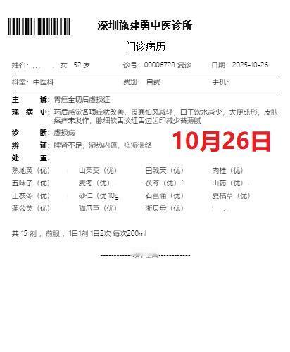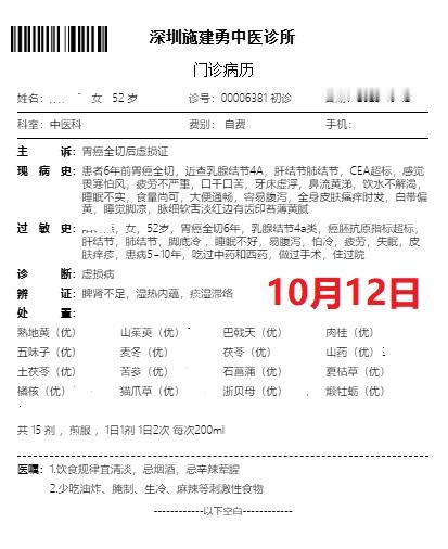 家住惠州的52岁女患者,六年前做了胃癌全切手术,最近又查出了乳腺结节,并且还是4A级的,除此之外还有肝结节和肺结节,癌胚抗原也严重超标。患者在朋友推荐下抱着试试看的态度吃了15天中药,没想到复诊时癌胚抗原竟然从7.59降到了6.6,腹泻、怕冷、疲劳等不适症状都有明显好转。