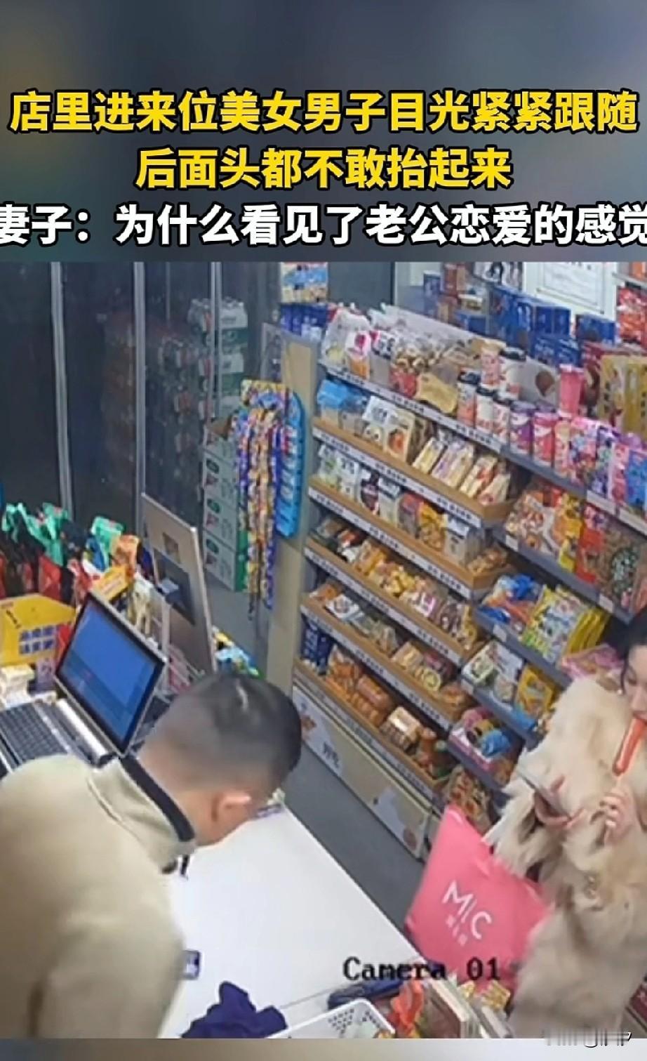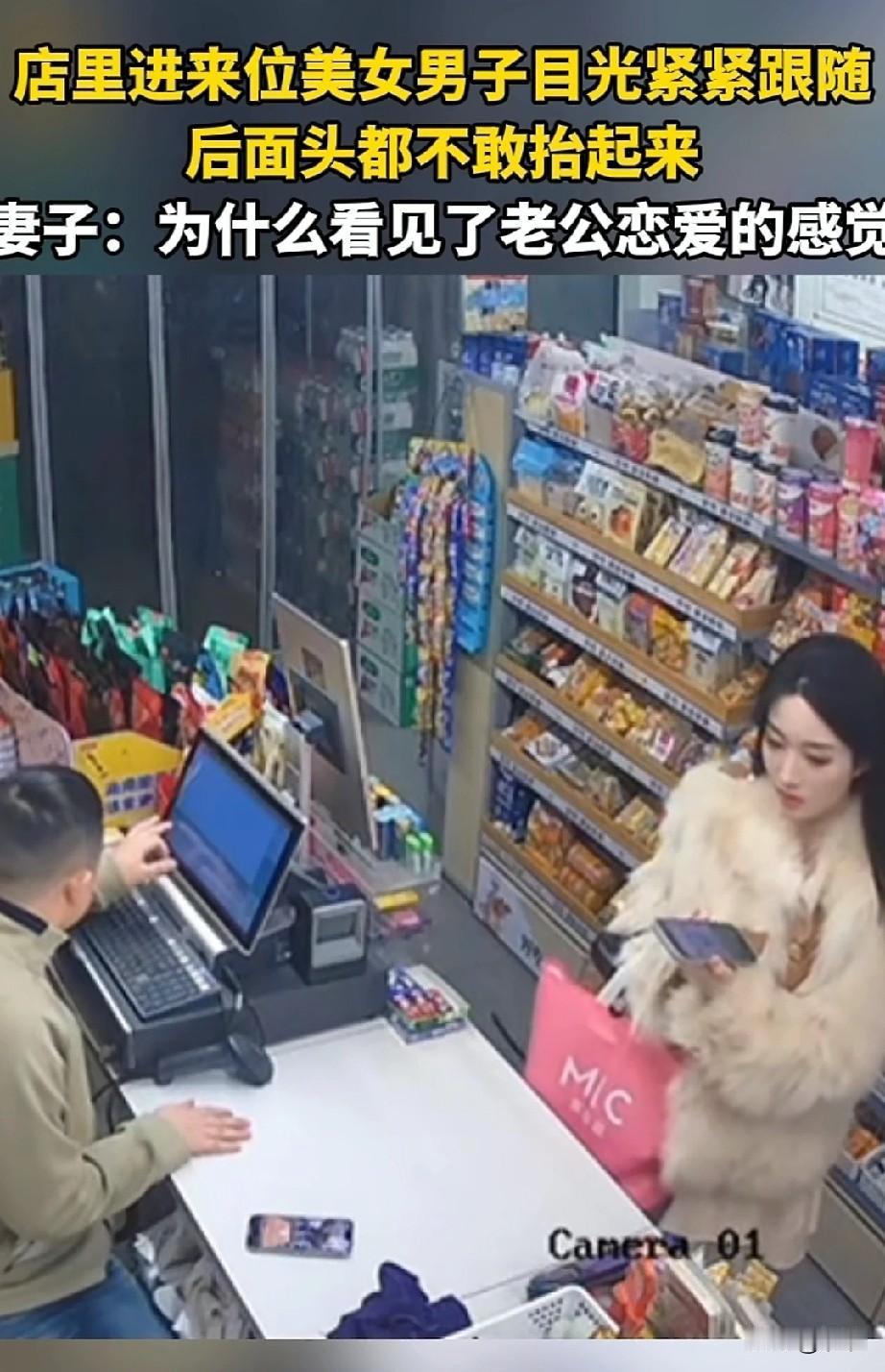男子便利店来了一位美女买东西, 他的表情都亮了, 从人家开门进来, 眼睛仅仅跟随都没有离开过, 窈窕淑女君子好逑, 以为自己做的天衣无缝, 殊不知她的媳妇正在看监控, 进门看得贼起劲, 人家拿东西他也是紧紧盯着, 人家掏出手机付钱来了, 男子害羞的不敢看人家, 全程低头服务, 这段简直可以纳入北影教材了, 有贼心没贼胆被他演绎的淋漓尽致, 随后美女又买了一根烤肠, 站在那里吃了一口烤肠, 店主看到直接害羞起来了, 看来是心中早就小鹿乱撞了, 这回家搓衣板是跑不了了, 他的妻子看到监控表示, 为什么看到了老公恋爱的感觉, 心里盘算着如何家法伺候! 大家对于男店主看到小姐姐来买东西居然害羞怎么看? 一起聊聊爱情 婚姻与家庭 便利店新鲜事 便利店美女 店门口美女