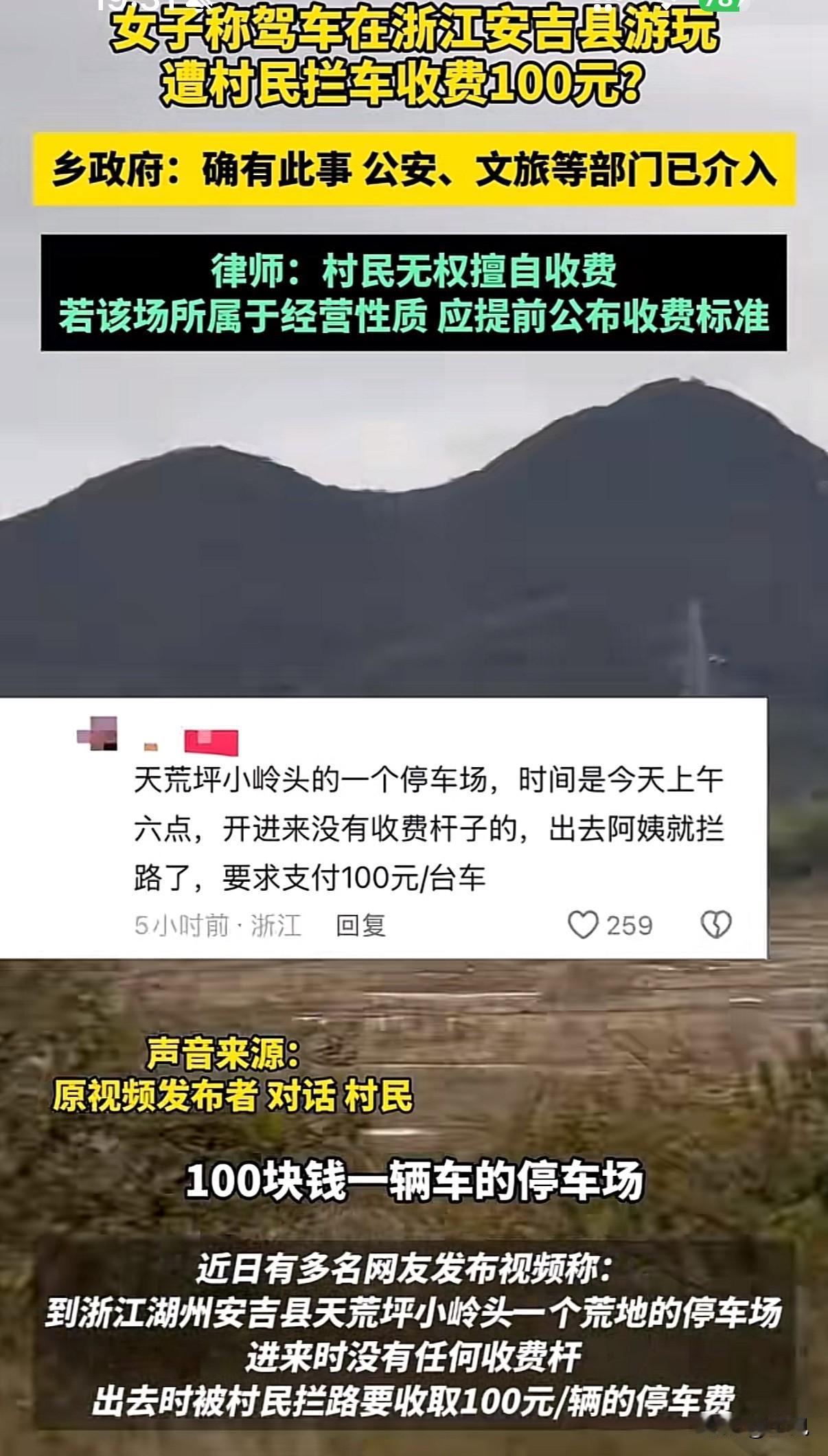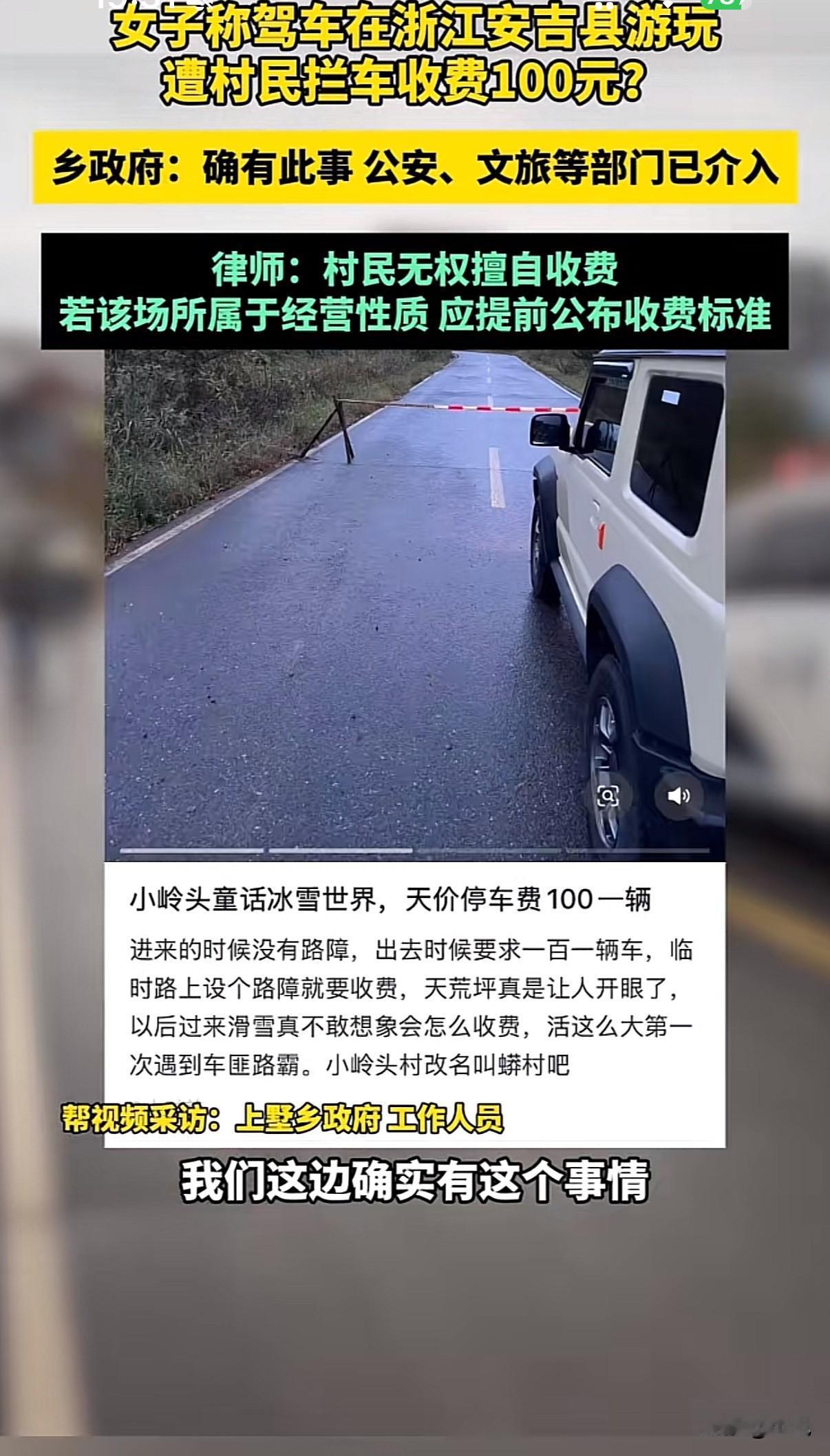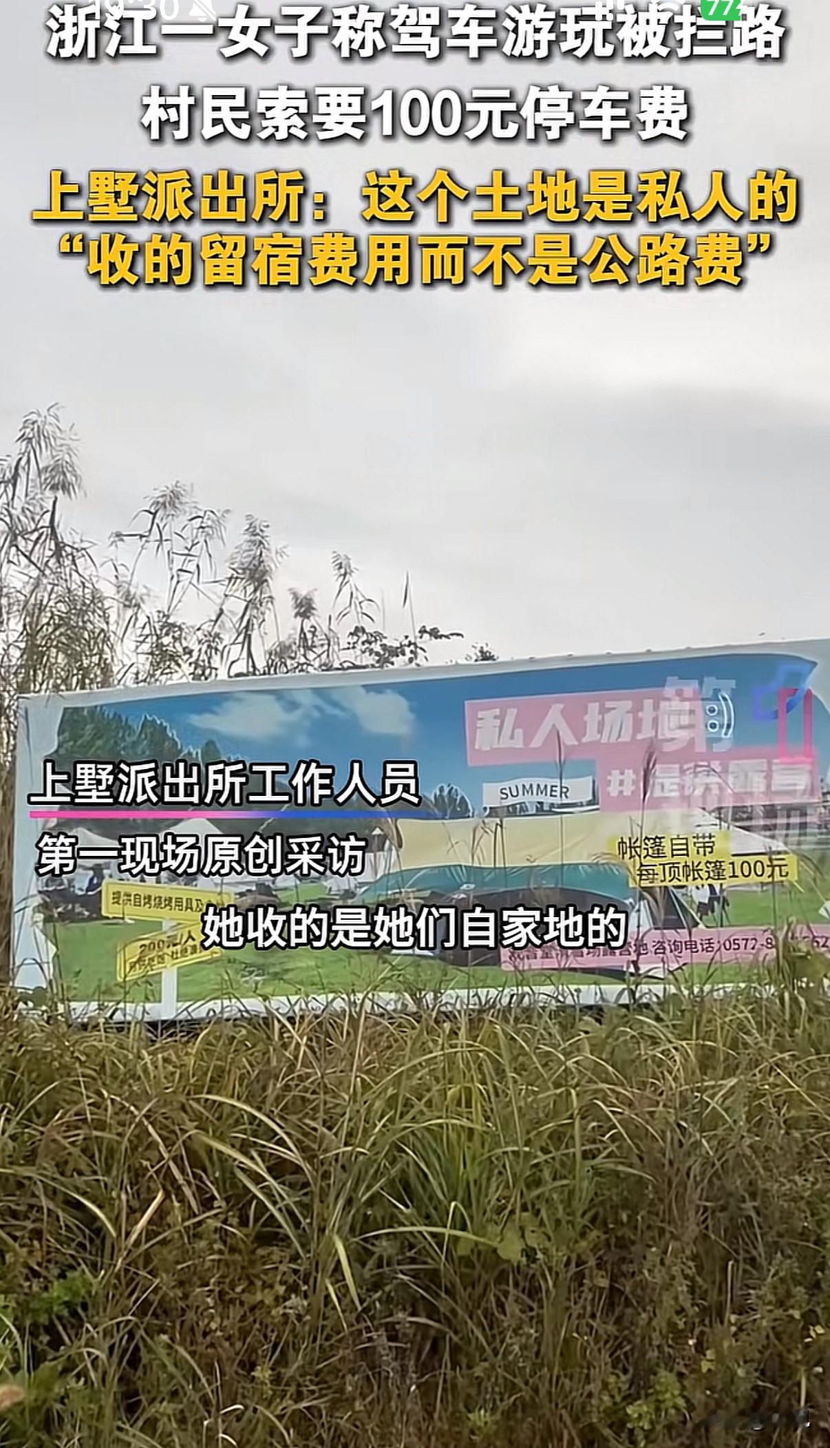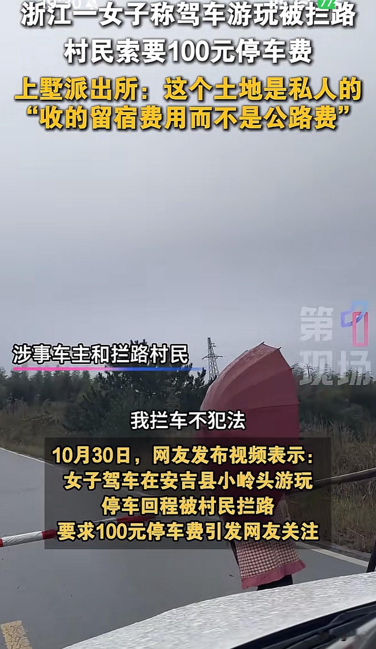 “此路要钱”!自驾游被村民拦路收100元。 事情发生在湖州安吉。一位女游客开车到小岭头玩,返程时被村民拦下要钱。游客很困惑:进来时没任何收费提示,自己也没搭帐篷露营,这钱收得没道理。 双方僵持不下,最后报警处理。经警方调解,游客支付50元后离开。 警方解释,村民收的是“土地留宿费”,不是过路费。已要求村民在相关区域设立明显标识。镇政府也表示,未提前告知的收费确实存在争议。 类似情况不少地方都有。江西某古镇曾因突然收费,导致游客减少,当地村民反而在社交平台教游客“绕路”。 旅游开发与村民利益的平衡是个现实问题。浙江南浔古镇提供了另一种思路——不收大门票,靠住宿、餐饮等二次消费盈利。游客量反而增加,商家收入也更有保障。 个人随意收费肯定不妥,但这也反映出部分地区旅游发展模式可以优化。完善的提示机制、合理的收益分配,能让游客玩得明白,村民得到实惠。 旅游这盘棋,得大家一起下才活。透明、公平的规则才是长久之计。