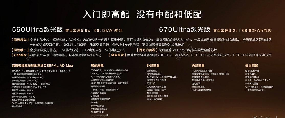 670Ultra激光版14.99万,续航猛冲670km,动力智能配置一脉相承,长途出行焦虑直接清零。560Ultra+激光版15.19万,磁流变悬架(限时送)+零重力座椅(14向调节+8点按摩)+后排通风加热+电动尾翼+18扬天空声场+19寸马牌轮毂,豪华配置堆到“溢出”。