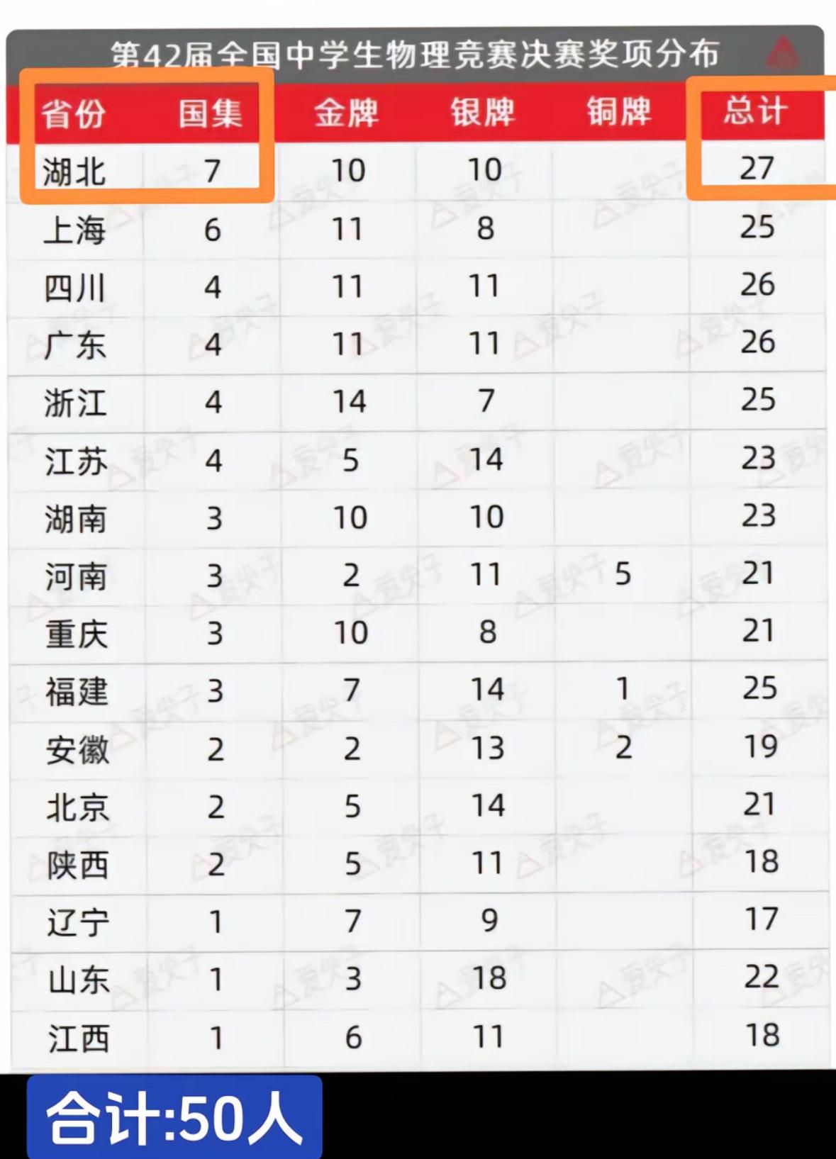 湖北7人拿下全国第一 第42届全国中学生物理竞赛 国家集训队50人分布! 这么多年了,虽然大城市一直挖走那么多湖北的老师校长,可湖北依然还是那么强劲儿,一直很厉害,人才挖不完,湖北唯一落后江苏浙江是经济,导致人才留不住!惟楚有材,湖北别的资源不占优势,但教育全国领先,湖北学子们加油。