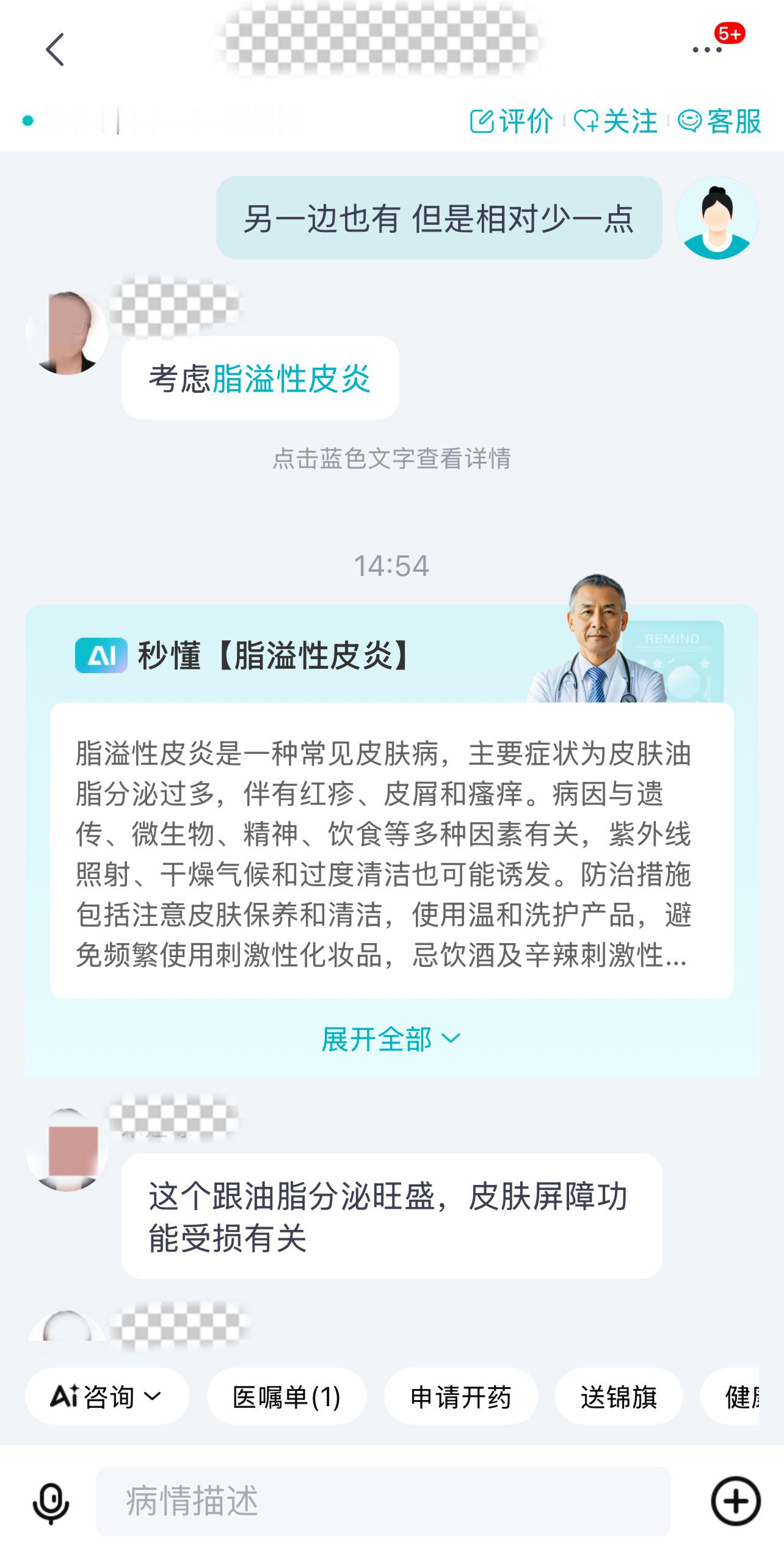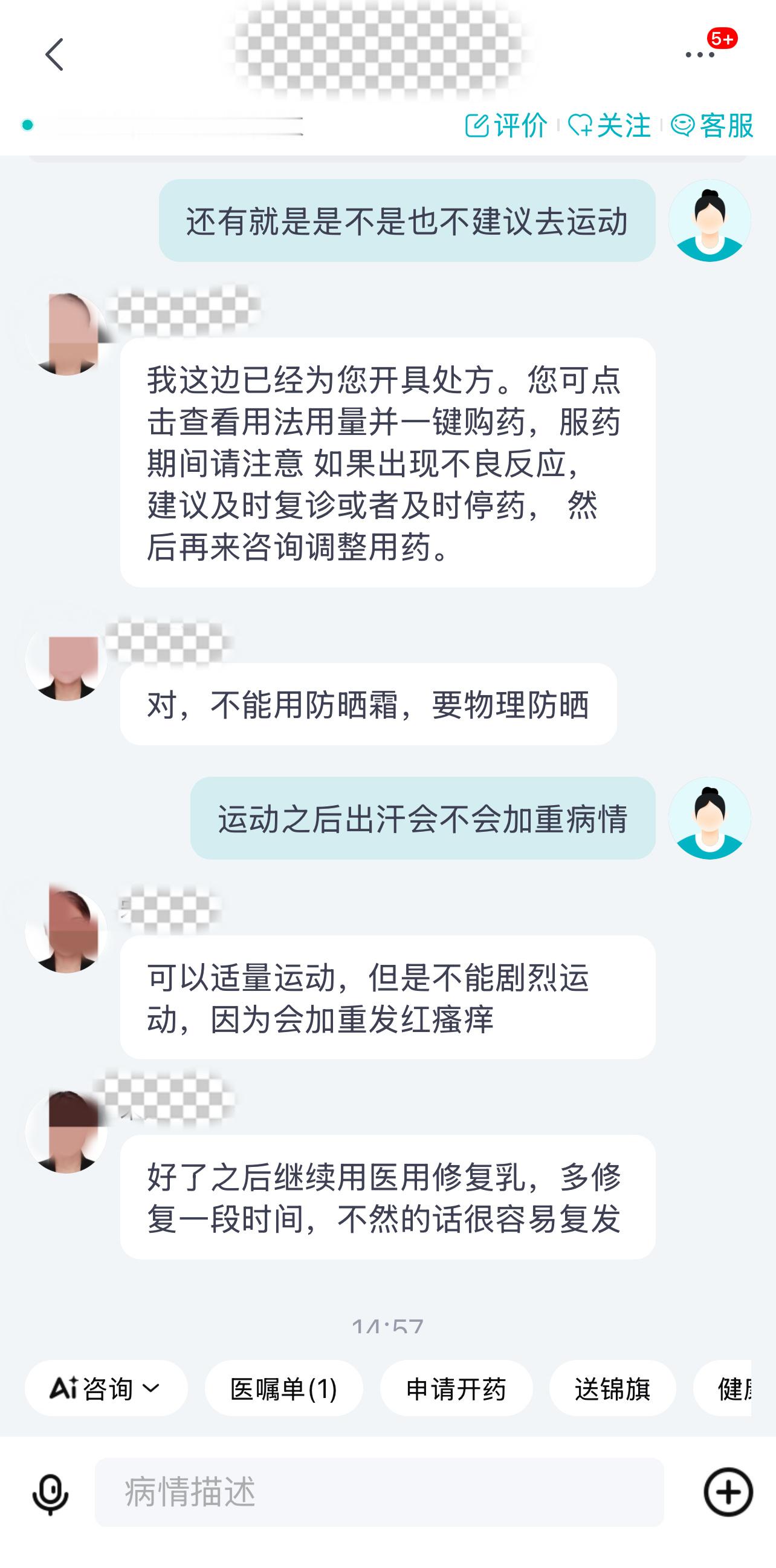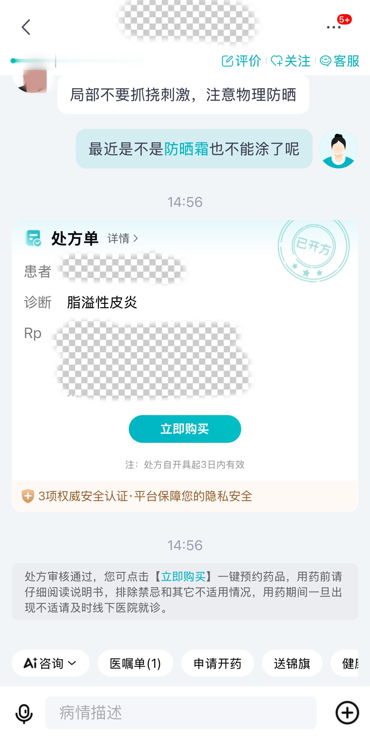 之前有粉丝投稿就是这样,网上攻略自行买药膏涂,结果脸越涂越红,痒到整晚睡不着,好在及时在京东互联网医院皮肤医院线上问诊后得到缓解。她说问诊很方便,直接在京东app搜“皮肤医院”就行。医生接诊速度很快又特别专业,在详细查看照片后判断是脂溢性皮炎,并且做了详细科普是由皮肤屏障受损所致,建议停止使用化妆品和洗面奶,用物理防晒取代防晒霜,最后给到了详细的用药建议。在按照医生建议使用药物后没多久,她说皮炎得到了明显缓解。