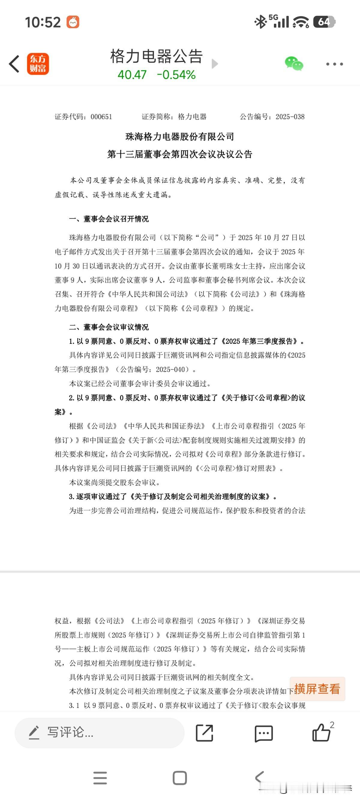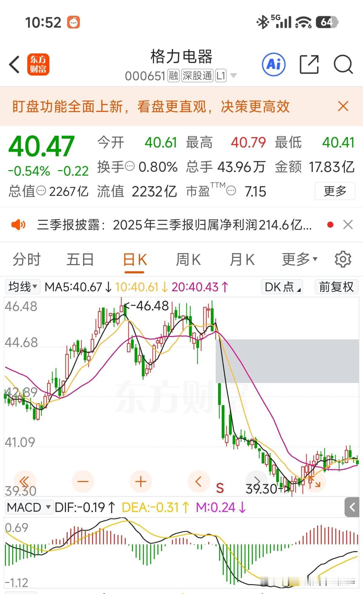 三季报继续拉胯,营收1377亿,同比下滑6.62%,归母净利214.6亿同比下滑2.27%,另外跟半年报不同的事,管理层明明知道业绩不好,看着投资者送给ICU,这次出了个中期每股一元的分红! 其他看点,经营现金流同比增长近260%,股东人数大增10万,对比起隔壁友商美的集团、海尔智家等,三季报找不出乐观点,但是看看当前8倍不到的市盈率,7%股息率的估值,心里也就踏实了,详细财报等有空再发文到gz号!