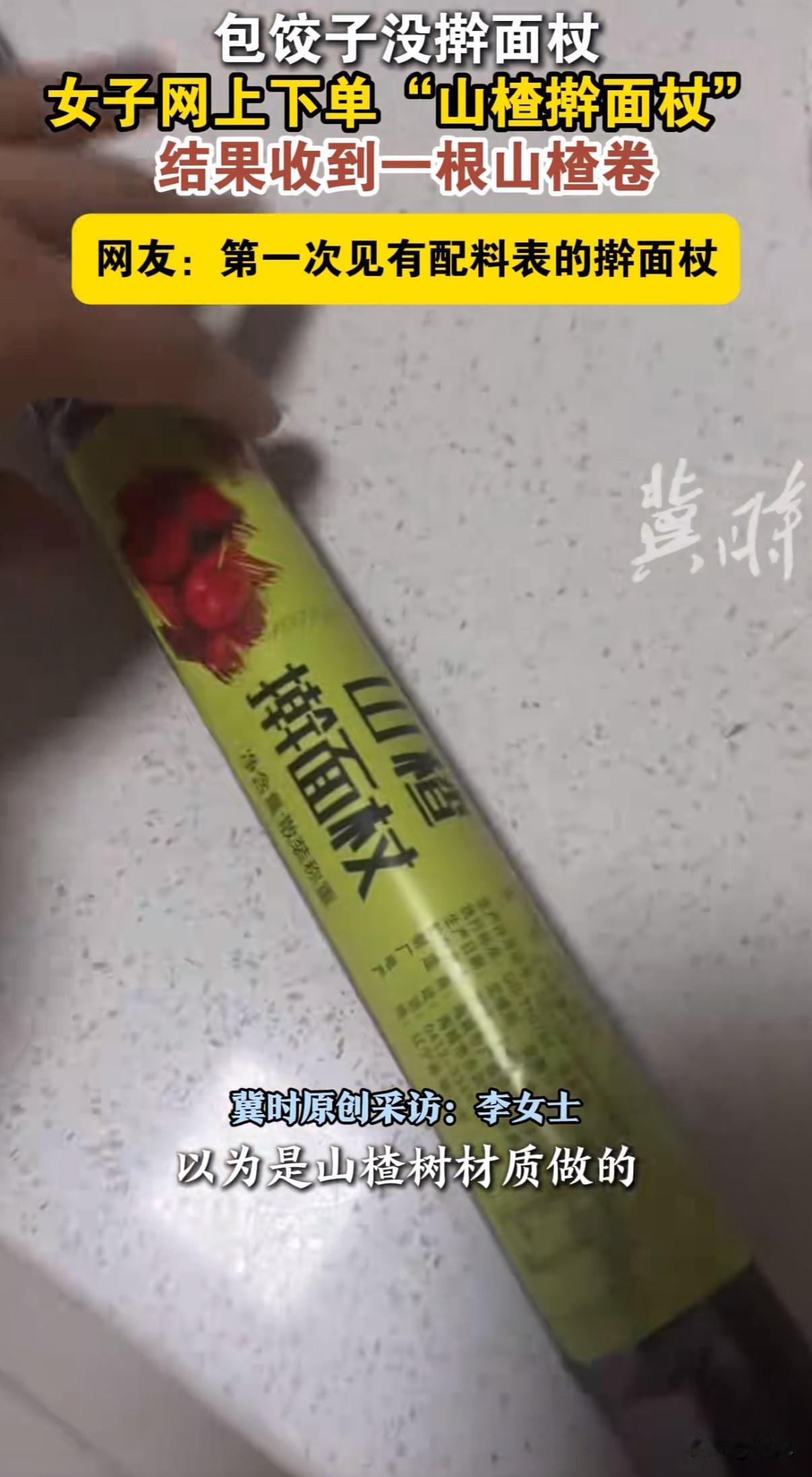 笑不活了!山东一女子包饺子缺擀面杖,网购居然收到根山楂卷,这“擀面杖”啃一口酸爽带劲,真是干饭人做饭的离谱操作! 据后浪视频报道,10月29日山东这位女子,心血来潮想包饺子,发现家里没擀面杖,就上网买了一根。结果到货一看,懵了——这哪是擀面杖,明明是一根山楂卷,外形做得跟擀面杖一模一样,被她戏称为“山楂擀面杖”。原来她买的时候没仔细看,标题里的“山楂”俩字直接忽略了,以为就是普通擀面杖,这误会闹的,饺子没擀成先得了个能吃的“擀面杖”。 网友们看完乐疯了,有人说“擀完面皮还能啃一口,开胃又解腻,这波不亏”,还有人调侃“第一次见擀面杖带配料表的,主打一个多功能”。 说实话,这种网购乌龙挺有意思的。生活里偶尔来这么一下,给平淡的日子添点乐子。你说这女子要是真拿它擀面皮,那饺子皮不得带着山楂味?不过换个角度想,这商家也是会玩,把山楂卷做得这么“实用”,也是脑洞大开。 你们网购遇到过啥离谱乌龙?来聊聊,让大家乐呵乐呵~