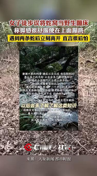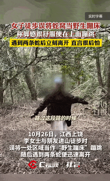 “无知的可怕!”10月26日,江西上饶,一女孩和自己的朋友进山徒步,谁知脚下的地面突然变得松软无比,就像是一个“天然蹦床”一般,女孩觉得很神奇便在上面蹦来蹦去,网友看到这一幕吓傻眼:这可是蛇窝! 江西上饶的李女士最近在社交平台分享了一段山中徒步的视频,没想到引来一片惊呼。视频里,她在一处落叶堆积的地面上蹦跳,觉得脚感松软有弹性,像踩在海绵上,拍完视频后不久,她在附近看到了两条蛇,这才意识到不对劲。 回到家发了视频,评论区炸了锅,有位常年在山区工作的护林员留言说,这种松软下陷的落叶堆很可能就是蛇窝,特别是在温暖季节,蛇类会选择这样的地方产卵或冬眠,还有人提醒她运气好没被咬,山里信号差,要是真出了事,救援根本来不及。 李女士这才后怕起来,她说当时和朋友徒步了快三个小时,看到那片地面觉得挺特别,就上去玩了一会儿,发现蛇之后她们立刻离开,但因为山路难走加上没信号,又花了一个半小时才出来,现在想想,如果当时踩塌了蛇窝或者被咬,后果不堪设想。 其实很多人对野外的危险认识不足,在城市长大的年轻人,平时接触最多的“野生动物”可能就是小区里的流浪猫,突然到了山里,看到新奇的东西就想凑近看看、摸摸,完全没意识到潜在风险。 蛇窝通常会选择隐蔽温暖的地方,落叶堆、石头缝、枯木洞都是常见位置。 “这姑娘真是命大!在蛇窝上蹦迪居然能全身而退,祖宗十八代积德了吧!” 有网友调侃说:“这哪是徒步,简直是给蛇族表演蹦床助兴啊!”不过笑归笑,后怕也是真的——评论区有人指出,那软绵绵的“蹦床”很可能是眼镜王蛇的巢穴,下面藏着的蛇蛋和蛇群规模可能上百,要是掉进去后果不堪设想。 “城市娃”的野外常识课该补课了! 不少网友感慨,现在很多年轻人缺乏野外危险认知:“城里长大的孩子看什么都新鲜,但自然界的陷阱往往披着温柔外衣。” 有人补充道,眼镜王蛇的窝常用枯叶堆筑,雌蛇会护巢攻击,被咬后半小时内不注射血清死亡率极高。这姑娘蹦跳时若惊动蛇群,荒山野岭又没信号,救援根本来不及。 冒险≠无脑,敬畏自然才是保命法则,“好奇害死猫,这次纯属运气好!”有户外爱好者直言,野外遇到松软落叶堆、地面温热或带腥味的地方必须远离,这些可能是蛇窝标志。 更有人吐槽:“网红视频看多了,真当野外是游乐场?下次可能没这么幸运了!” 求生技巧刷屏:三要三不要! 热心网友纷纷支招:遇到蛇要遵循“不攻击、不捕捉、不驱赶”,慢慢后退;穿衣得包紧裤脚,用硫磺软膏防蛇;穿越草丛先“打草惊蛇”。 还有人提醒:万一被蛇追,记得跑“S”形路线,被咬后务必记清蛇的花纹方便救治。 调侃与反思:玩笑背后是安全警钟 虽然有人玩梗说“蛇窝蹦迪可申请吉尼斯纪录”,但更多声音强调:户外热不能变成“作死热”,安全准备比拍照打卡重要得多。 “今天笑她无知,明天可能自己踩坑——野外知识真得学起来!” 如果是你野外遇到这种‘天然蹦床’,会怎么处理?你觉得户外探险最容易被忽略的危险是什么? 信息来源:红星新闻