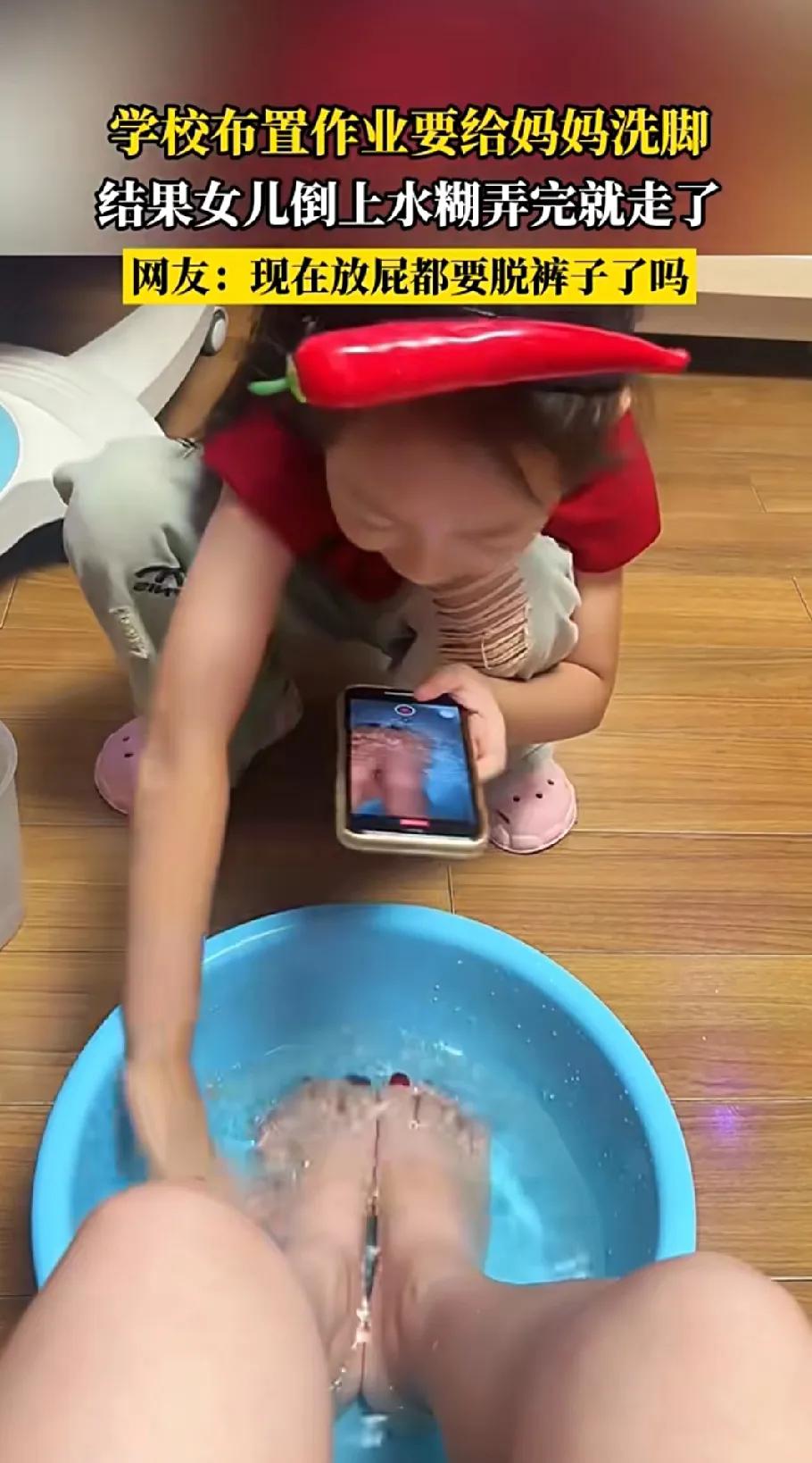 学校布置作业要给妈妈洗脚 结果女儿倒上水扒拉两下,拍照走人 面子工程?为了完成任务而拍视频 学校为了锻炼孩子,增加亲子关系,总会布置一些亲子互动的活动和作业。意图很好,但是“敷衍式”洗脚、“摆拍式”孝顺,真的是老师想得到吗? 生活在进步,时代在变化,类似这样无意义的作业是不是应该取消,老师布置作业的时候是不是也应该与时俱进,改革创新? 作业应结合生活实际,更贴近真实生活。如让孩子参与家务劳动、记录父母一天行程。多强调情感交流而非机械动作,例如要求孩子用语言或文字表达对父母的感谢。 这样的作业形式,才能真正让孩子在实践中体会到亲情的珍贵,而不是流于形式。学校和老师应该多思考如何布置出有意义的作业,让孩子在完成作业的同时,真正收获成长和亲情。