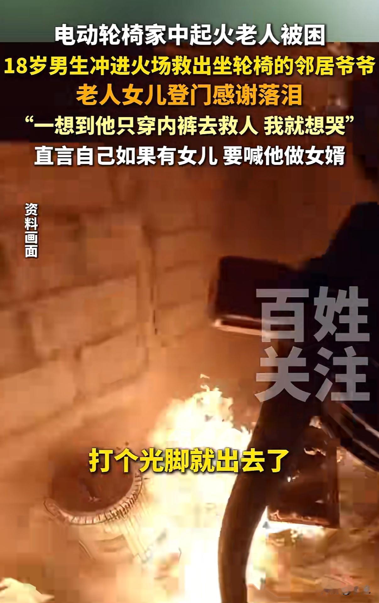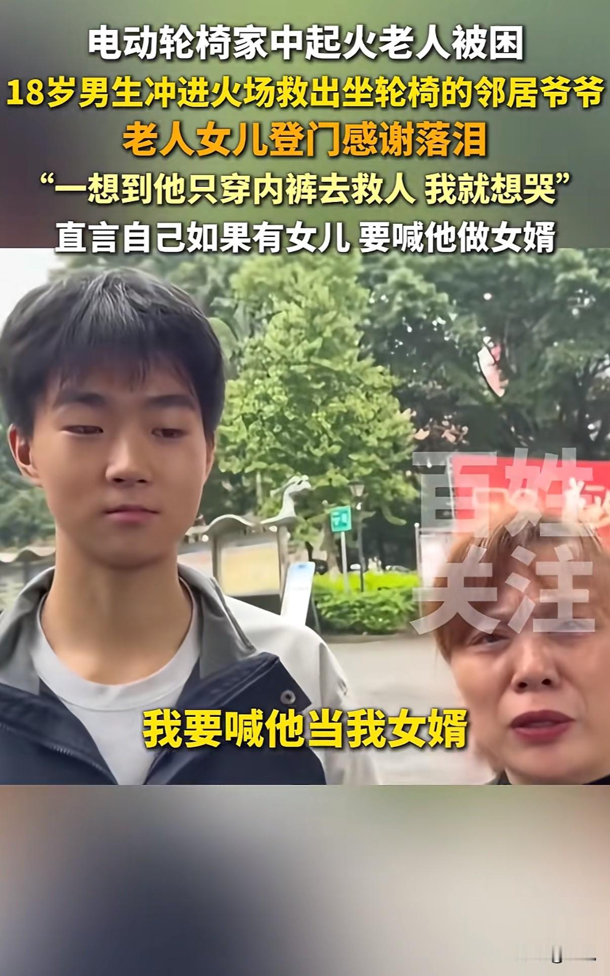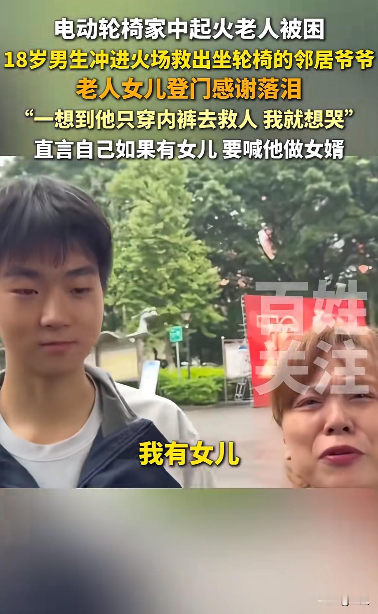 “18岁男生火场救人获赞”!重庆高三男生祝野,穿着内裤光脚冲进火场的画面,比任何特效大片都惊心动魄。 事情发生在10月16日晚上。老夫妻家电动轮椅充电爆炸,火势瞬间蔓延。两个80多岁的老人,一个坐轮椅,一个行动不便,完全被困住。 18岁的祝野听到动静,只穿着内裤就跑出门。他做对了三件事:第一时间切断电源,先把坐轮椅的老人背出来,再返回扶另一个老人。最后还帮忙泼水灭火,直到消防员赶到。 事后看他双脚烫红的照片,隔着屏幕都觉得疼。可这孩子就说:“当时没多想,人命最重要。” 被救老人的女儿江女士找到学校,哭着说“他救了我爸爸妈妈”。她带来牛奶苹果,非要给孩子补身体。最打动人的是那句:“如果我有女儿,一定让他做女婿。” 这话瞬间引爆全网。“国民女婿”成了祝野的新标签。 但抛开玩笑,这三个细节更值得关注: 第一,断电、救人、灭火,他的操作完全不像临时起意。班主任说,他是羽毛球特长生,训练刻苦,平时就乐于助人。关键时刻的冷静,其实是日常积累。 第二,现场视频里,邻居们都在帮忙。这种“远亲不如近邻”的情谊,在都市生活中越来越珍贵。 第三,祝野救人后既没躲闪也没张扬,正常回校上课。这种纯粹特别打动人。 现在很多家长总盯着分数,可这件事告诉我们:培养一个能断电、会背人、敢冲火场的孩子,比考上名校更让人骄傲。 “真正的勇敢不是铠甲加身,而是危难时挺身而出的本能。”网友这句话说到了点子上。