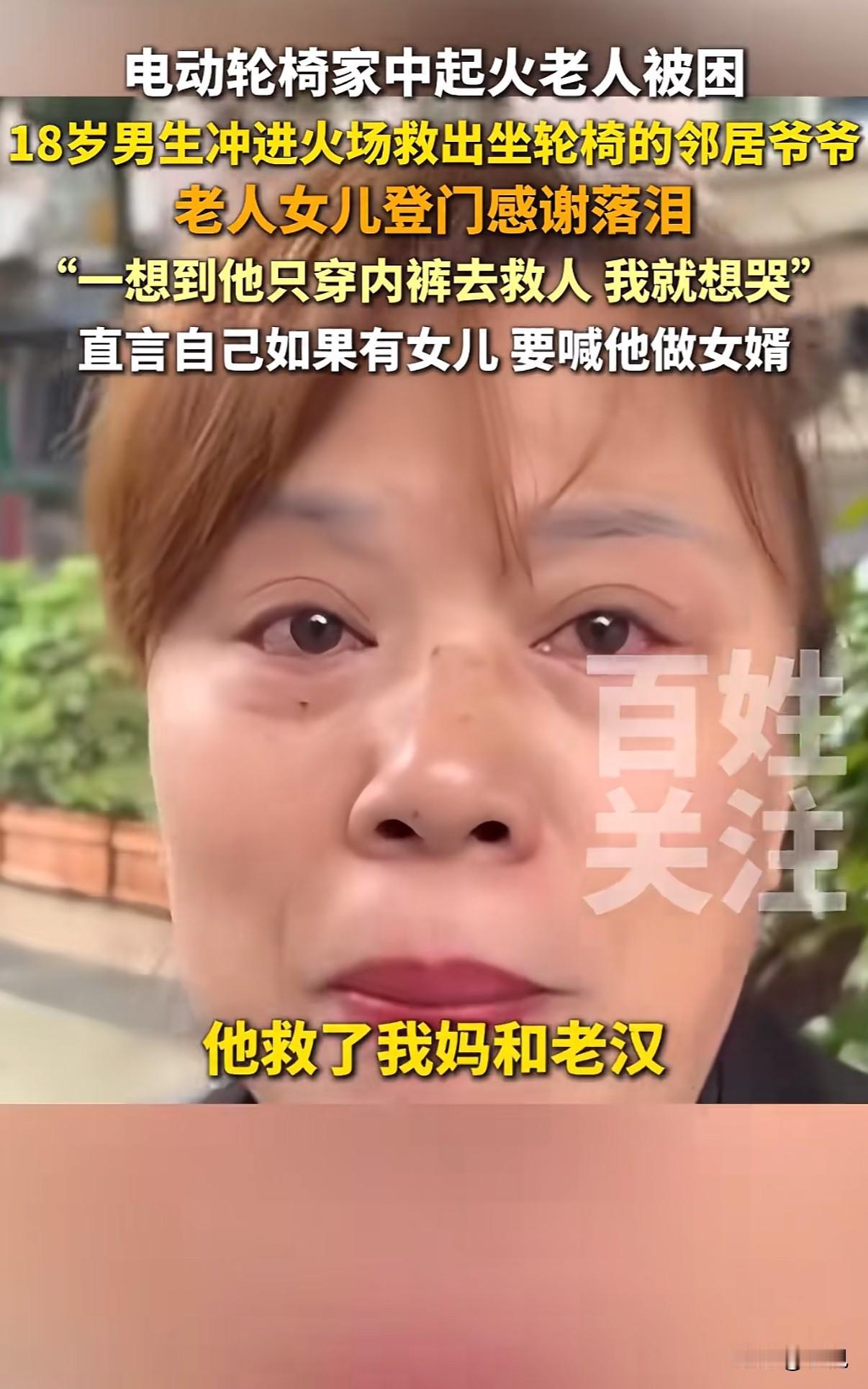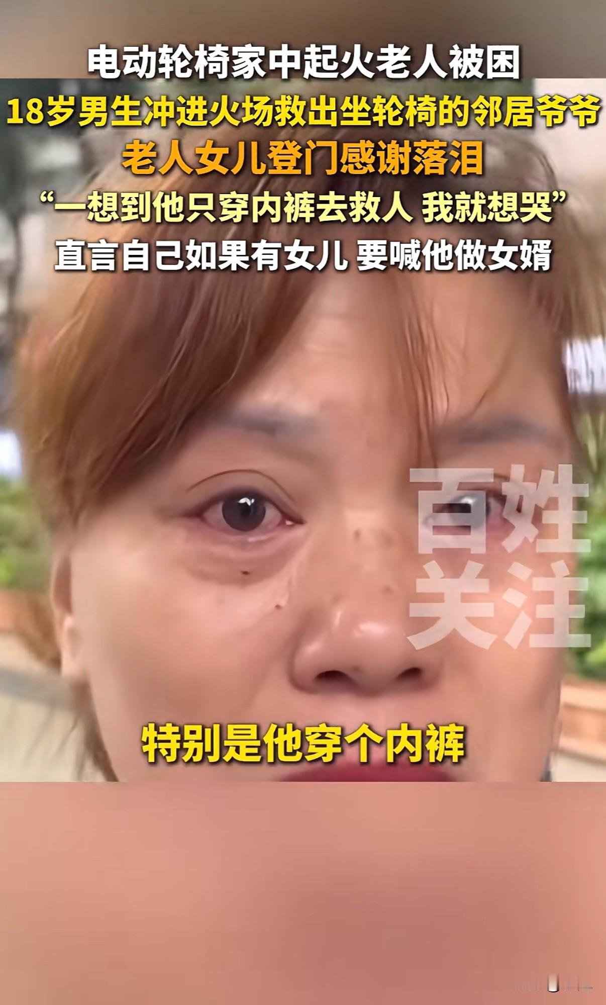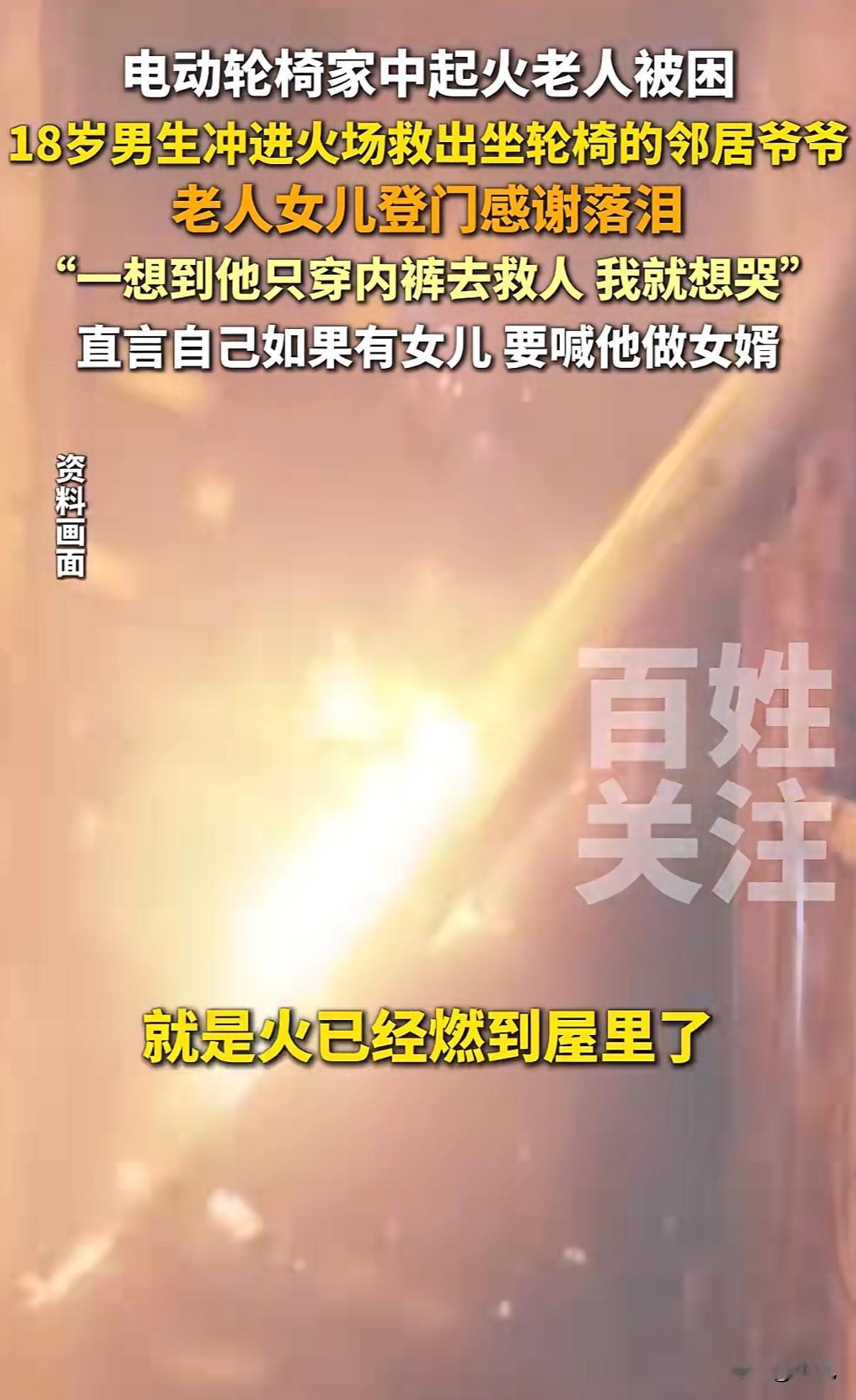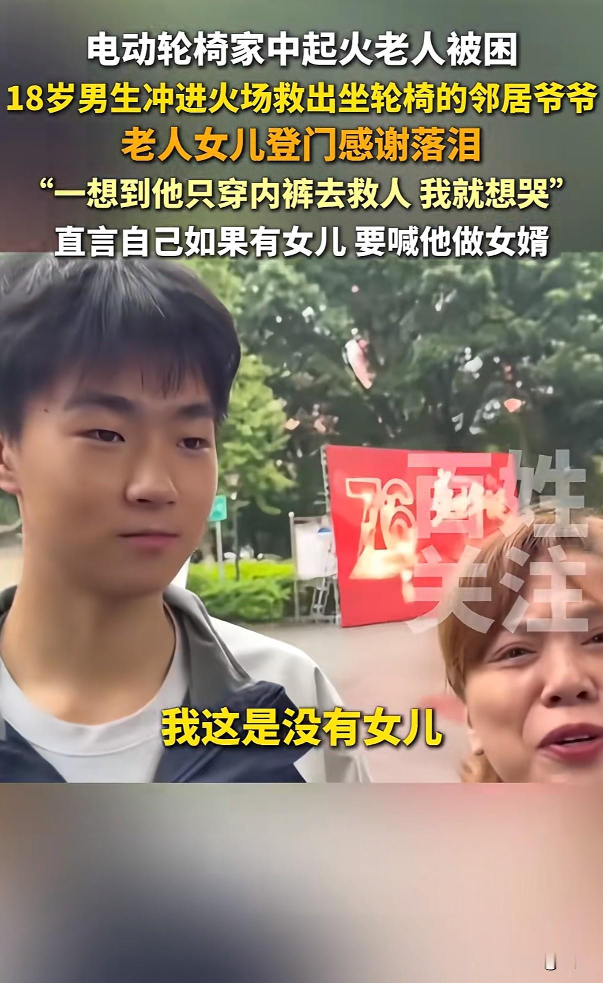 “18岁男生火场救人获赞”!重庆高三男生祝野,穿着内裤光脚冲进火场的画面,比任何特效大片都惊心动魄。 事情发生在10月16日晚上。老夫妻家电动轮椅充电爆炸,火势瞬间蔓延。两个80多岁的老人,一个坐轮椅,一个行动不便,完全被困住。 18岁的祝野听到动静,只穿着内裤就跑出门。他做对了三件事:第一时间切断电源,先把坐轮椅的老人背出来,再返回扶另一个老人。最后还帮忙泼水灭火,直到消防员赶到。 事后看他双脚烫红的照片,隔着屏幕都觉得疼。可这孩子就说:“当时没多想,人命最重要。” 被救老人的女儿江女士找到学校,哭着说“他救了我爸爸妈妈”。她带来牛奶苹果,非要给孩子补身体。最打动人的是那句:“如果我有女儿,一定让他做女婿。” 这话瞬间引爆全网。“国民女婿”成了祝野的新标签。 但抛开玩笑,这三个细节更值得关注: 第一,断电、救人、灭火,他的操作完全不像临时起意。班主任说,他是羽毛球特长生,训练刻苦,平时就乐于助人。关键时刻的冷静,其实是日常积累。 第二,现场视频里,邻居们都在帮忙。这种“远亲不如近邻”的情谊,在都市生活中越来越珍贵。 第三,祝野救人后既没躲闪也没张扬,正常回校上课。这种纯粹特别打动人。 现在很多家长总盯着分数,可这件事告诉我们:培养一个能断电、会背人、敢冲火场的孩子,比考上名校更让人骄傲。 “真正的勇敢不是铠甲加身,而是危难时挺身而出的本能。”网友这句话说到了点子上。