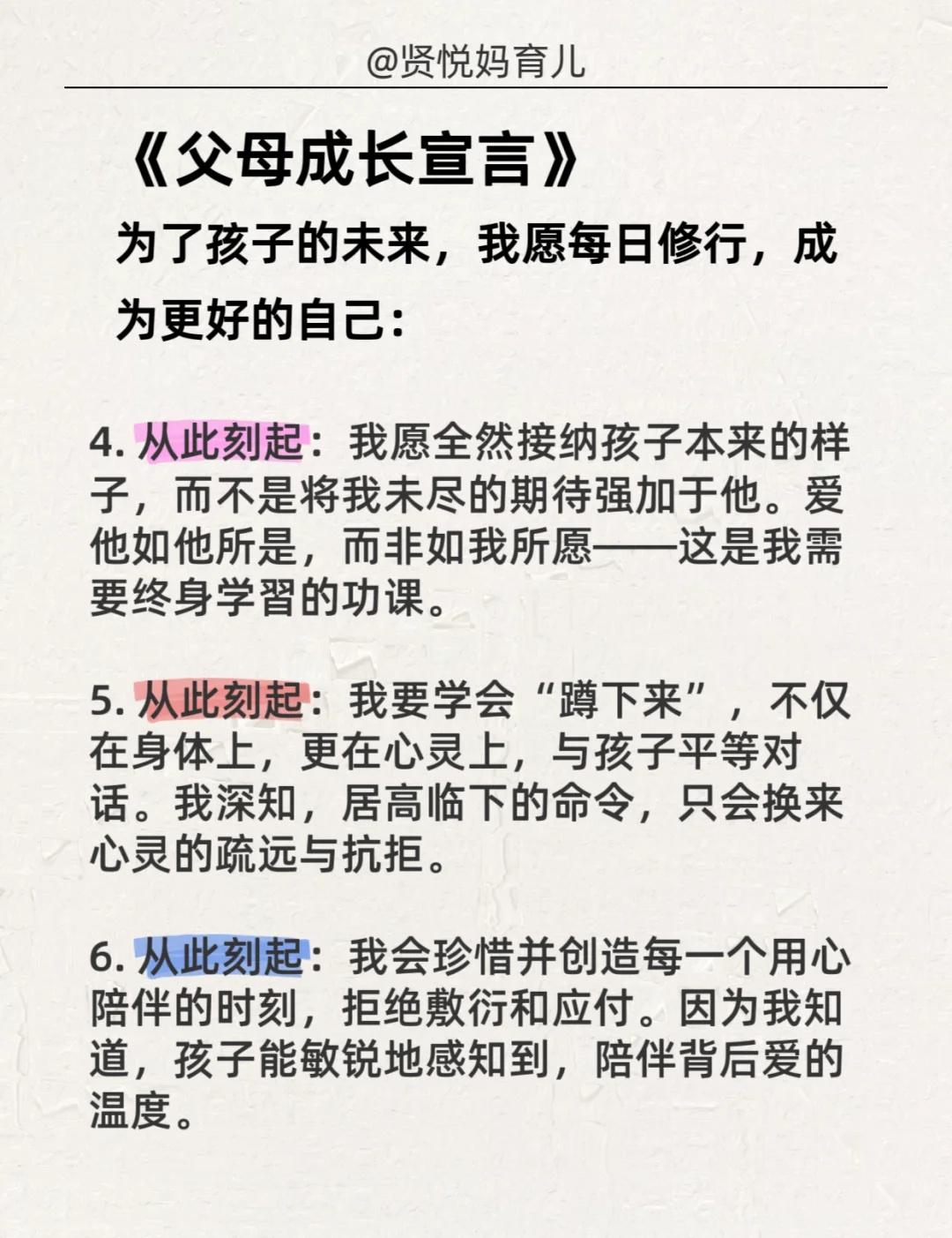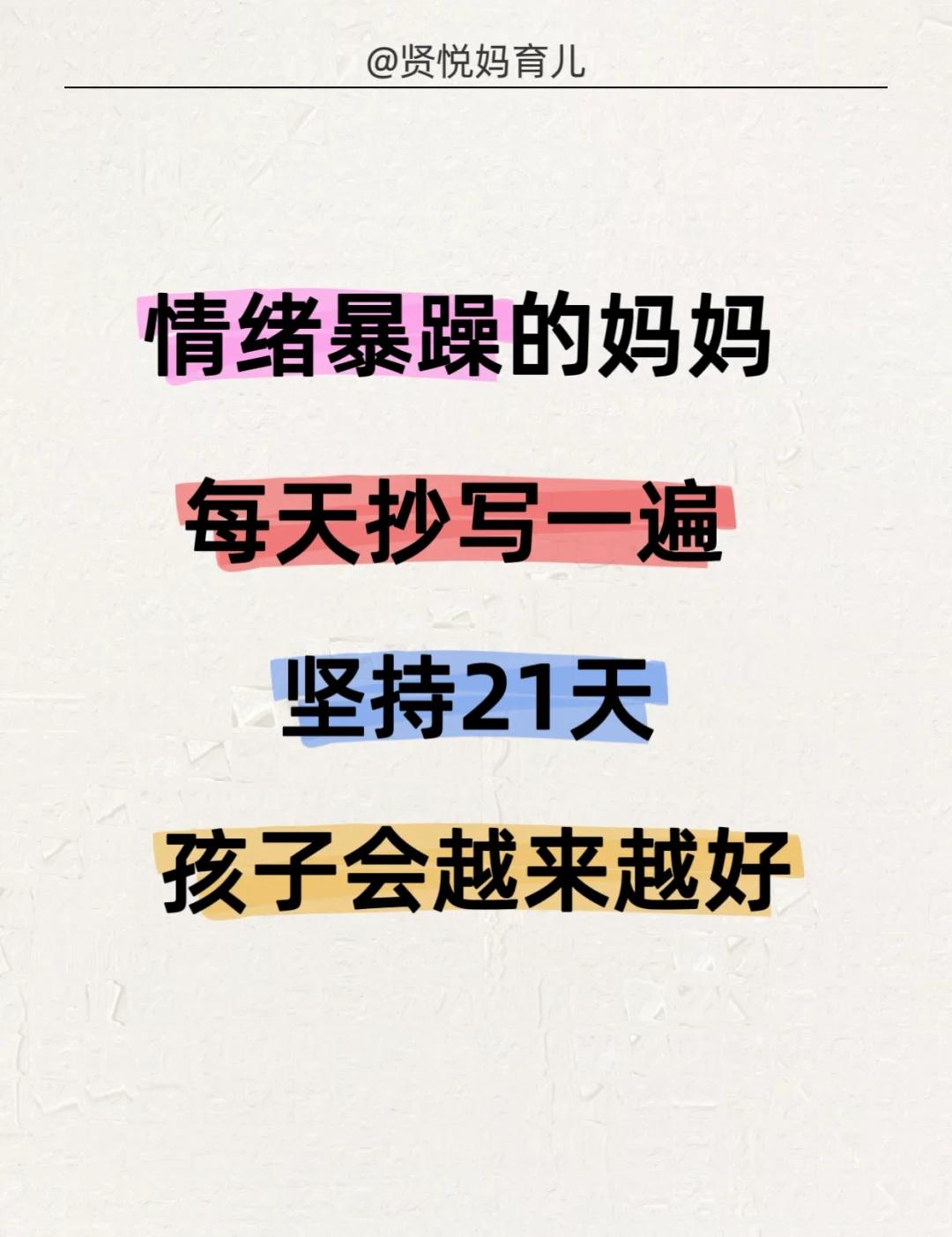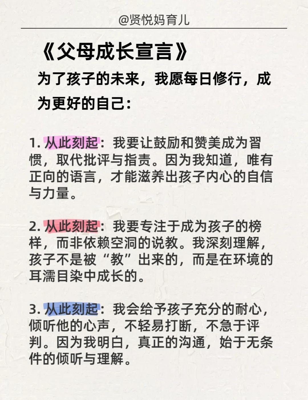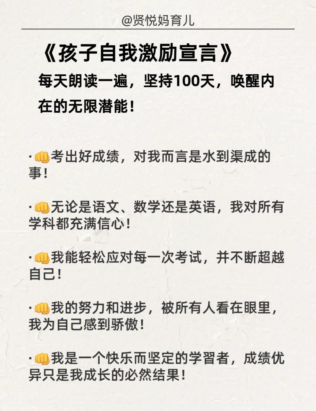 情绪暴躁的妈妈,每天抄写一遍,坚持21天! 《父母成长宣言》 为了孩子的未来,我愿每日修行,成为更好的自己: 1. 从此刻起:我要让鼓励和赞美成为習惯,取代批评与指责。 2. 从此刻起:我要专注于成为孩子的榜样,而非依赖空洞的说教。 3. 从此刻起:我会给予孩子充分的耐心,倾听他的心声,不轻易打断,不急于评判。 4. 从此刻起:我愿全然接纳孩子本来的样子,而不是将我未尽的期待强加于他。 5. 从此刻起:我要学会“蹲下来”,不仅在身体上,更在心灵上,与孩子平等对话。 6. 从此刻起:我会珍惜并创造每一个用心陪伴的时刻,拒绝敷衍和应付。 7. 从此刻起:我将管理好自己的情绪,成为情绪的主人,与孩子平和度过每一刻。 8. 从此刻起:我会用心维护与伴侣的关系,让家成为一个充满爱与和谐的港湾。 9. 从此刻起:我尊重孩子成为独立的自己,去完成他特有的生命使命。 10. 从此刻起:我愿为孩子播种善行,积累福缘。 11. 从此刻起:我会把孩子出现的问题,视为反思并修正自身的一面镜子。 12. 从此刻起:我立志成为孩子生命中可信赖的朋友、坚定的伙伴与智慧的引路人,用爱陪伴他走向独立而丰盛的人生。 --- 《孩子自我激励宣言》 每天朗读一遍,坚持100天,唤醒内在的无限潜能! · 我的成绩正在稳步提升! ·我本就优异,学習对我来说充满乐趣! ·我热爱学習,享受汲取知识的每一刻! ·我能轻松、圆满地完成所有学習任务! ·我的学習能力每天都在进步! ·考出好成绩,对我而言是水到渠成的事! ·无论是语文、数学还是英语,我对所有学科都充满信心! ·我能轻松应对每一次考试,并不断超越自己! ·我的努力和进步,被所有人看在眼里,我为自己感到骄傲! ·我是一个快乐而坚定的学習者,成绩优异只是我成长的必然结果! --- 👉嗨,我是贤悦妈,一个在育儿路上不断学習和摸索的妈妈。 👉打卡第1天!有一起坚持的妈妈吗? 情绪管理 亲子沟通 父母成长 家庭教育 正面管教 育儿心得育儿干货 育儿经验 不吼不骂教孩子