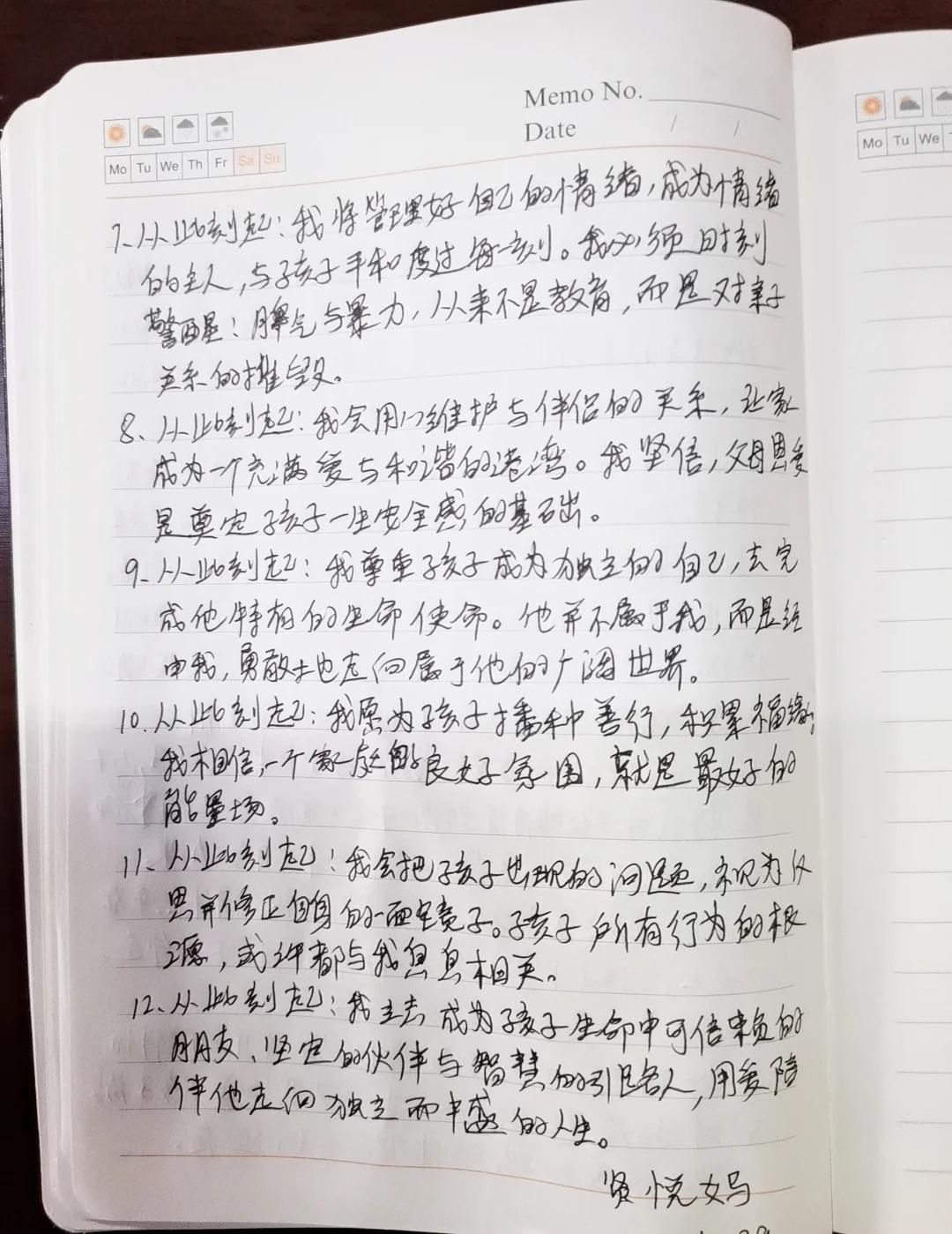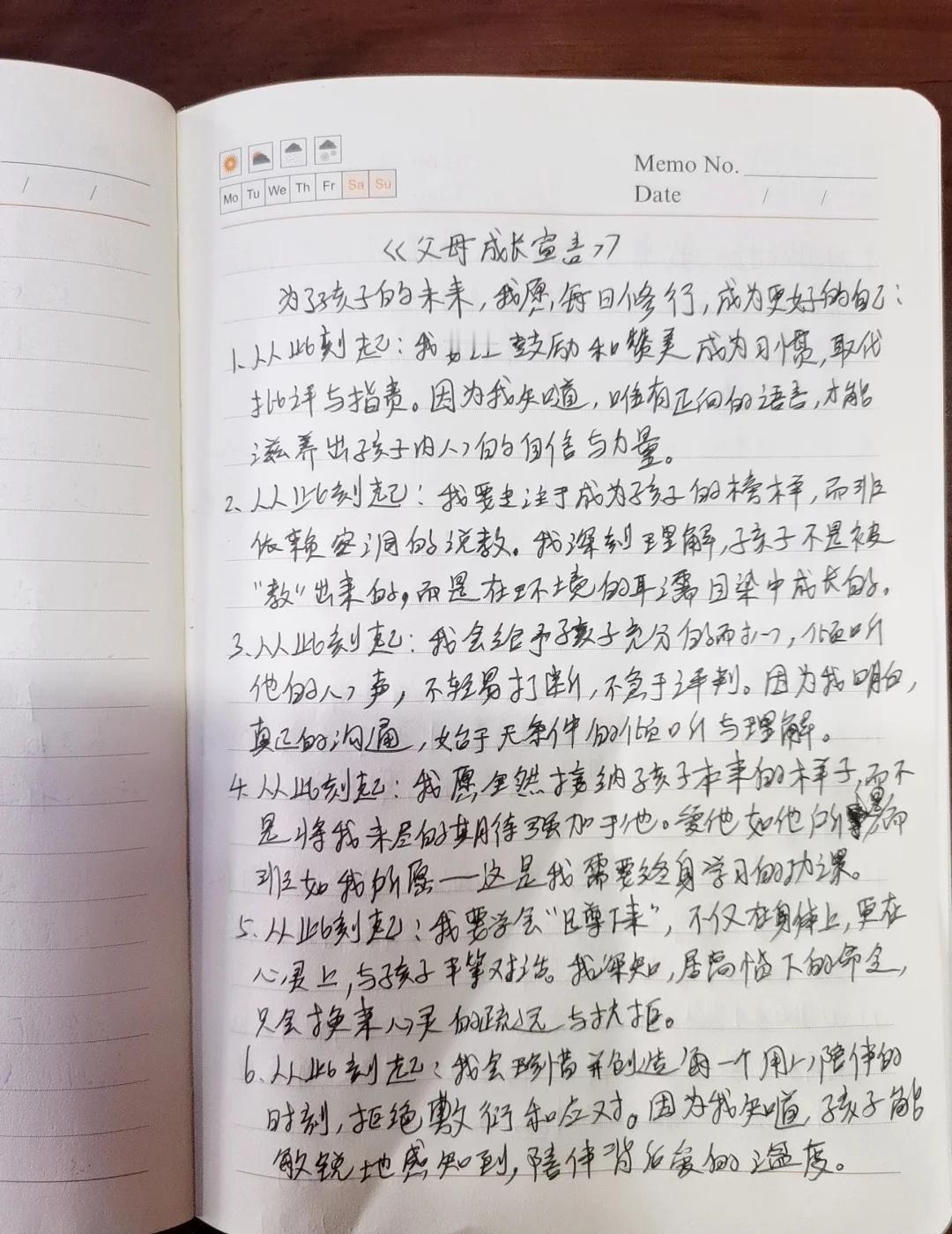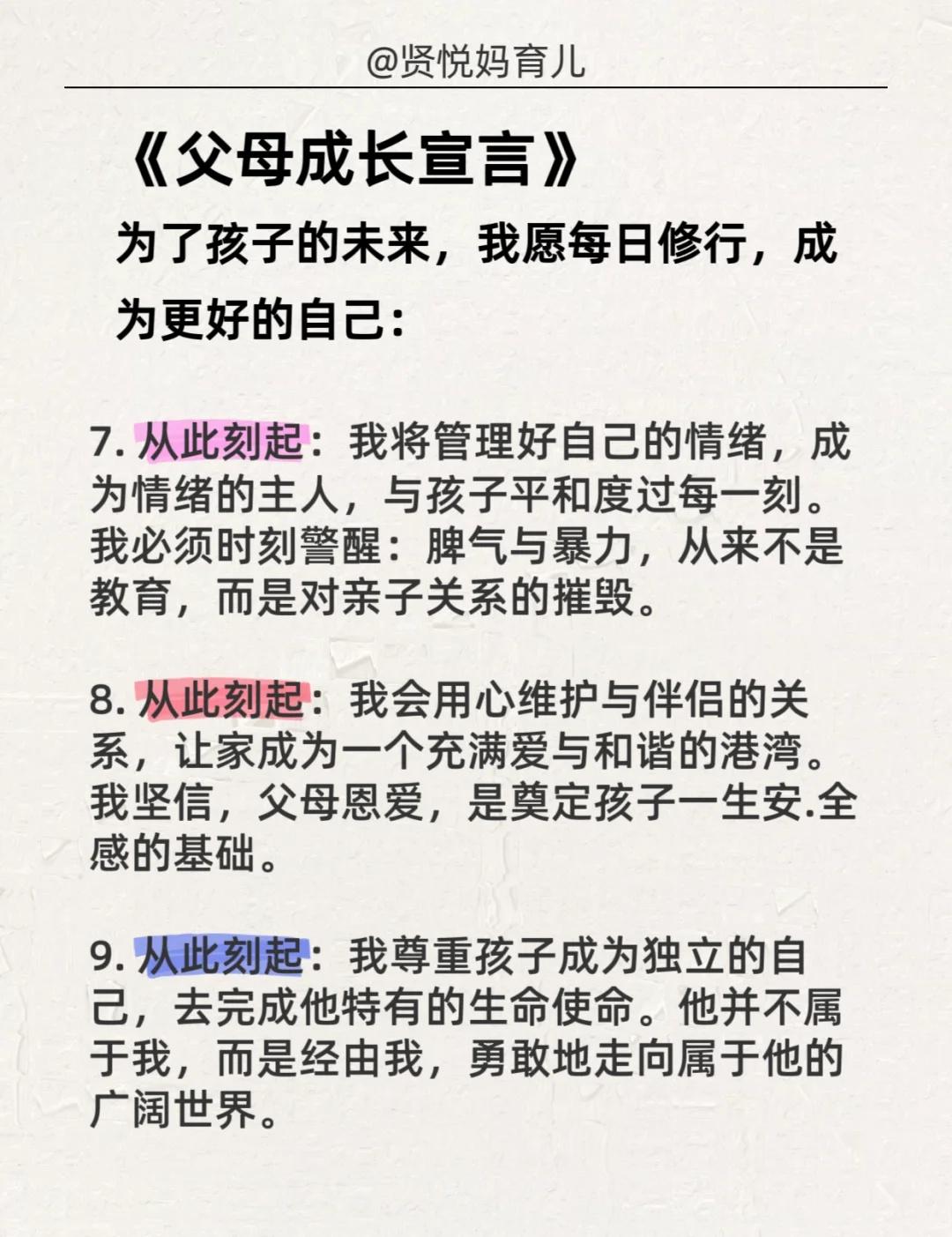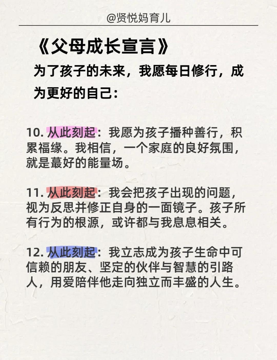 情绪暴躁的妈妈,每天抄写一遍,坚持21天! 《父母成长宣言》 为了孩子的未来,我愿每日修行,成为更好的自己: 1. 从此刻起:我要让鼓励和赞美成为習惯,取代批评与指责。 2. 从此刻起:我要专注于成为孩子的榜样,而非依赖空洞的说教。 3. 从此刻起:我会给予孩子充分的耐心,倾听他的心声,不轻易打断,不急于评判。 4. 从此刻起:我愿全然接纳孩子本来的样子,而不是将我未尽的期待强加于他。 5. 从此刻起:我要学会“蹲下来”,不仅在身体上,更在心灵上,与孩子平等对话。 6. 从此刻起:我会珍惜并创造每一个用心陪伴的时刻,拒绝敷衍和应付。 7. 从此刻起:我将管理好自己的情绪,成为情绪的主人,与孩子平和度过每一刻。 8. 从此刻起:我会用心维护与伴侣的关系,让家成为一个充满爱与和谐的港湾。 9. 从此刻起:我尊重孩子成为独立的自己,去完成他特有的生命使命。 10. 从此刻起:我愿为孩子播种善行,积累福缘。 11. 从此刻起:我会把孩子出现的问题,视为反思并修正自身的一面镜子。 12. 从此刻起:我立志成为孩子生命中可信赖的朋友、坚定的伙伴与智慧的引路人,用爱陪伴他走向独立而丰盛的人生。 --- 《孩子自我激励宣言》 每天朗读一遍,坚持100天,唤醒内在的无限潜能! · 我的成绩正在稳步提升! ·我本就优异,学習对我来说充满乐趣! ·我热爱学習,享受汲取知识的每一刻! ·我能轻松、圆满地完成所有学習任务! ·我的学習能力每天都在进步! ·考出好成绩,对我而言是水到渠成的事! ·无论是语文、数学还是英语,我对所有学科都充满信心! ·我能轻松应对每一次考试,并不断超越自己! ·我的努力和进步,被所有人看在眼里,我为自己感到骄傲! ·我是一个快乐而坚定的学習者,成绩优异只是我成长的必然结果! --- 👉嗨,我是贤悦妈,一个在育儿路上不断学習和摸索的妈妈。 👉打卡第1天!有一起坚持的妈妈吗? 情绪管理 亲子沟通 父母成长 家庭教育 正面管教 育儿心得育儿干货 育儿经验 不吼不骂教孩子