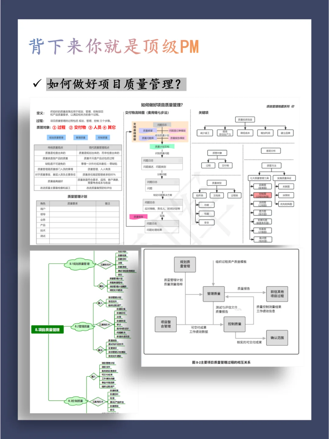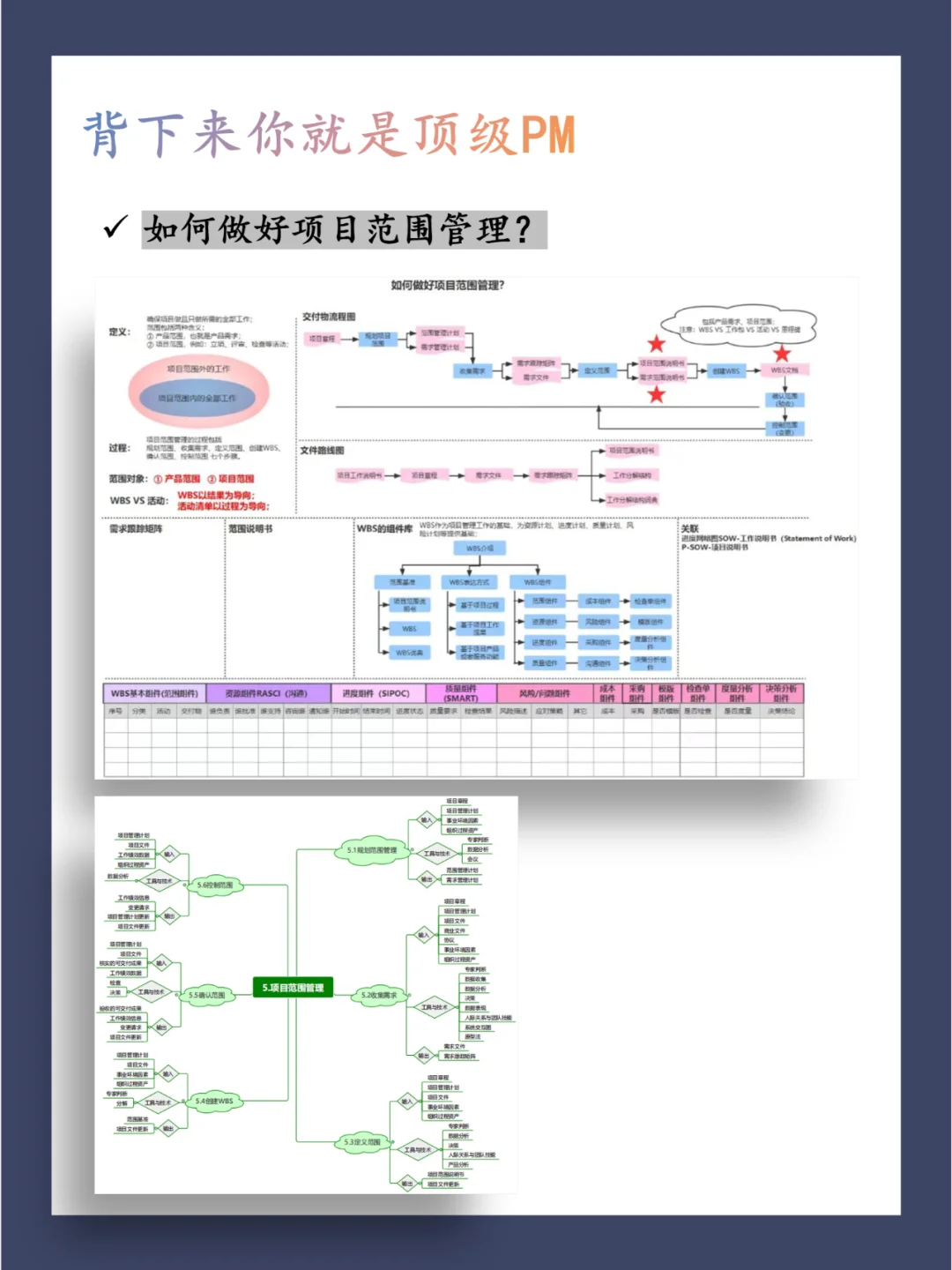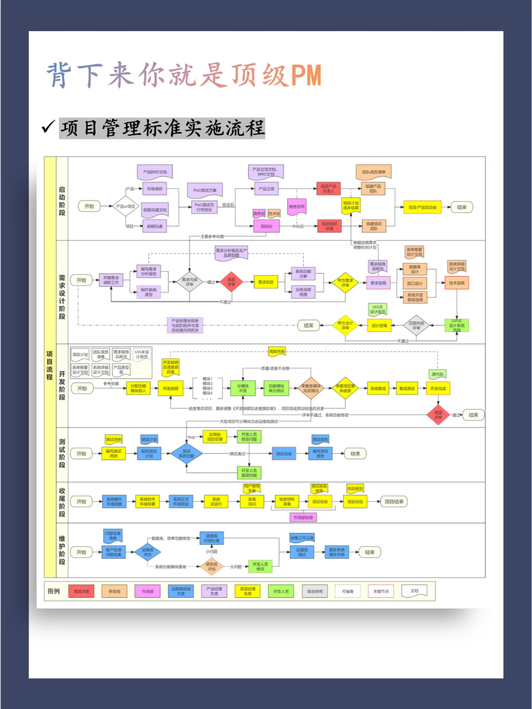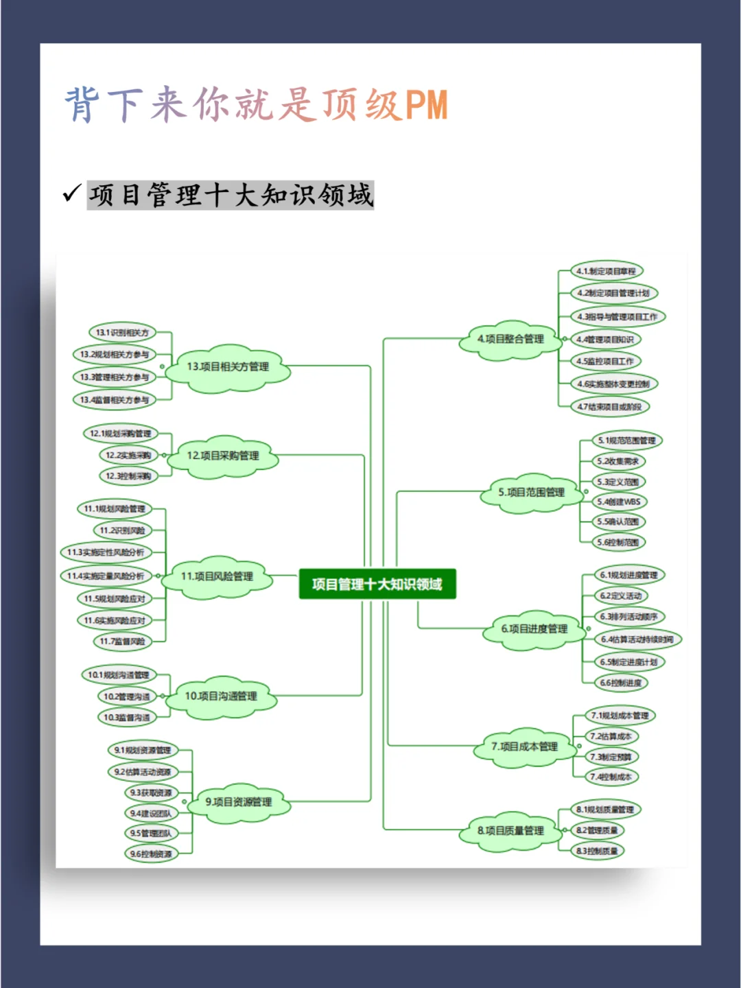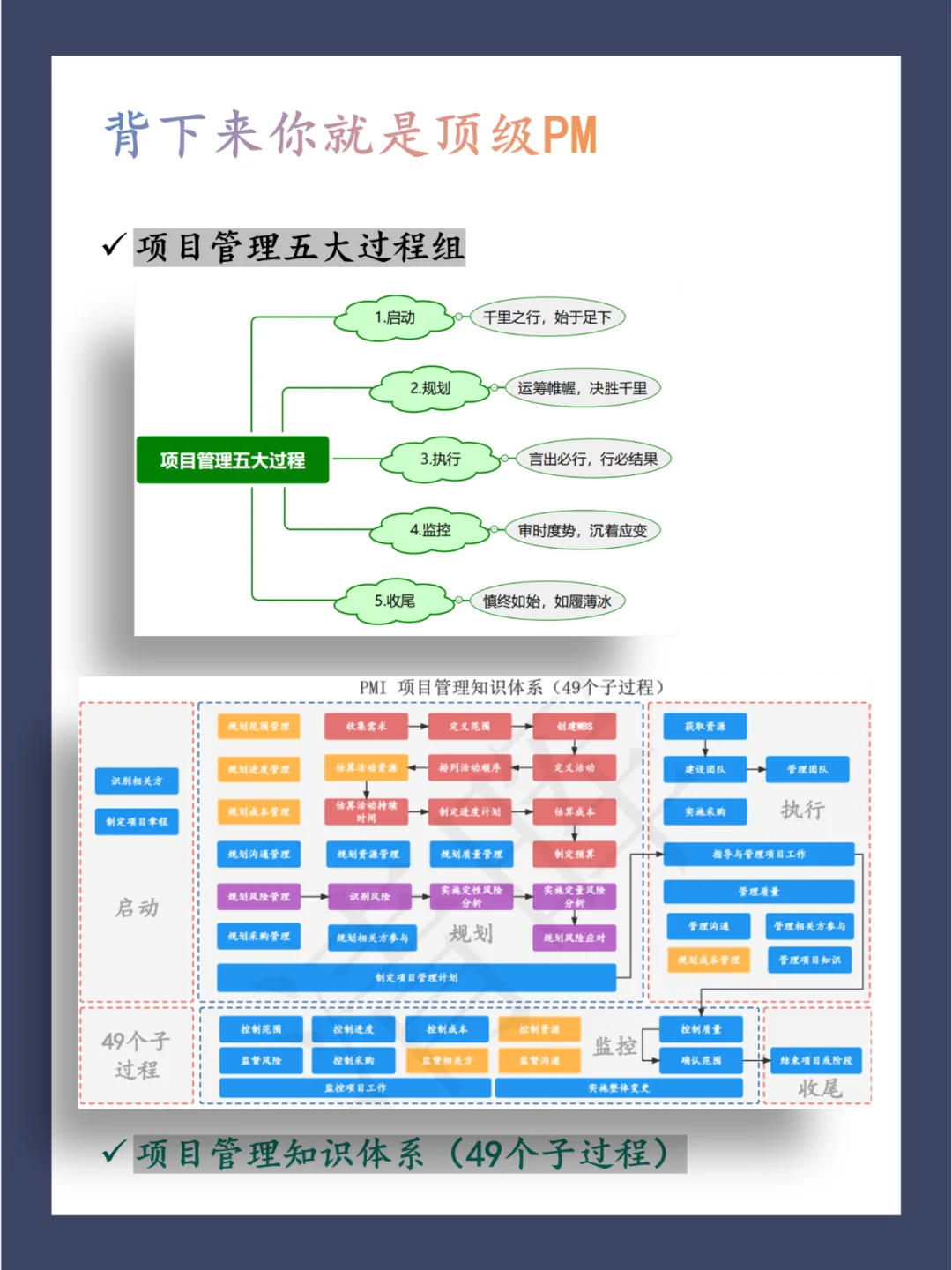 公司年薪的项目大佬带的项目流程总是特别顺畅,原来他一直都在看这9张流程图 背下来,你就是顶级PM 终于被我整理出来了! 一、项目管理标准实施流程 二、五大过程组有: 启动过程组 规划过程组 执行过程组 监控过程组 收尾过程组 三、10大知识领域有: 1. 项目整合管理 2. 项目范围管理 3. 项目进度管理 4. 项目成本管理 5. 项目质量管理 6. 项目资源管理 7. 项目沟通管理 8. 项目风险管理 9. 项目采购管理 10. 项目相关方管理