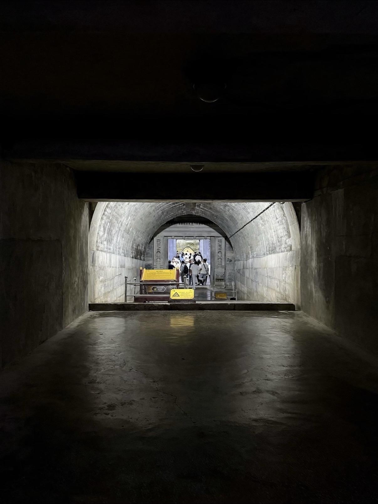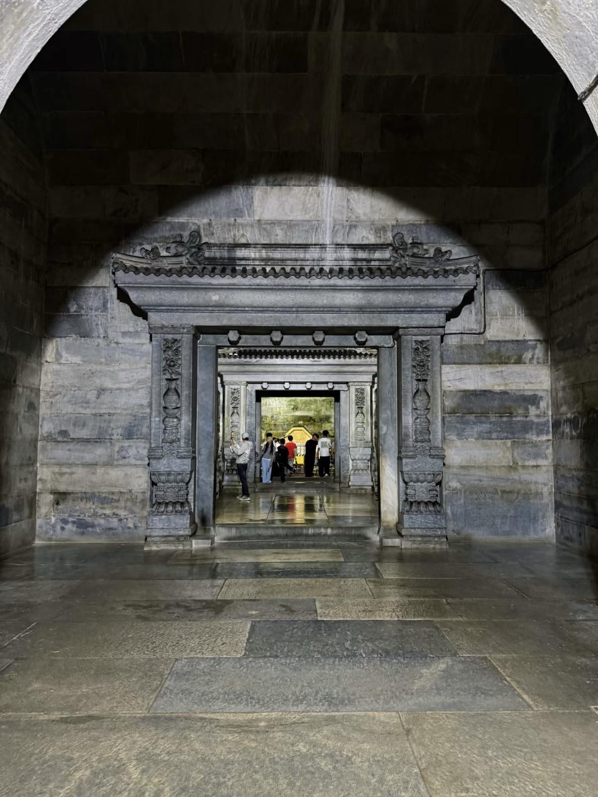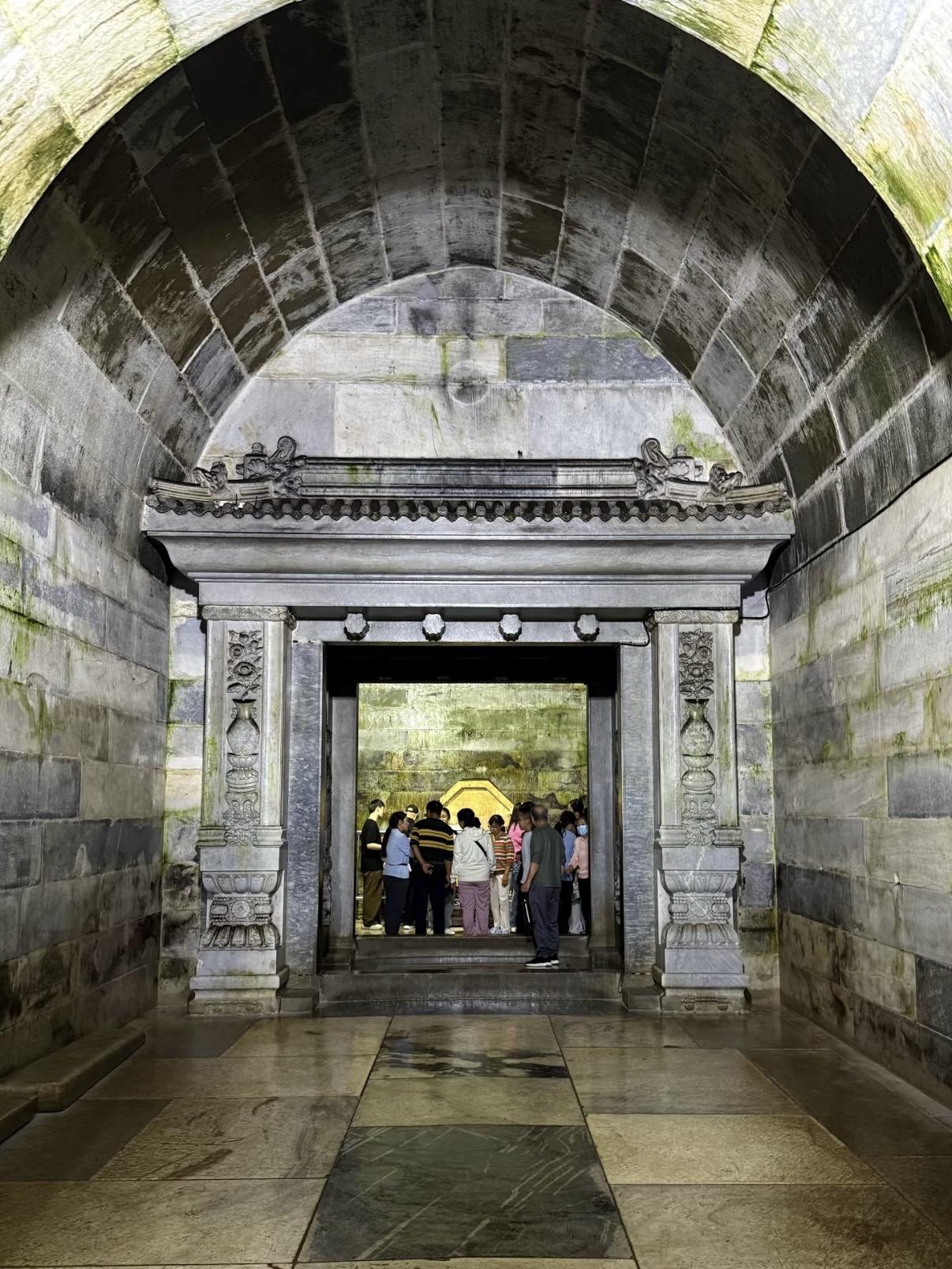 崇陵地宫是清西陵唯一对外开放地宫的帝陵。拱券式石结构建筑,由九道券和四扇石门构成三殿,每扇石门均雕有菩萨立像。金券内的石制棺床上摆放着帝后棺椁。长期以来光绪皇帝的死因一直扑朔迷离,特别是与慈禧太后在两天之内相继去世,成为清朝一桩疑案引发众多议论猜想。从光绪皇帝的脉案及清皇室成员的回忆录来看,病亡说和毒害