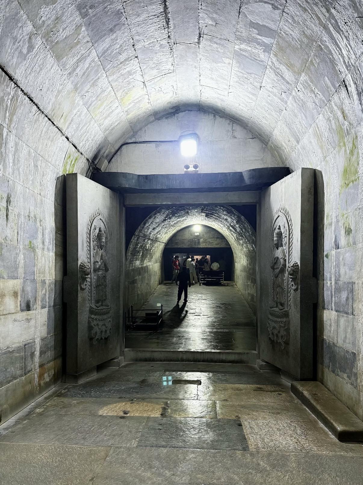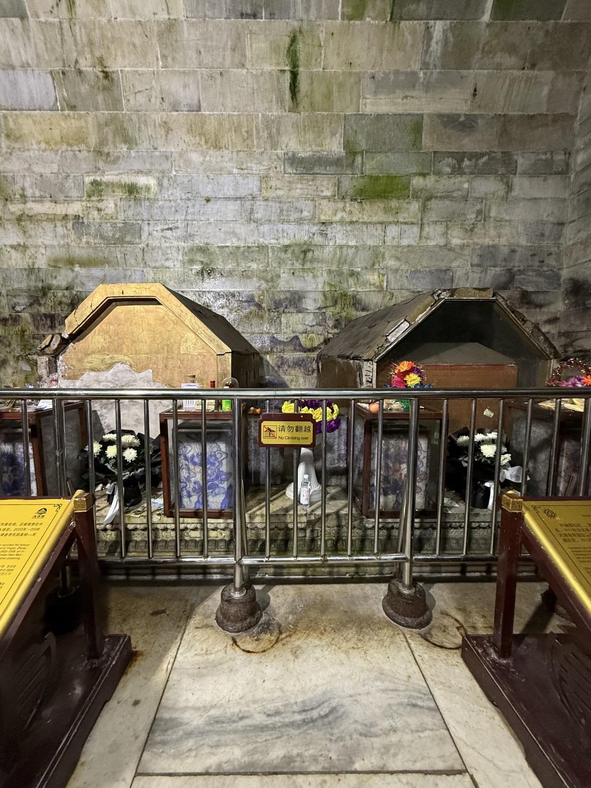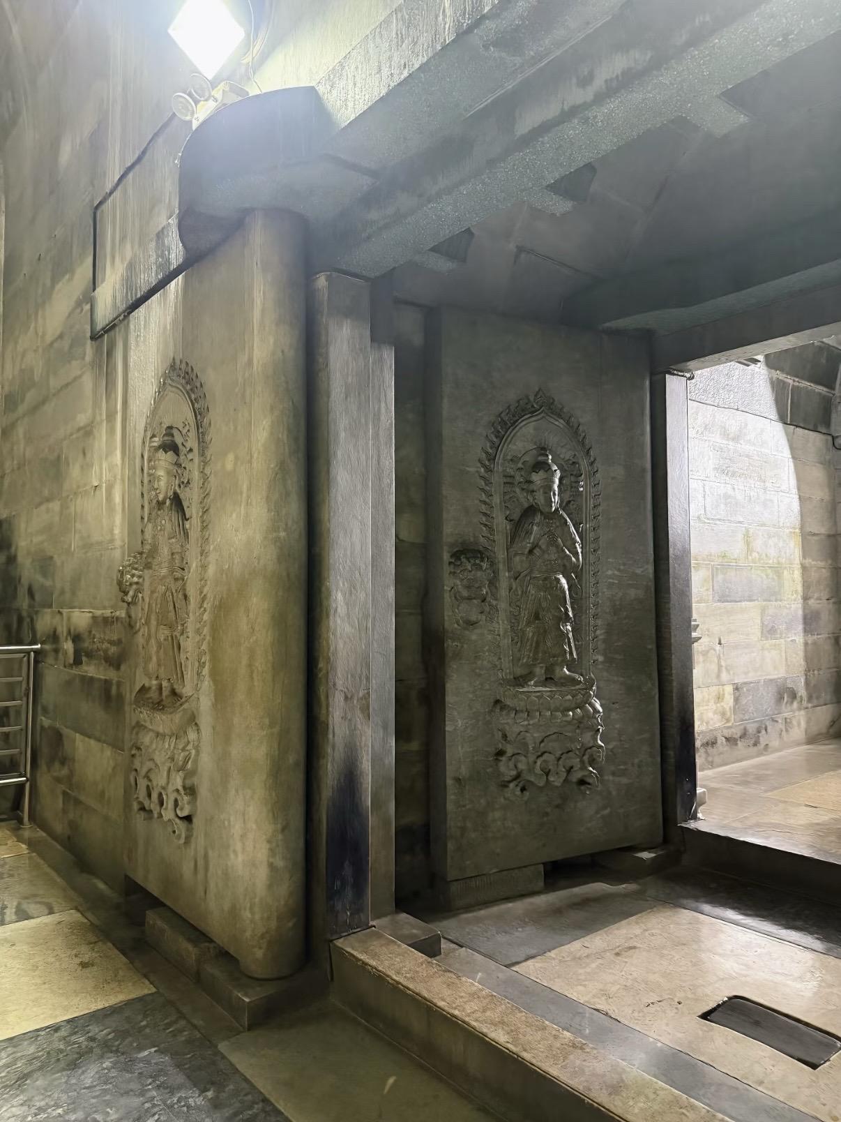崇陵地宫是清西陵唯一对外开放地宫的帝陵。拱券式石结构建筑,由九道券和四扇石门构成三殿,每扇石门均雕有菩萨立像。金券内的石制棺床上摆放着帝后棺椁。长期以来光绪皇帝的死因一直扑朔迷离,特别是与慈禧太后在两天之内相继去世,成为清朝一桩疑案引发众多议论猜想。从光绪皇帝的脉案及清皇室成员的回忆录来看,病亡说和毒害