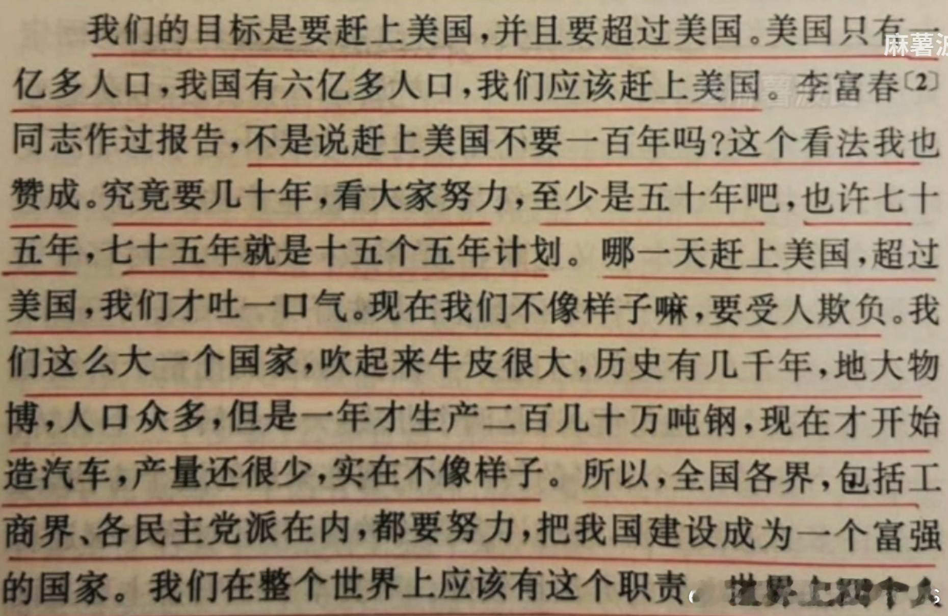 1955年11月29日在关于工商业社会主义改造问题座谈会上,提到“追上美国可能需要75年,就是15个五年计划。”到今天十五五开始了,甚至2035年要达到中等发达水平,还真的到了这个节点了。