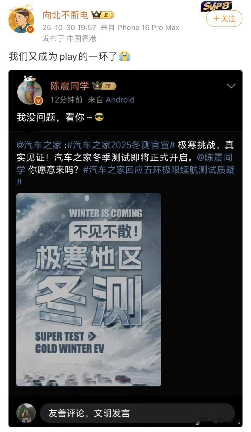 向北:我们又成为play的一环了[泪奔] 陈震在评论这个“准·冬测”和“冬测”之间的话题呢,在全网引发了非常大的热度,借着小米的流量,陈震的流量,汽车之家的知名度又进一步扩大了。 好家伙搞了半天,在这里等着我们,之前几年冬测大家主要关注的媒体是懂车帝,现在汽车之家更换了新的股东,想把汽车之家重新做起来,结果就找上了陈震。 你是怎么看的?欢迎评论区留言。