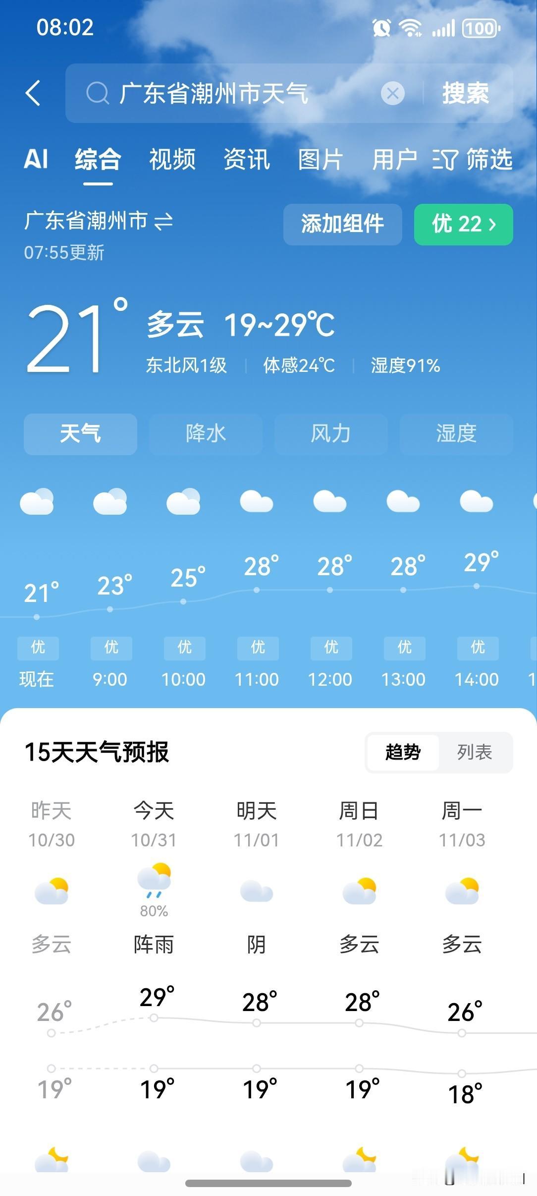31日起广东再迎降温模式! 未来三天, 我省云量较多, 部分市县有小雨; 31日西部和北部市县早晚有轻雾或雾; 31日开始受弱冷空气持续补充扩散影响, 各地气温逐日略有下降, 11月1-4日各地日平均气温下降3~6℃; 粤北市县最低气温15~18℃, 早晚体感清凉; 我省海面有东北风6~7级阵风8级。 今天(31日), 潮州喜提一个多云天气, 气温19~29℃, 此刻气温21℃, 体感温度24℃。 昨天是万万没有想到啊! 还能那么热? 今天还是继续29℃呢! 每次冷空气来, 往往都是由北往南缓缓而至, 一时半会怕是还到不了我们这边。 看了一下未来几天的天气, 气温是下降了, 但不多啊! 这股弱冷空气到底是弱了些, 降温不明显啊! 看看今天的天空, 一早就是阳光灿烂, 照得人眼睛都睁不开。 早上的气温明显比昨天高了一点, 风也不凉了。 总体来讲, 今天的天气还是挺好的, 应该给个五星好评。 如此天气! 元芳,你怎么看?