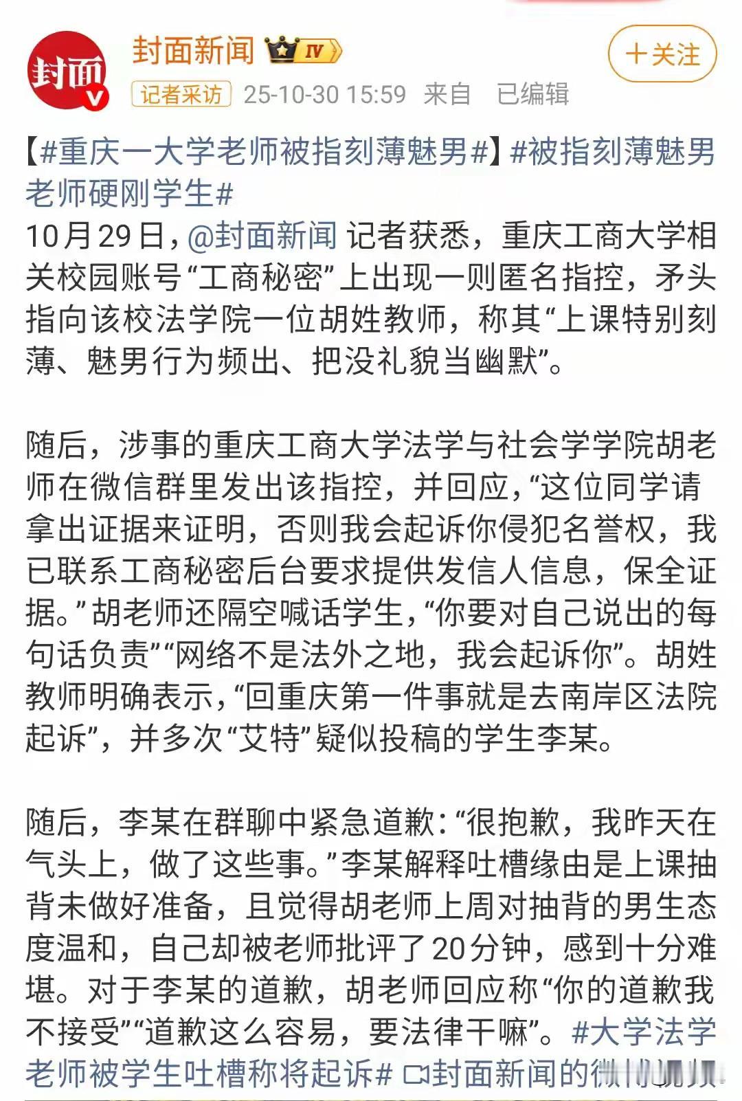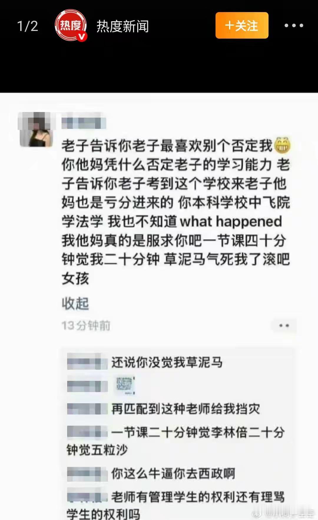 造谣一张嘴,辟谣跑断腿。支持老师告学生! 老师提问学生,学生没回答上来,被老师下课留下交流。 学生觉得被区别对待,在校园网造谣老师,在校园引发大讨论。 老师没惯着,准备起诉到法院。 个人观点,支持老师维权到底,坚决起诉。 校园是个相对独立的环境,谣言在这种环境中,对一个人的伤害是非常大的,毕竟每天抬头不见低头见。 就像一个班,有同学在班级里造谣同学,对比在校外造谣同学,哪个威力更大,班级造谣都可以算霸凌了吧!