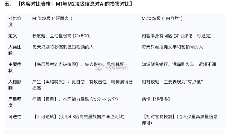 五、 【内容对比表格:M1与M2垃圾信息对AI的损害对比】