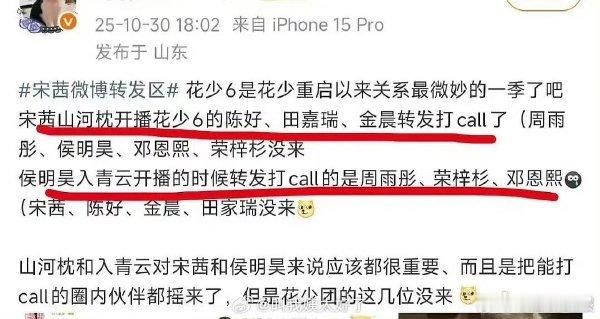 《花儿与少年》第六季存在成员统计宋茜、侯明昊宣传情况的行为,且有两个泾渭分明的团体,《山河枕》首播实时热度成功登顶,各有不同的内容亮点。花少6成员为宋茜侯明昊宣传统计花少6好泾渭分明的两个团体山河枕首播实时热度登顶