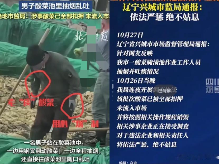 谁看了不犯恶心! 辽宁兴城腌菜厂这下彻底翻车, 真不是工人在酸菜池抽烟吐痰多离谱,是这脏到骨子里的场面被拍下来曝光,大家才惊觉平时吃的酸菜可能这么埋汰! 你瞧那工人,站在酸菜池里叼着烟,吐口痰还抬脚踩两下,旁边人跟没看见似的——这哪是偶尔一次?分明是早成常态了! 想起我亲戚以前在包子铺干活,天冷冻得手生冻疮,流血了还接着揉米粉,血都混进面里,打那起我再也不买外面的面食。 其实这些事压根不是“工人没素质”,根儿在管理摆烂!食品加工连工服、口罩都不要求,没人监督没人查,商家光顾着赶工省成本,卫生早抛到后脑勺了。 你们平时买吃的,有没有遇过这种让人膈应的卫生糟心事?评论区聊聊,咱也互相提个醒!
