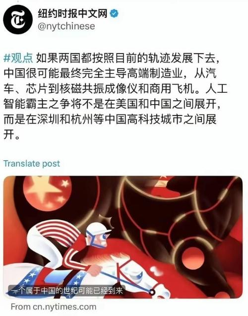 美媒终于意识到了!但是可能已经晚了!近日,美媒纽约时报发表观点称,如果两国都按照目前的轨迹发展下去,中国很可能最终完全主导高端制造业,从汽车,芯片,到核磁共振成像仪和商用飞机。人工智能霸主之争将不再是在中美之间展开,而是在深圳和杭州等高科技城市之间展开。 纽约时报这话算是说到点子上了,而且真不是夸张,现在中国高端制造业的势头,确实是越跑越猛,等美媒反应过来想追,早就跟不上趟了。 汽车领域的爆发最直观,国际机构预测,2025年全球电动汽车保有量会涨到8500万辆,中国一个市场就占了58%。 这个比例意味着什么?全球每两辆电动车里,差不多就有一辆挂着中国品牌的车标。中银证券的数据更具体,他们预计2025年中国新能源汽车销量能达到1563万辆,同比增长25%。美国车企之前还靠着燃油车技术优势撑场面,现在在电动车赛道上已经被拉开差距。 而汽车领域的爆发只是开始,芯片这块曾经被卡脖子的硬骨头,现在也被啃出了缺口。 就在十月底,北京大学彭海琳教授团队的研究成果登上了《自然・通讯》。他们把生物领域的冷冻电子断层扫描技术用到了半导体行业,直接看清了光刻胶分子在显影液里的状态。这步突破太关键了,过去国内厂商只能靠试错调整工艺,现在能精准解决问题。 新技术让光刻工艺良率飙升20%,12英寸晶圆缺陷率降了99%以上。更关键的是,国产7nm GPU芯片“星海-1”已经宣布量产,性能接近英伟达的A100。这两项进展凑到一起,美国的技术封锁防线直接出现了缺口。 医疗设备领域的变化更让外界吃惊。以前医院里的核磁共振仪几乎全是西门子、GE这些洋品牌的天下,维修零件能随便涨价还断货。 现在不一样了,2024年中国核磁共振国产化率已经达到35.1%。联影的640层CT、美时的7.0T核磁共振都卖到了德法市场,价格只卖洋品牌的七成。洋品牌日子不好过了,GE医疗中国区营收去年跌了15%,飞利浦更是出现两位数下滑。国产设备还拉低了检查费用,PET-CT检查费因为国产品牌的进入降了25%左右。 人工智能领域的竞争格局变化更直接,纽约时报说竞争会在深圳和杭州之间展开,这话没说错。深圳聚集了大批AI硬件企业,算法落地速度特别快。杭州靠着数字经济基础,在智能驾驶、城市大脑这些领域走在前面。 两国的研发投入结构能说明问题,中国虽然基础研究投入占比不如美国,但试验发展投入占比高达83%以上,技术转化速度特别快。这种转化效率让很多技术想法能快速变成产品,这是美国目前比不了的。 商用飞机领域虽然进展稍慢,但也在稳步推进。C919大飞机已经开始商业运营,后续机型的研发也在跟上。这个领域门槛最高,需要长期积累,但中国的推进速度已经超出不少人的预期。 美国现在才想起来重视,确实有点晚了。中国高端制造业的增长不是突然爆发的,是政策支持、企业投入和科研人员攻关共同作用的结果。 等美国调整策略加大投入时,中国企业已经在全球市场站稳了脚跟。纽约时报的提醒,更像是给美国政界敲了个警钟,但这个警钟,响得实在太晚了。 来源:纽约时报中文网