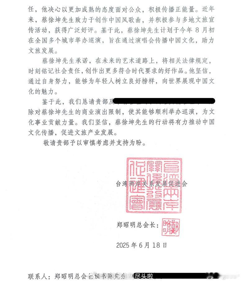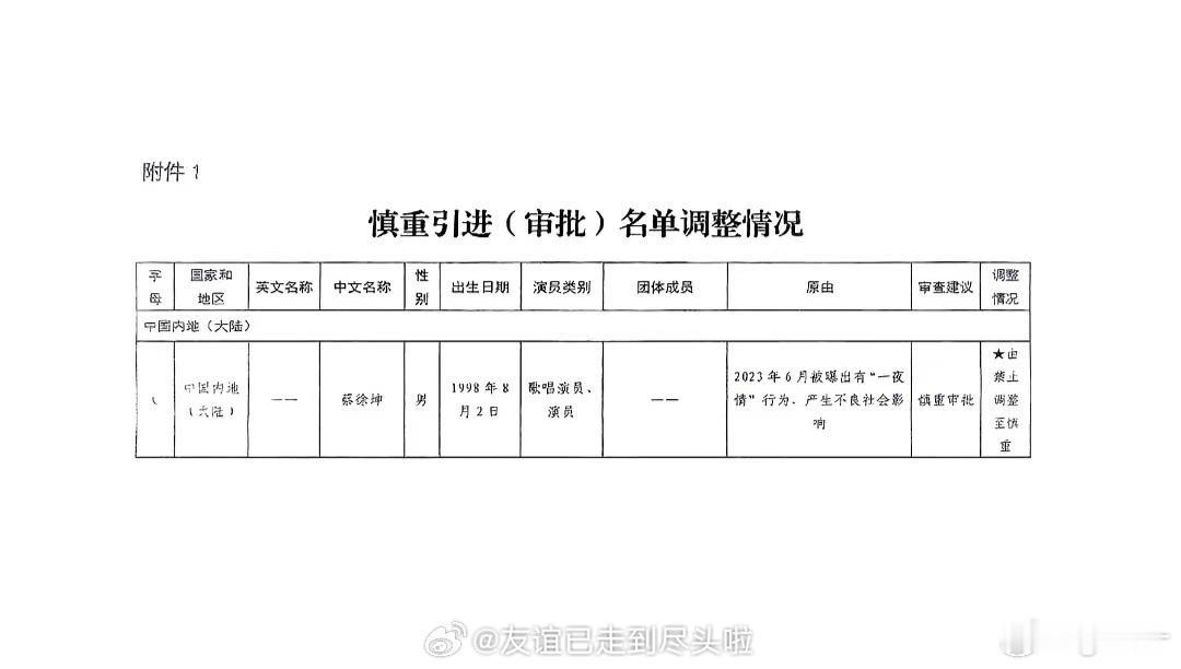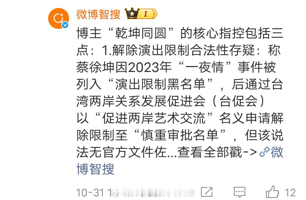 博主乾坤同圆爆料,经过蔡徐坤团队的运作,把蔡徐坤从演出限制的黑名单上转移到了慎重审批的名单上,有条件的放宽了对蔡徐坤演出的限制[思考][思考][思考]