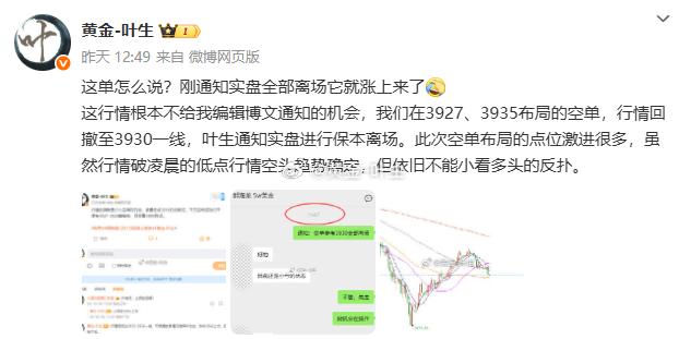 [星星]第一单:黄金3927、3935空单,离场3930,保本离场