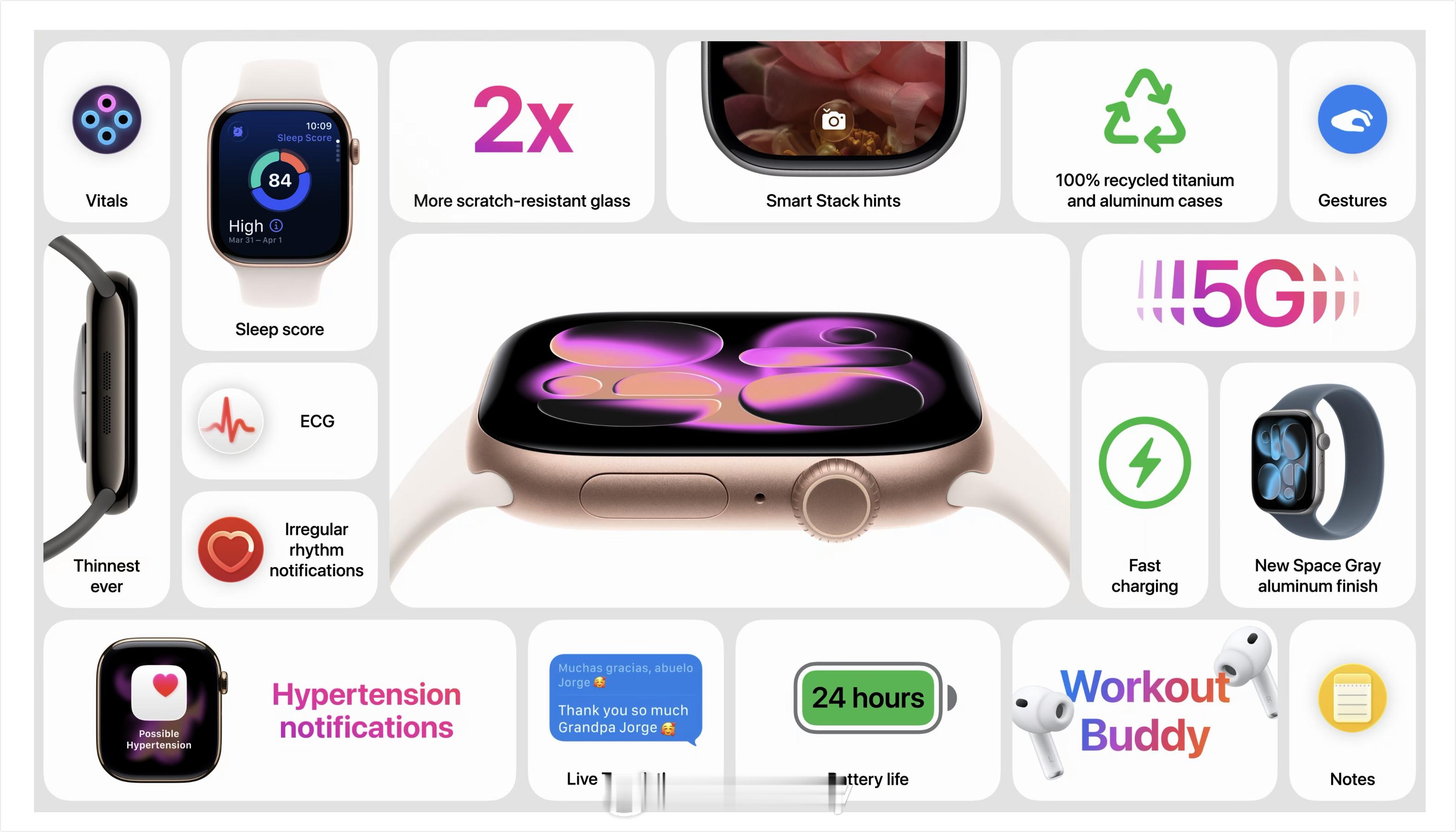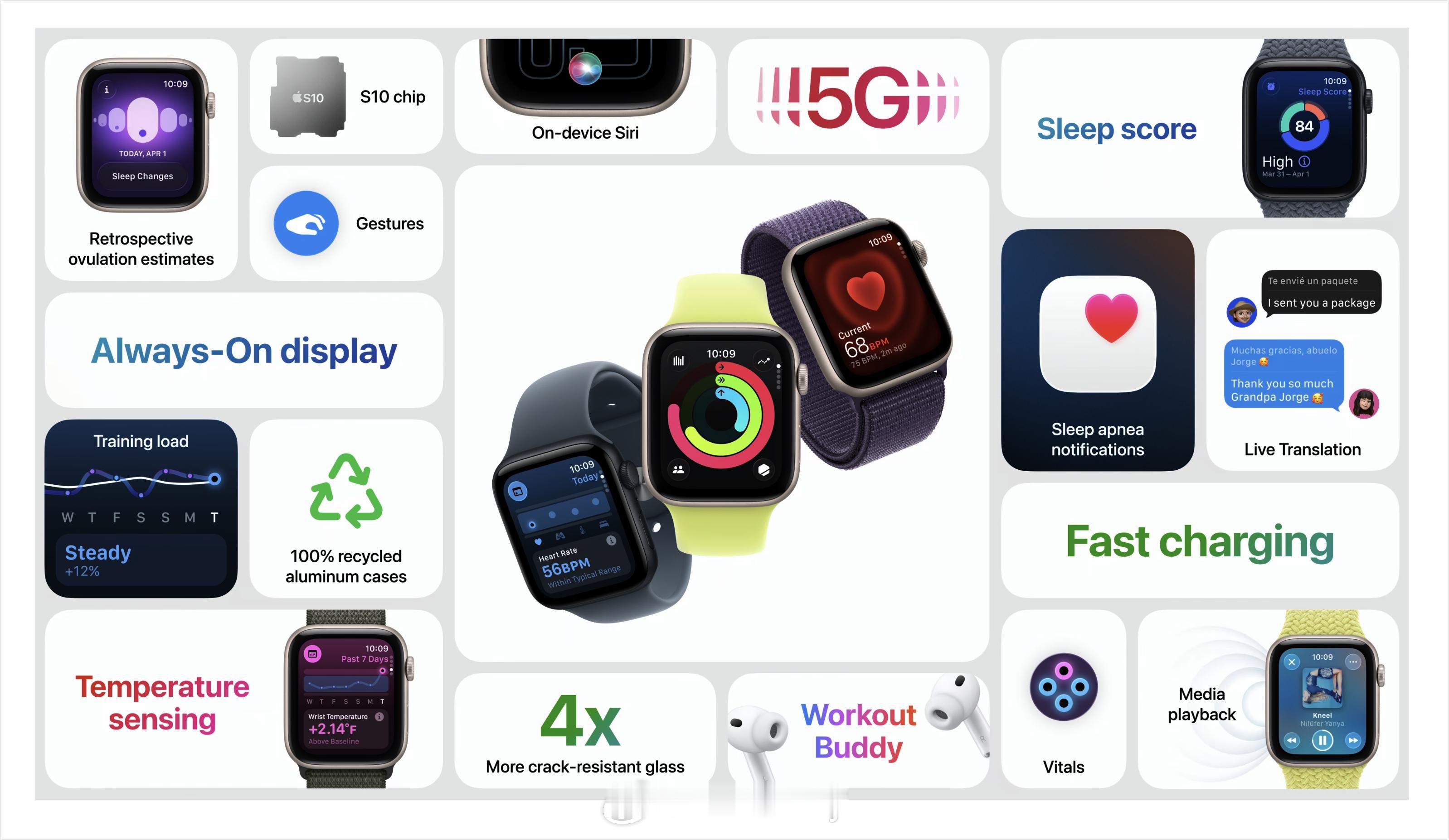 各种重要新功能,超值集合。现在支持睡眠评分,通过生命体征 app 洞悉更多健康指标。还配备全天候显示屏,让你一眼速览各类信息。
