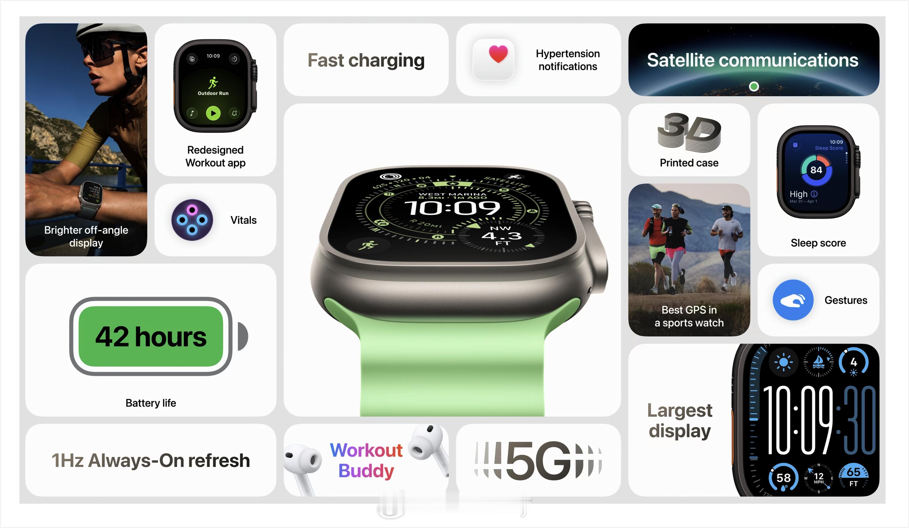 专攻运动与户外挑战,硬实力再突破。电池续航以天计,配备迄今最大最亮的 Apple Watch 显示屏,带来众多进阶指标,具备 5G 功能以及双频 GPS。