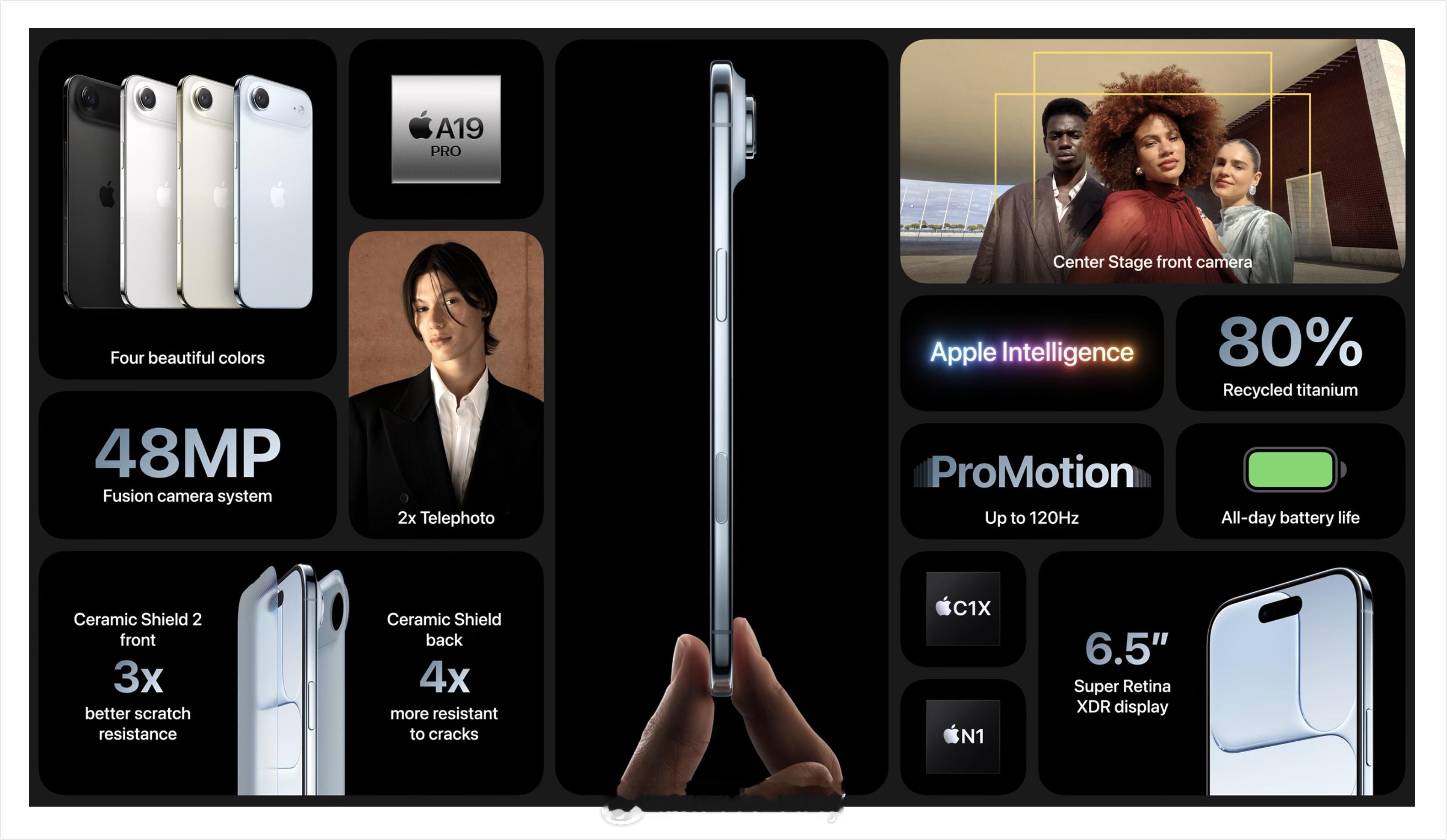 迄今最薄 iPhone,身藏高能内核。耐用性创 iPhone 新高,配备我们迄今最出色的显示屏,并由超瓷晶面板 2 正面守护。强悍的 A19 Pro 芯片,采用第三代 3 纳米制程。还有先进的 4800 万像素融合式摄像头系统,以及全新 Center Stage 前置摄像头。