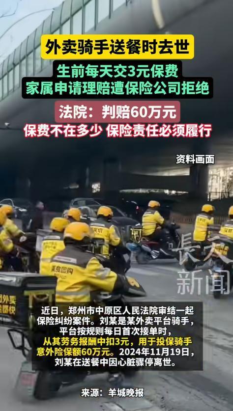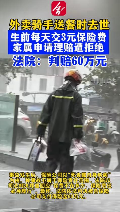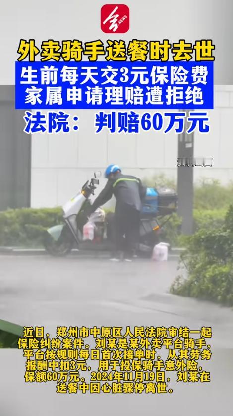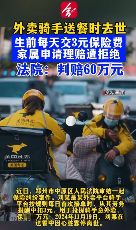 这次保险公司输了!2024年,郑州,一名外卖骑手送餐时去世,每天交3元保险费,却遭保险公司拒赔!而法院的判决,大快人心!法院:赔60万!网友:不但要理赔,还要加倍赔偿,不然他们不知道疼,只收钱不赔偿! 2024年11月19日,外卖骑手刘岩(化名)在取餐时突然倒地不起,当时商家和路人都吓坏了,赶紧打120送医院抢救,可惜的是抢救了两个多小时,人还是没能救回来,医生诊断是心脏骤停。 刘岩今年才40多岁上有老下有小,全家就指望他一个人挣钱养家,他是去年7月份失业后才开始跑外卖的,每天风里来雨里去,就为了多挣点钱贴补家用。 按照外卖平台的规定骑手每天接第一单时,系统会自动扣3块钱买意外险保额60万,刘岩从来没落下过,他觉得这是给家人的一份保障。谁知道真出事了保险公司却不认账。 保险公司的理由听起来挺专业,刘岩有冠心病这属于自身疾病导致的死亡,不在意外险赔付范围内,家属听了这话都懵了,刘岩平时身体挺好的,怎么就成了有病史的人了? 更让人气愤的是,保险公司拿不出任何证据证明刘岩有既往病史,投保的时候也没问过健康状况,现在出事了就说人家有病,这不是耍赖吗。 刘岩的父亲、儿子和女儿找保险公司协商了好几次,每次都被各种理由搪塞,最后实在没办法只能把保险公司告上法庭。 郑州市中原区人法院审理这个案子时,发现了几个关键问题,首先保险公司没有证据证明他们向刘岩说明过免责条款,保险公司说刘岩有病史,但拿不出任何医疗记录或体检报告,最重要的是保险公司在收保费的时候,根本没有询问过刘岩的健康状况。 法官认为保险公司作为专业机构,有责任在承保前了解投保人的健康状况,现在出了事才说人家有病,又拿不出证据,这种做法站不住脚,最终判决保险公司必须赔付60万元保险金。 这个判决一出来网友们都拍手叫好,有网友评论道:不但要理赔,还要加倍赔偿,不然他们不知道疼,只收钱不赔偿。 有网友给保险公司算了一笔账:全国500万外卖骑手,每人每天交3块钱,一天就是1500万,一个月4.5亿,一年下来超过50亿,这么大一笔保费保险公司收得倒是挺痛快,真要赔钱的时候就开始找各种理由推脱。 还有网友指出外卖平台在这件事上也有责任,保费是平台代扣的,骑手是在为平台工作时出的事,平台应该站出来帮骑手维权,而不是让家属自己去跟保险公司扯皮。 这个案子反映出问题值得深思,外卖骑手本来就是高风险职业,每天在路上跑,交通事故、意外伤害的概率都比普通人高,他们交保费就是图个心安,万一出事了家里还有个保障,结果保险公司这么一搞,谁还敢相信保险? 好在法院这次判给了保险公司一个教训,法律面前任何霸王条款都站不住脚,保险公司想赚钱可以理解,但不能只想着收保费,真要理赔的时候就耍赖,这种做法不仅违背商业道德,更是触犯了法律底线。 对于千千万万的卖骑手来说这个判决意义重大,它告诉大家只要占理就不要怕维权,保险公司再大也大不过法律,同时也提醒保险公司做生意要讲诚信别把消费者当傻子。 麻烦看官老爷们右上角点击一下“关注”,既方便您进行讨论和分享,又能给您带来不一样的参与感,感谢您的支持!