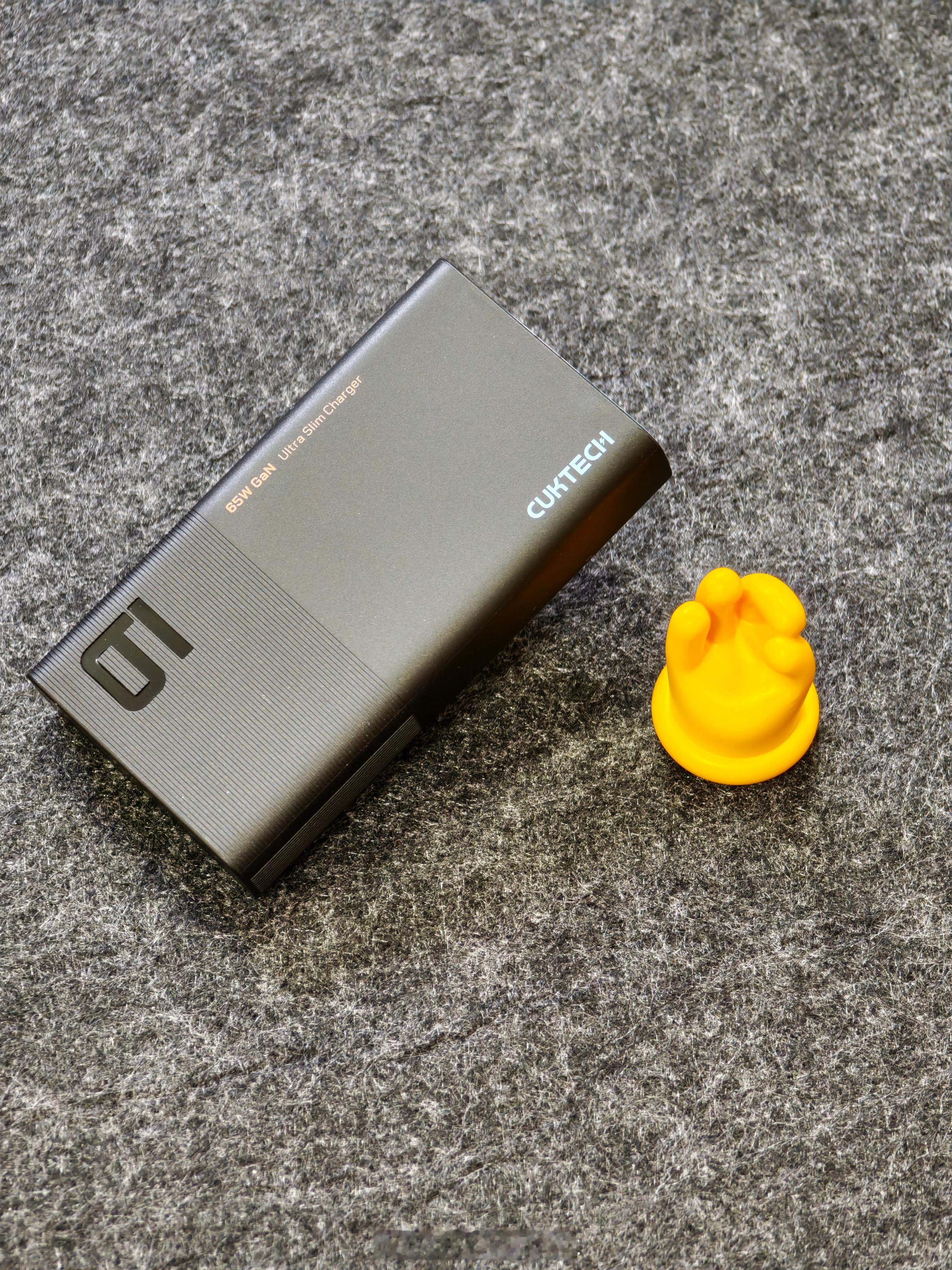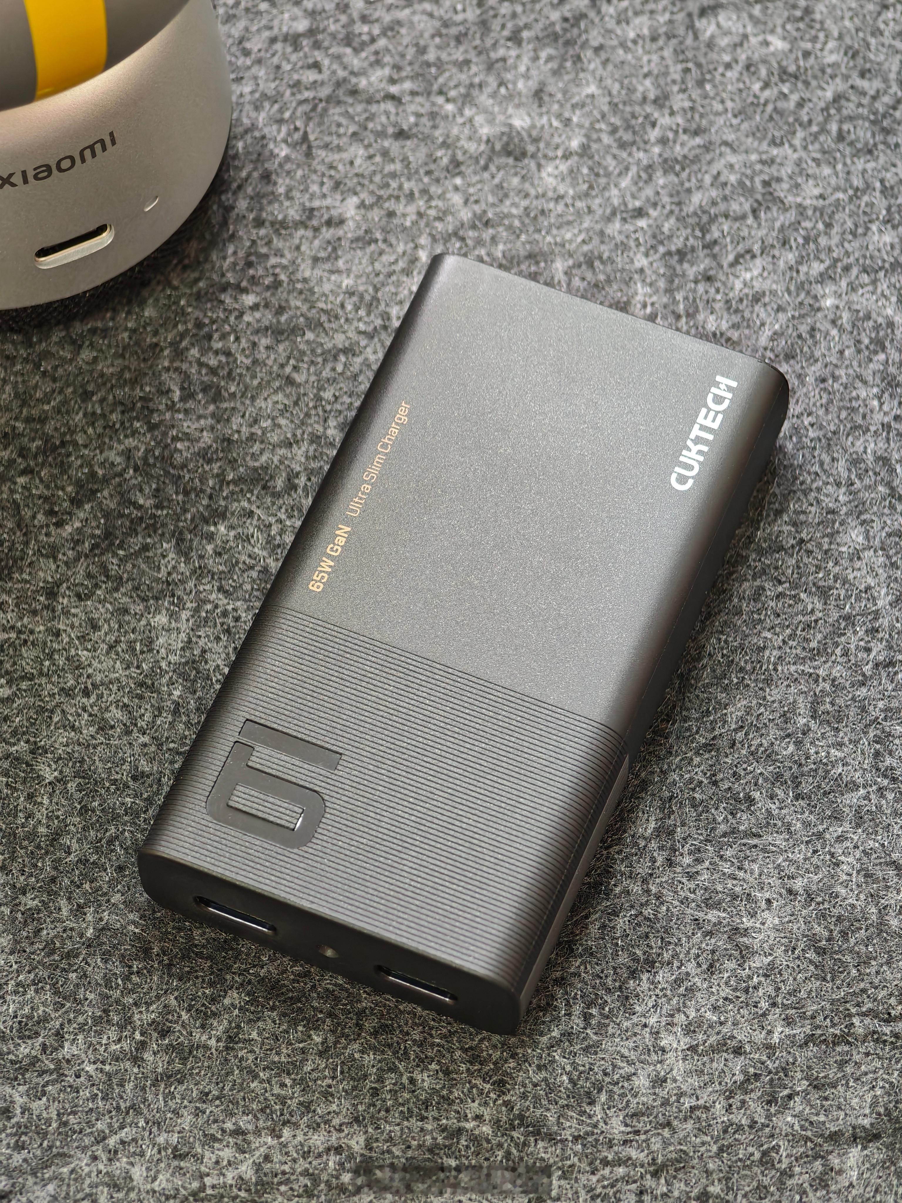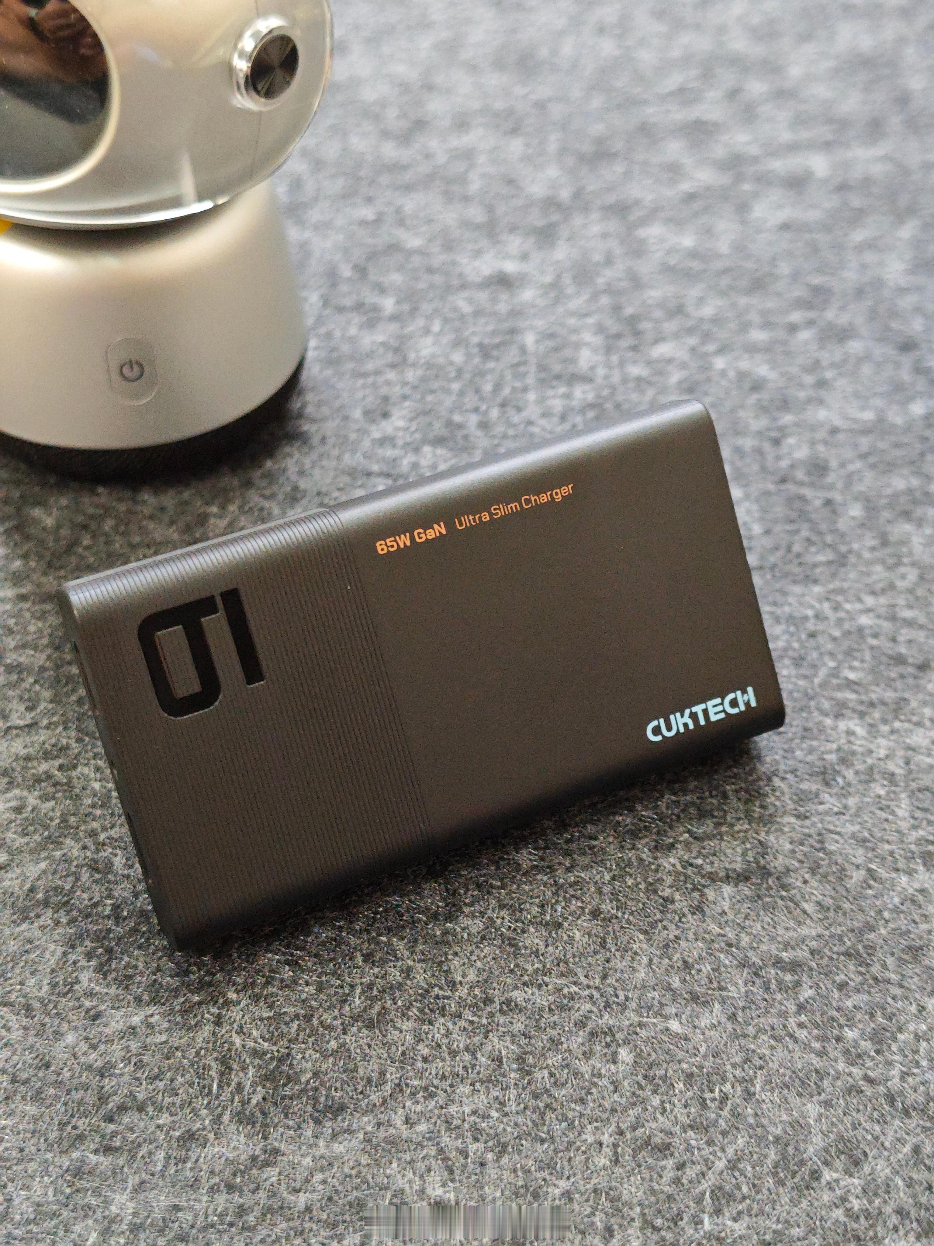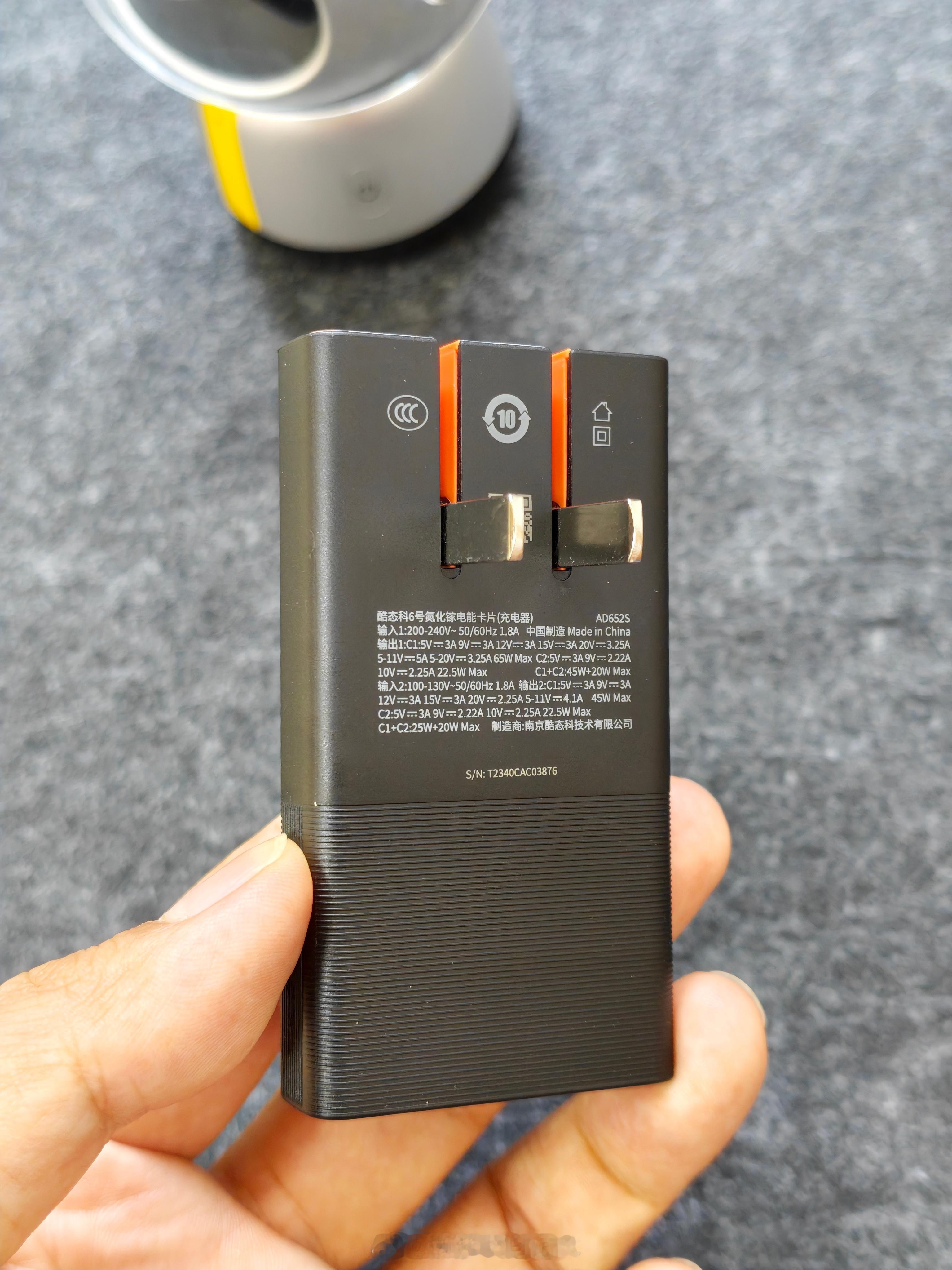 非常小巧,比常规65W充电头体积缩小约41%,薄如卡片的机身,可折叠插脚,仅83g的重量,方便携带,出行零负担。