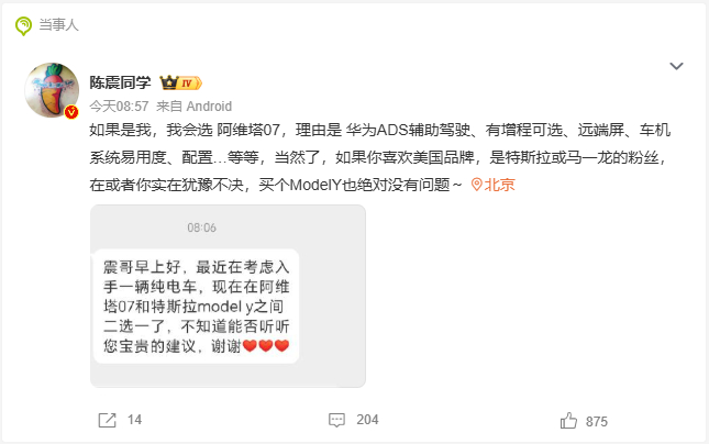 前两天是陈震回应Model3和SU7哪个更好开 今天是陈震回应阿维塔07和ModelY二选一,这种真是纯主观的看法,没有什么绝对,我每日杭绍通勤2小时,已开7万公里,其实特斯拉挺不错的,驾驶质感我个人觉得特斯拉更好[老师好]