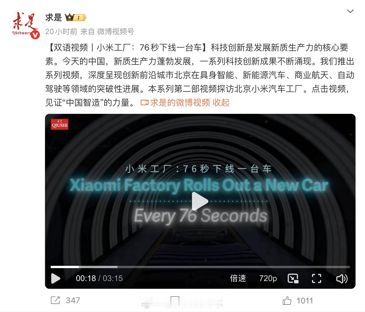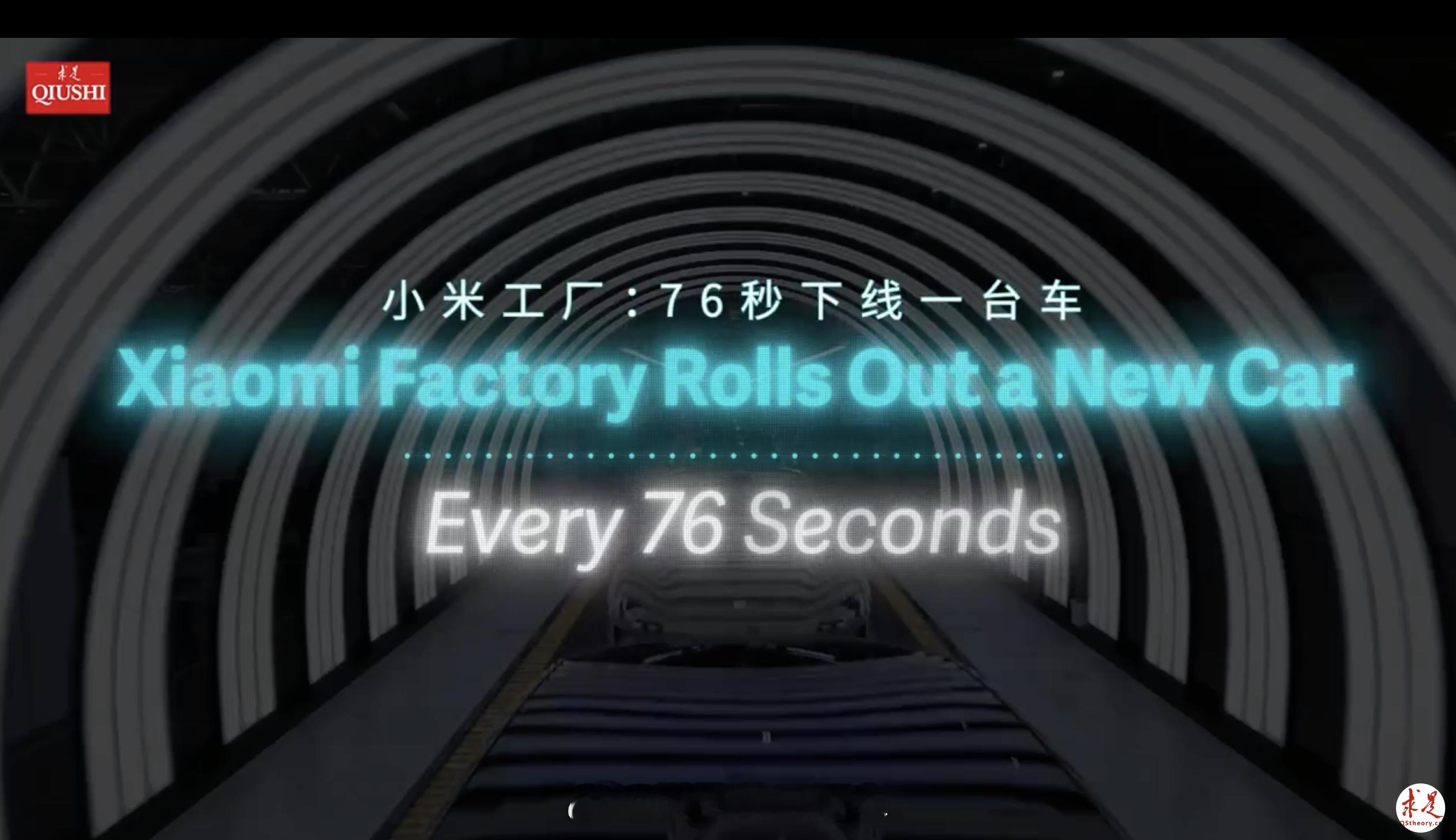 这段“求是”发表的视频中介绍了在小米汽车工厂中每76秒就有一台新车下线。