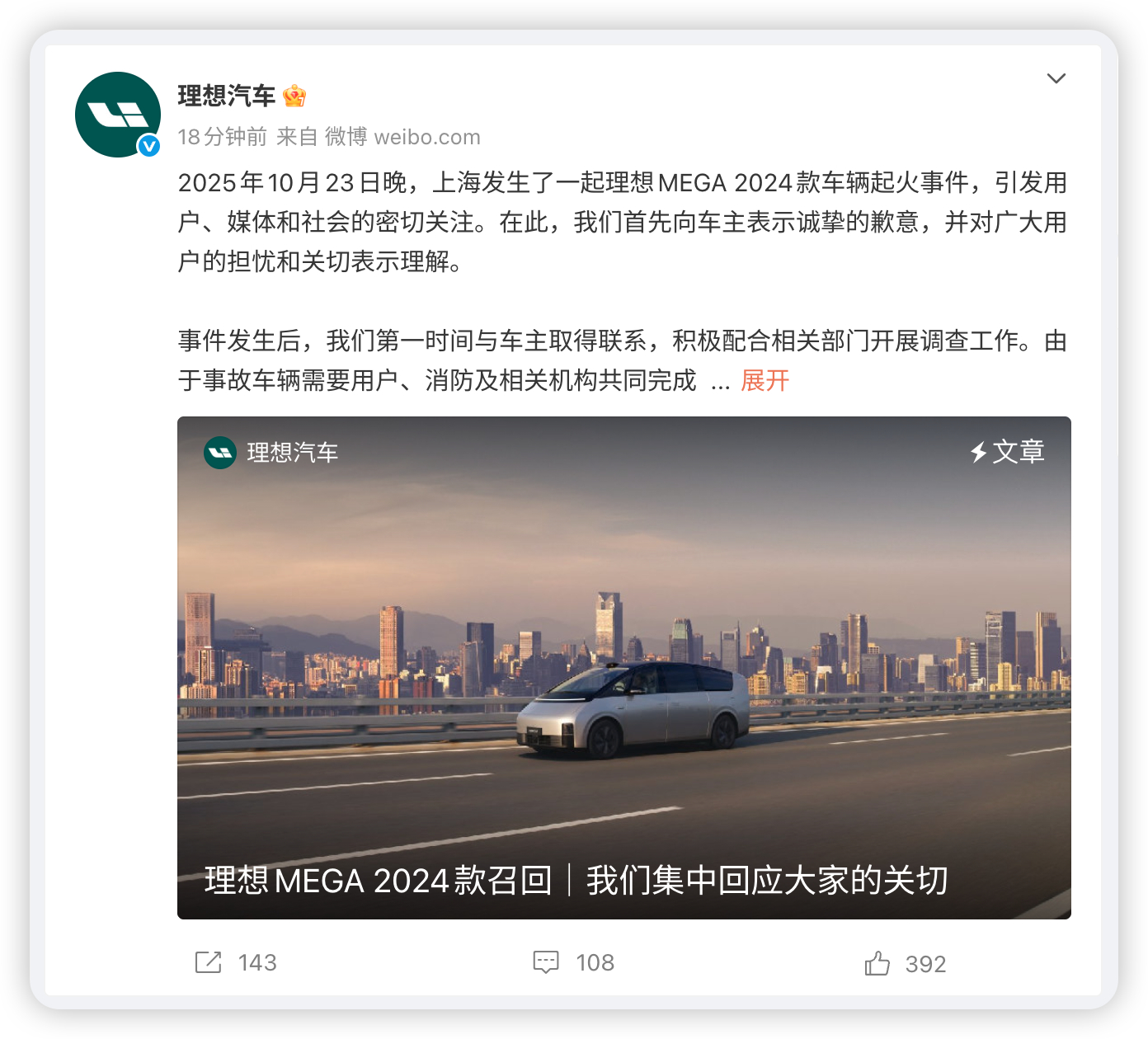 理想回应MEGA2024款召回 确定问题以后,理想已经向国家市场监管总局备案召回,对这个批次的理想 MEGA,免费更换冷却液、动力电池、前电机控制器,并且会延长相关部件保修至 10 年或 20 万公里。理想就车辆起火道歉