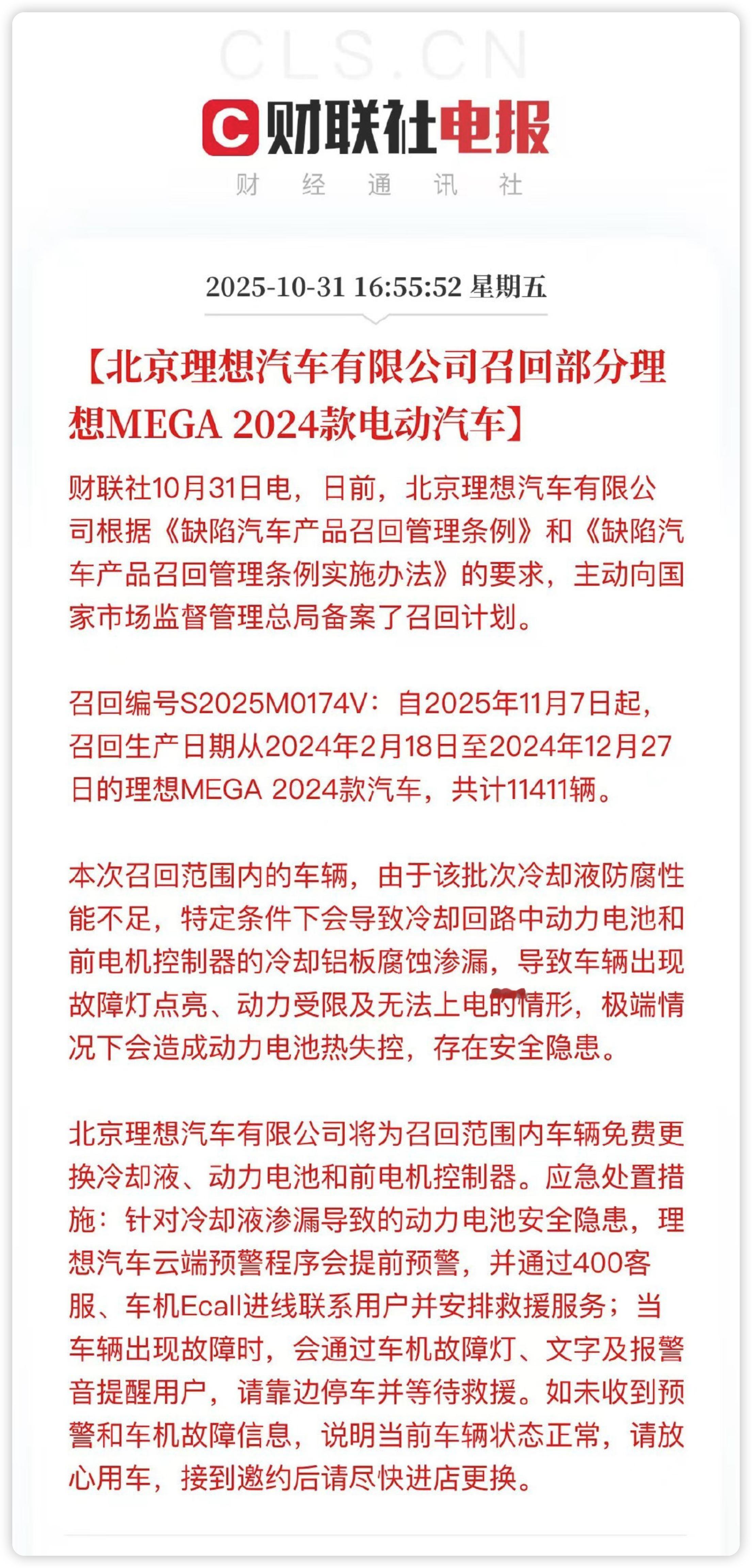 前阵子有一辆理想 MEGA 行驶中突然起火,发生这个事情后,理想第一时间启动了内部分析,发现这个批次的 MEGA (2024年2月18日至12月27日期间生产,共计 11,411 辆)会因为冷却液防腐性能不足,在特定条件下可能导致动力电池和前电机控制器冷却铝板腐蚀渗漏,从而引发故障或热失控隐患。